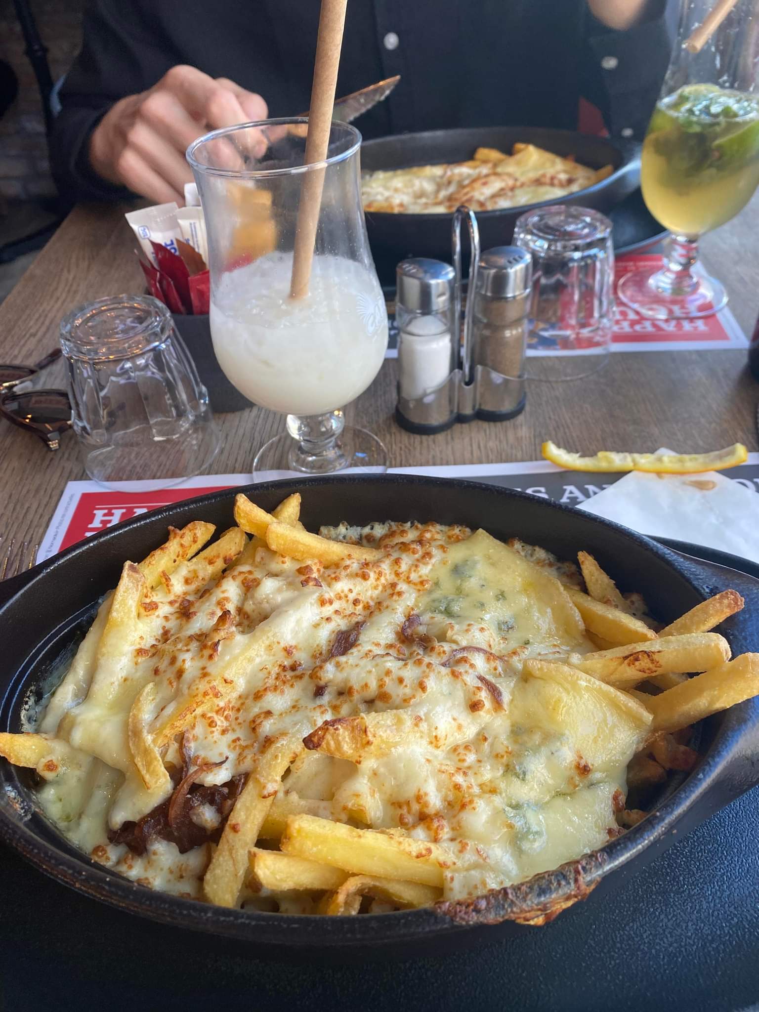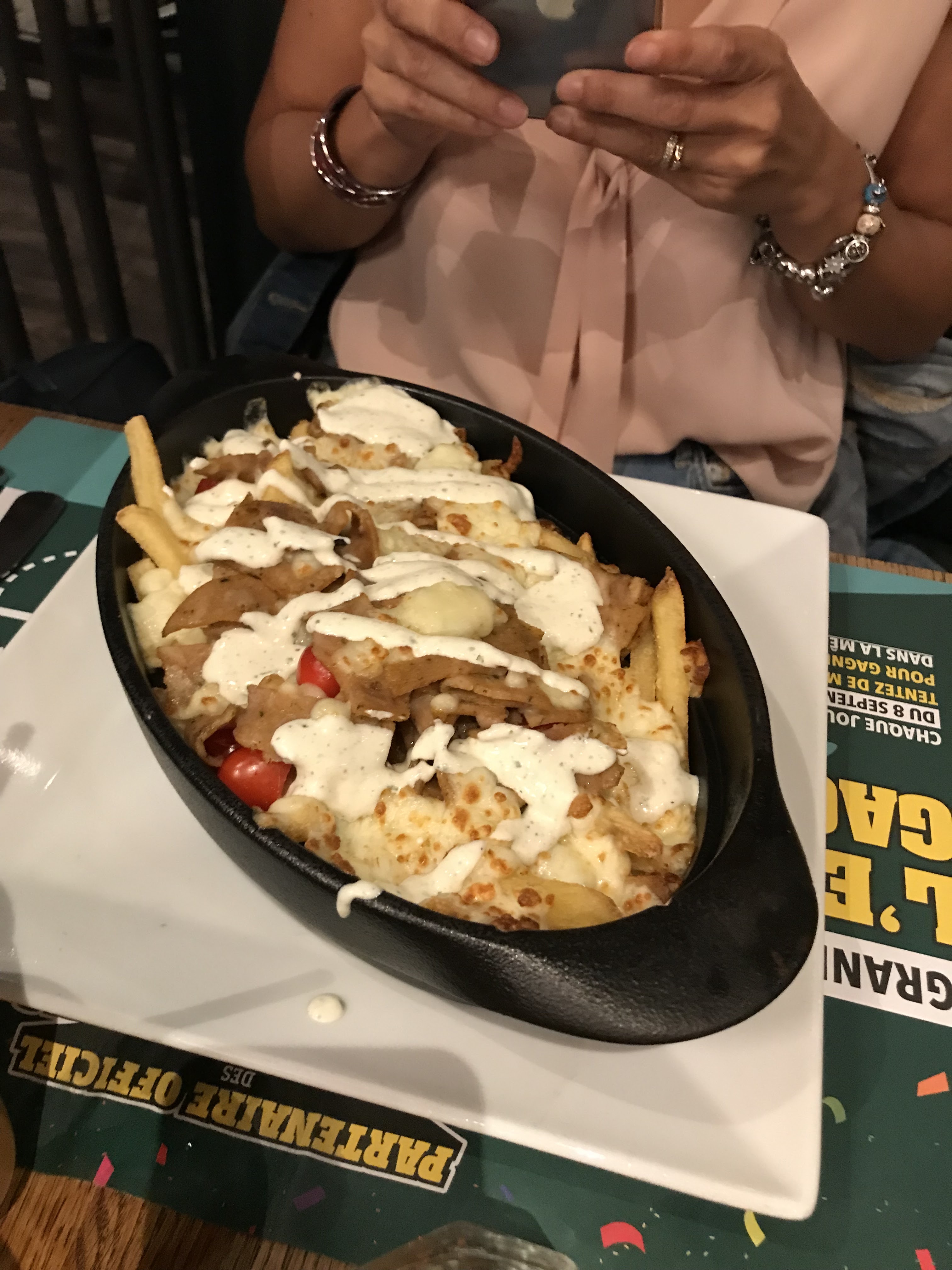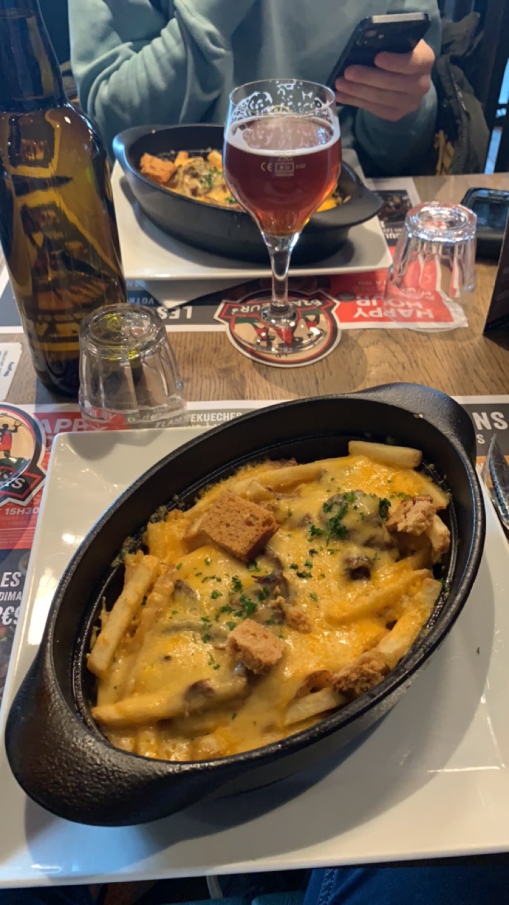 Lieu plutôt sympa, poutine super 👌👌 mais, il y a un très gros MAIS flammenkuche manque de saveur dans la viande. Les serveurs il faut leurs apporter une formation adéquat, leur expliquer comment s'occuper d'un rang et du suivie de ces commandes et comment bien prendre une commande et relire la commande avec le client pour ne rien oublier. Mais également même si on est un ancien serveur, on reste pas au bar les bras croisés à parler, 10minutes que j'ai fixé mon mocktail des yeux au bar, 10minutes que le barman pousse le cocktail au bord du bar avec le bon de commande en évidence, 3 fois qu'ils sont passé devant sans regarder le verre.... Obligé d'interpeller notre serveur (très certainement nouveau) pour lui demander la boisson qui attendais depuis maintenant 15minutes au bar, la moitié du verre remplie de glaçon n'a pas encore fondue je vous rassure... Enfin bref, équipe à reformer et remotiver. Photo des serveurs au bras croisé en question.