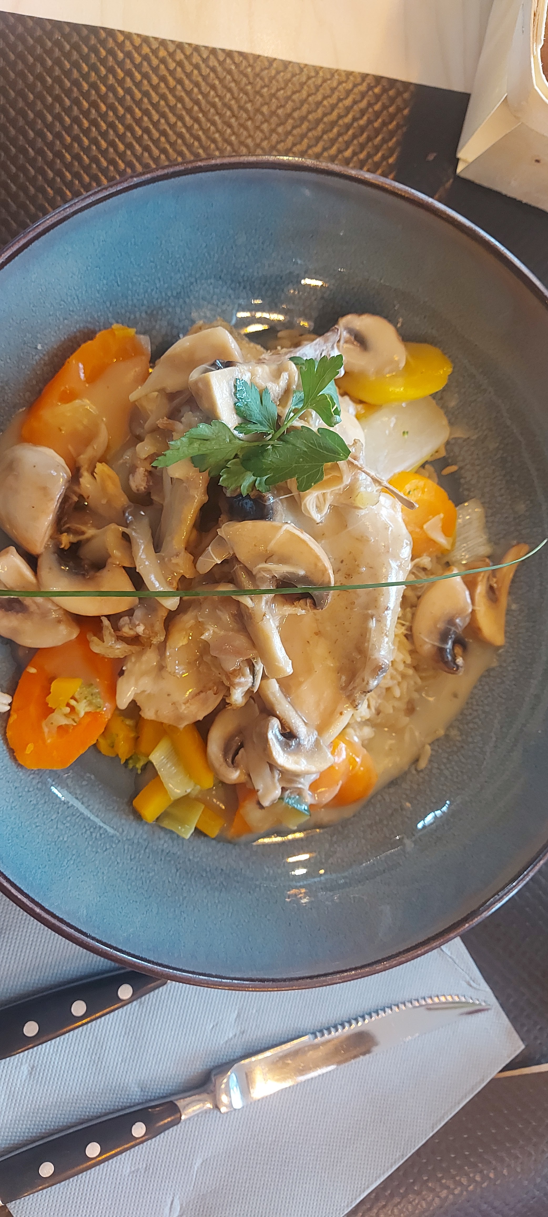 Les plats sont confectionnés avec des produits frais. Belle présentation des assiettes avec viandes et légumes variés, bien cuisinés et goûts fins... Plats très gourmands. Desserts à tomber par terre 😊