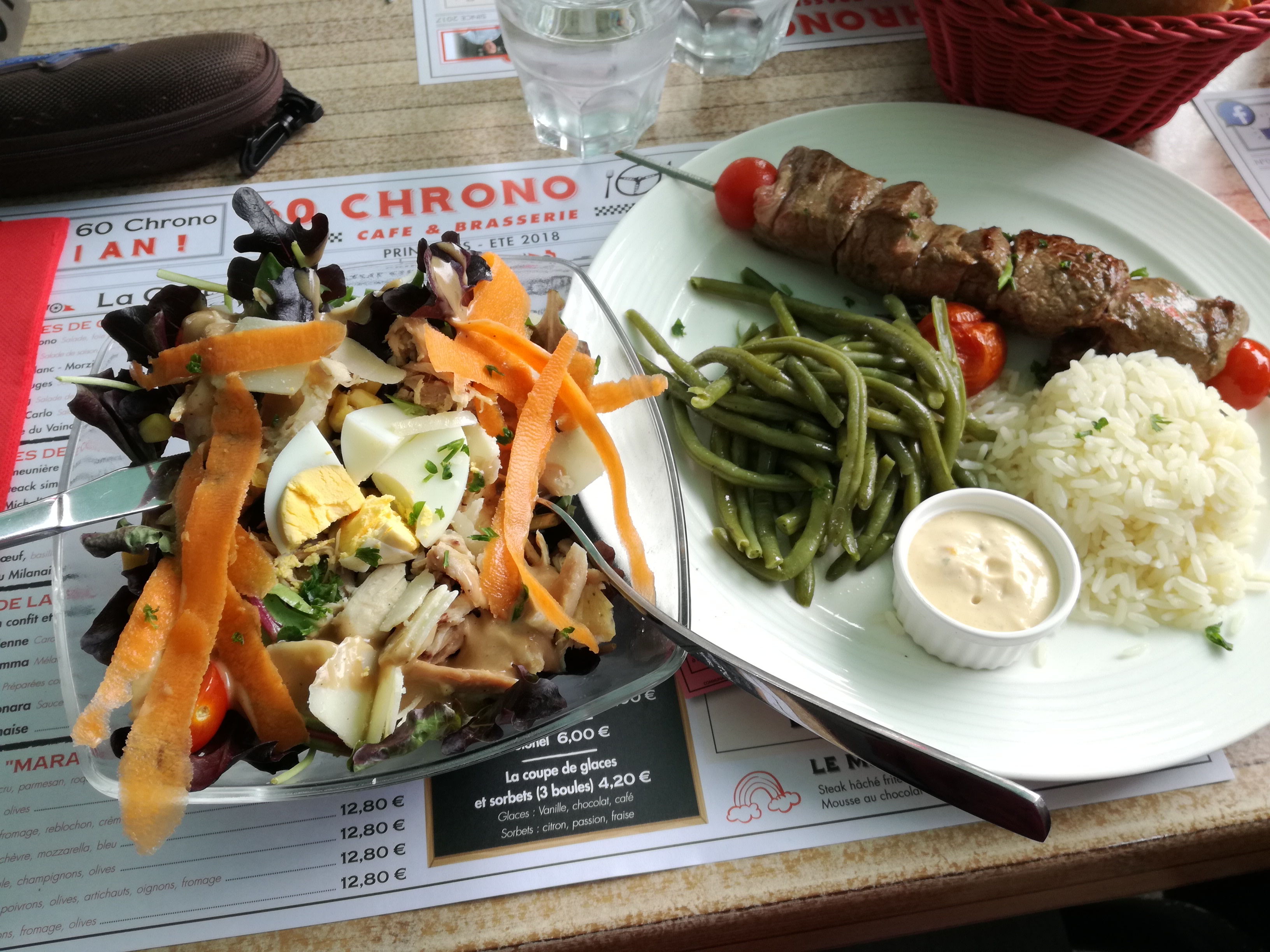 Très bonne nourriture (salade César et brochettes de bœuf) les plats sont copieux et goûteux la terrasse est agréable pas trop bruyante et le prix très serré 😎 le service en 60 min chrono est rarement assuré prévoir plutôt 1h15