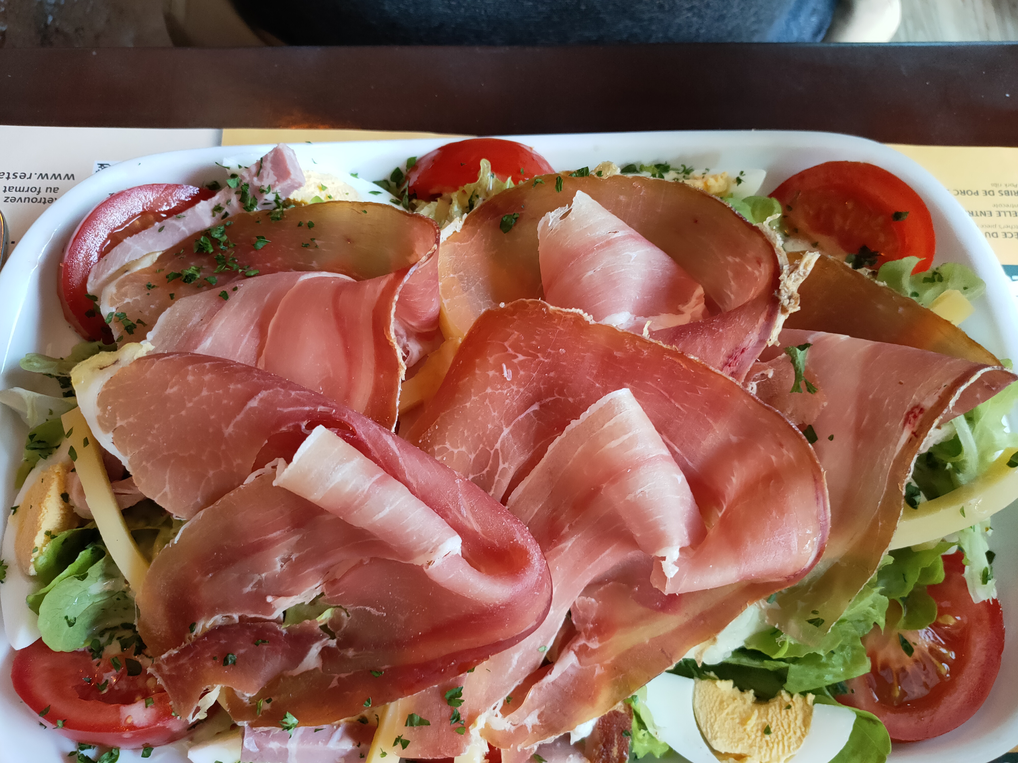 Acceuil classique. Bon présentiment qui tourne au fiasco. Comme vous le voyez sur la photo de la salade ( je suis végétarien donc pas pris le jambon cru MAIS QUAND MÊME ) 13 euros pour 8 feuilles de salades, 3 tomates séchées et une pauvre rondelle de chèvre, dans une feuille de bricks qui laisse un arrière goût salé. Quant à l'escalope, elle laisse chez ma compagne, une note plutôt mitigée, se sentant chanceuse de son sort qui fut plus positif que le mien. L'escalope fut bonne ( gratinée ) et les pâtes relativement classiques, pour 18 euros c'est du vol manifeste mais cette dernière était pas mal quand même. Note à vous si vous comptez y aller. Il faut demander le pain vous-même, de même pour les condiments, et si vous les souhaitez, la même chose pour la carafe. Nous nous sommes installé sur une table en veranda ouverte. Bien que le restaurant n'y puisse rien, la présente d'autant de mouches est une nuisance pour un palais déjà peu satisfait. Essayez d'aller ailleurs. À éviter.