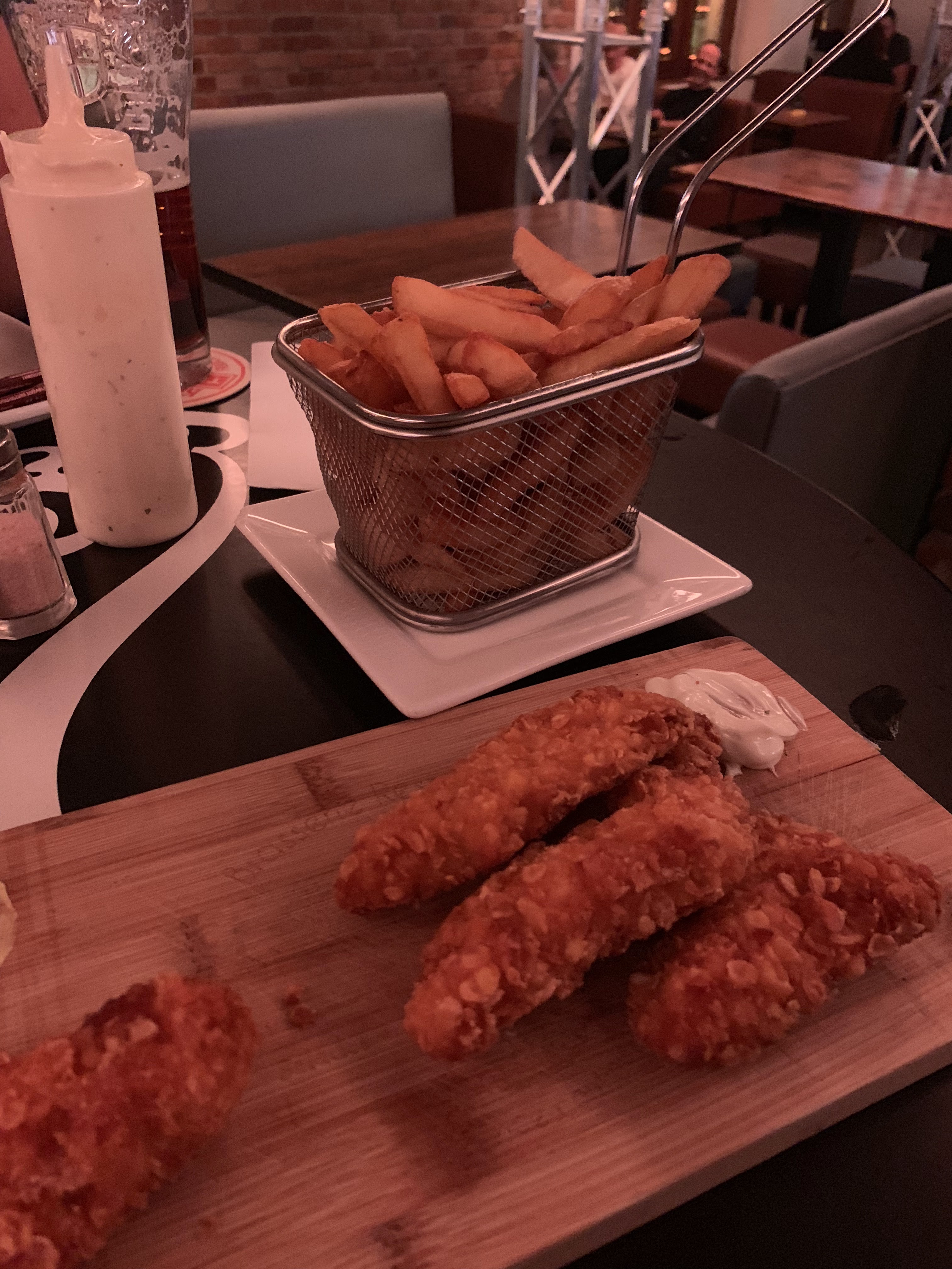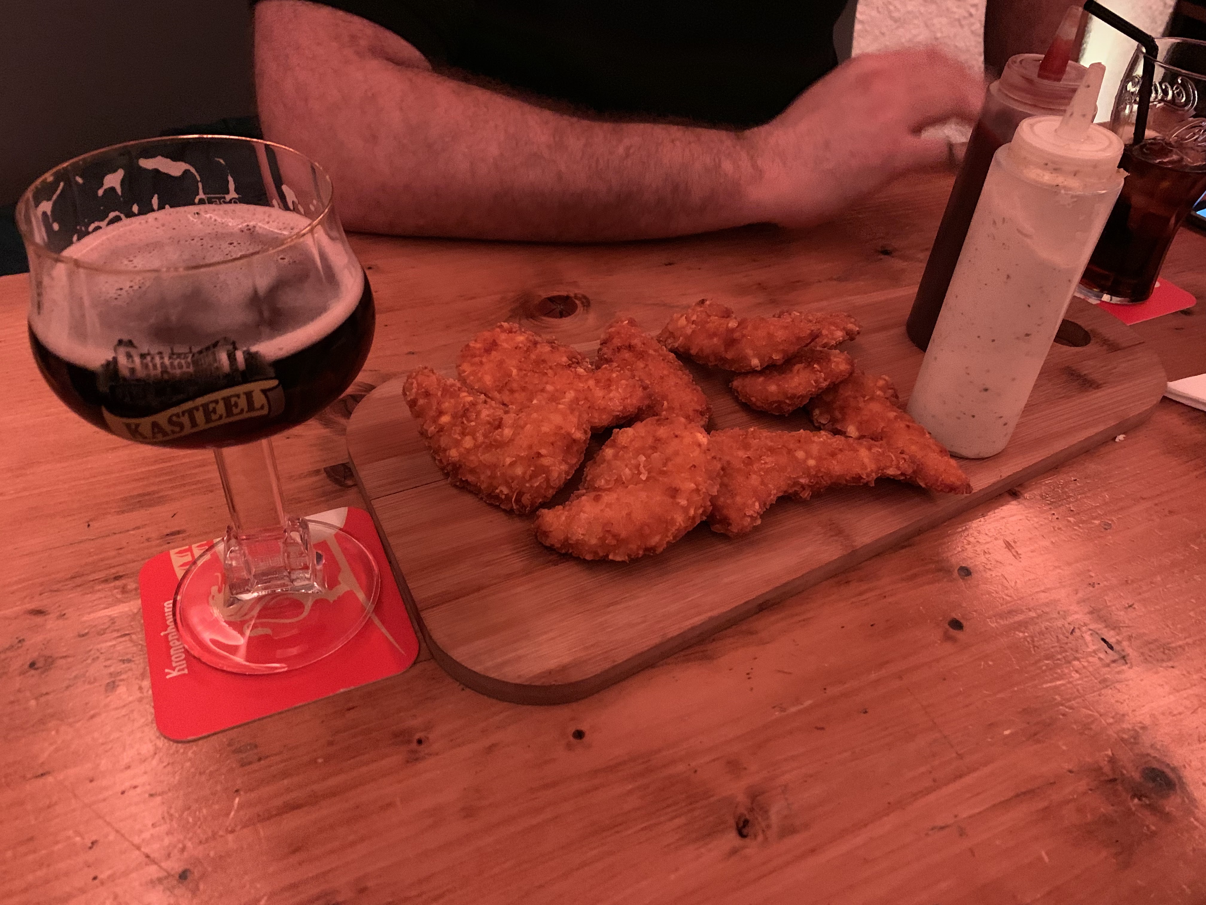 Quoi de mieux qu'une pinte de bière, un match de rugby de bons copains et le poulet pané de la carte ! Un régal !