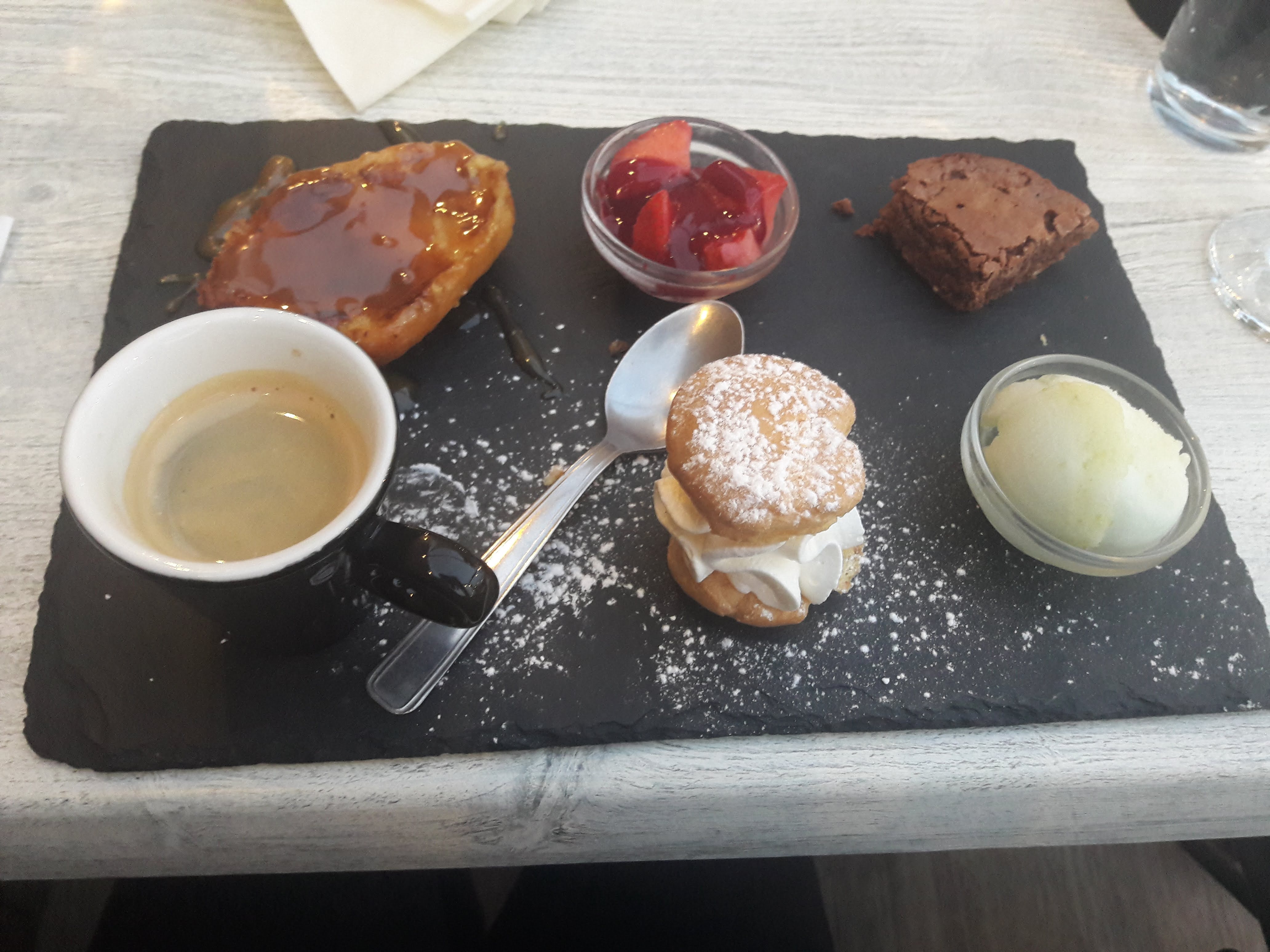 Nous y sommes allé le soir. Nous avons pris un plat et un dessert. Il n y avait pas trop de monde et nous avons trouvé qu il y avait de l attente. Un peu dommage. Mais les plats étaient joliement présentés et en quantité suffisante. Pour le dessert, nous avons juste trouvé cela dommage que ce soit pas assez chaud. Pour ma crêpe poire chocolat j ai été un peu déçu mais cela restait très bon. Pour la brioche perdu c était bon mais tiède.