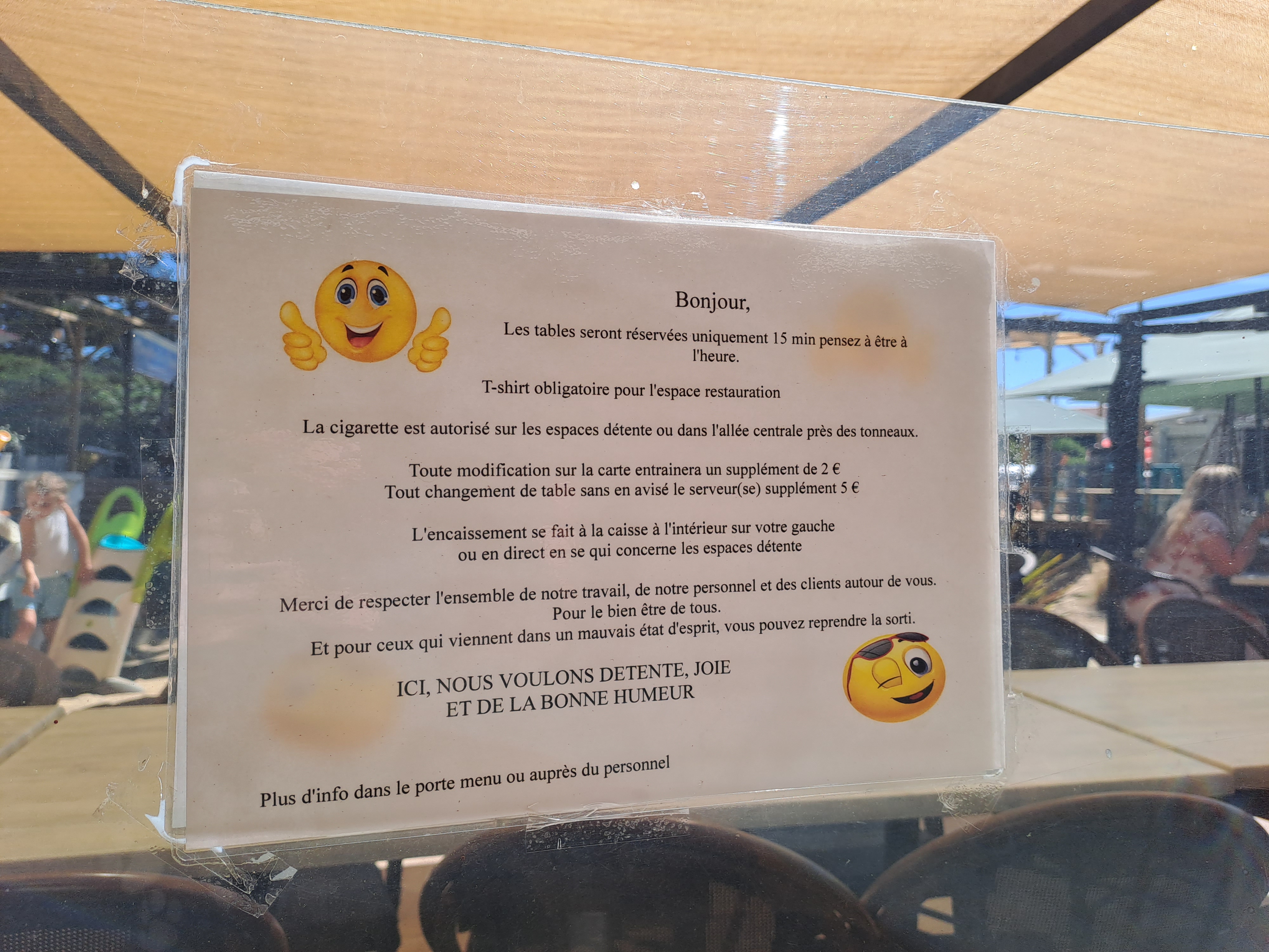 A notre arrivée pour prendre un verre, nous entendons la serveuse préciser aux clients juste devant nous qu'il n'y a plus de place pour dîner sans réservation. Ces clients font demi-tour. Nous étions juste derrière. Au lieu de nous demander ce que nous voulions, la serveuse ne prend Même pas la peine de nous saluer et tourne les talons sans nous regarder. Nous la rappelons donc pour lui demander si nous pouvons juste prendre un verre. Elle nous montre une table non débarrassée puis disparaît. Nous attendons 20 minutes face aux verres et cigarettes des clients précédents. Nous interpelons donc la serveuse qui sans nous regarder crie un j'arrive!. Nouvelle attente 10 min. Nous appelons 1 autre serveuse qui nous fait encore patienter un peu et qui enfin débarrasse notre table et prend notre commande sans un bonjour, sans un sourire. Les bières étaient fraîches mais elles se sont longuement réchauffées le temps d'aller payer à l'intérieur (file d'attente) car visiblement dans cet établissement, on n'encaisse pas les CB en terrasse...Dans ces conditions, difficile aux esprits fébriles de se detendre dans cette Atmosphère. A notre droite, une grande tablée avec enfants. Lassés d'attendre la serveuse pour recommander, les adultes se levaient constamment pour quémander ce qui n'était pas servi, et par ailleurs, de nombreuses autres tablées en attente. Le propre du restaurateur n'est-il pas de gérer les flux de clients avec sourire et professionnalisme ? Le décor et un bon emplacement ne suffisent pas, il faut y ajouter une vrai atmosphère ! Cordialement.