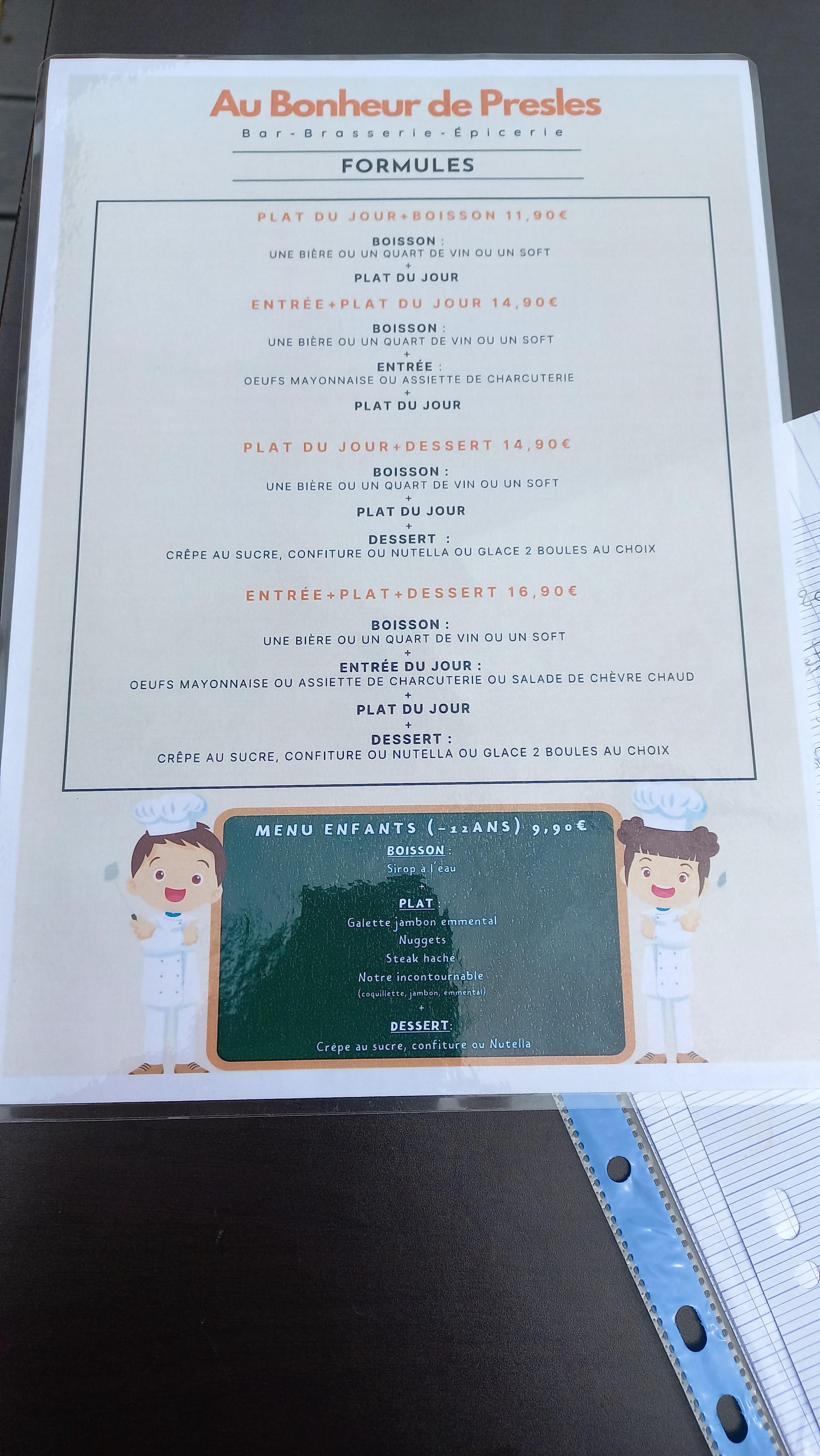 Une petite pause bien mérité,en ce jour,du 21 mai 2024,je vous suggère de vous arrêter au restaurant, au BONHEUR DE PRELES.Avec un menu,a 16 euros 90. Et une variété de différents produits simple comme une ancienne brasserie. La salle comprend une trentaine,de couverts et bien sur le patron et son personnel, vous attend ainsi que le soleil,pour vous servir en terrasse. Alorsn hésiter plus pour passer un bon moment.