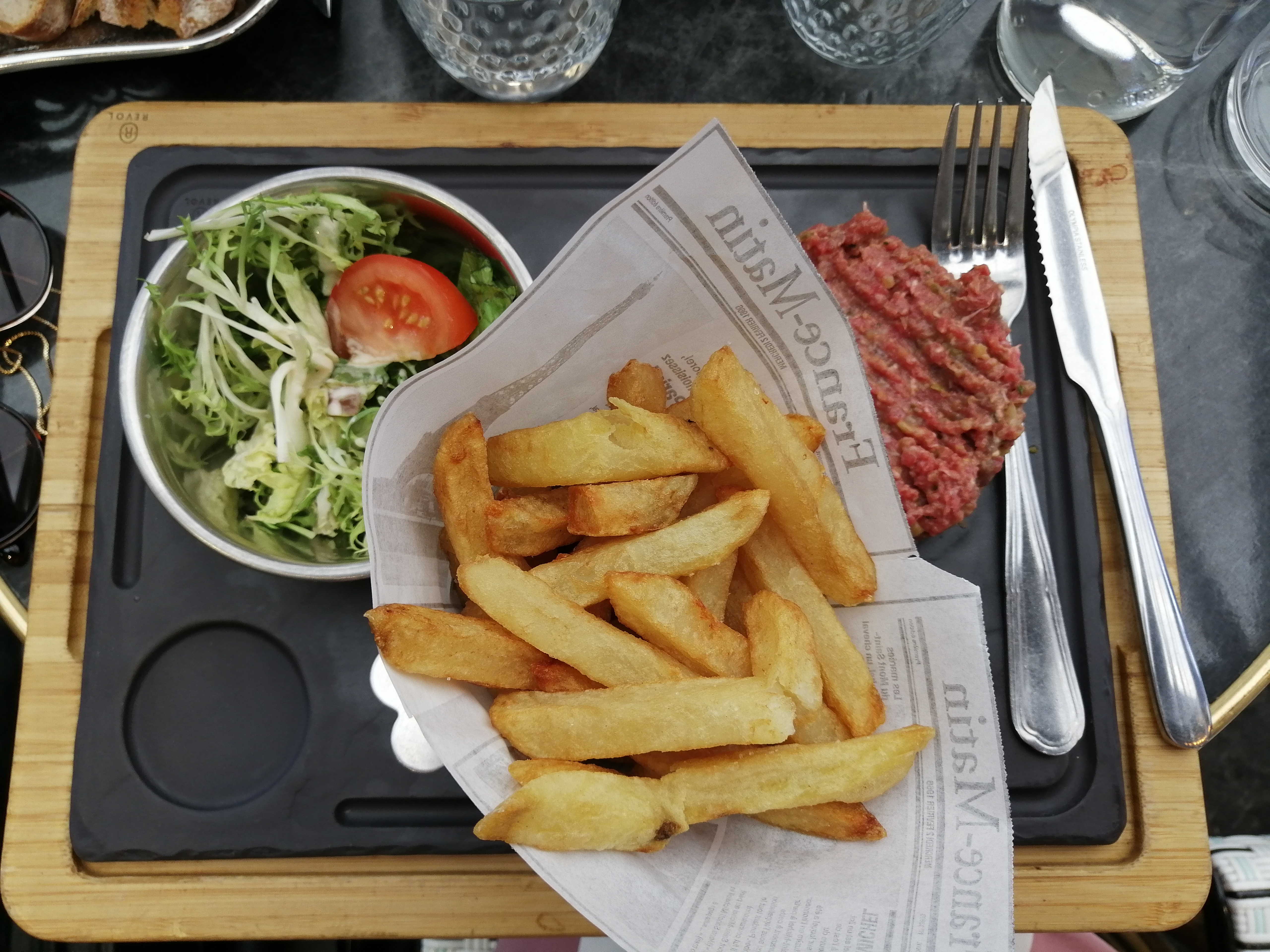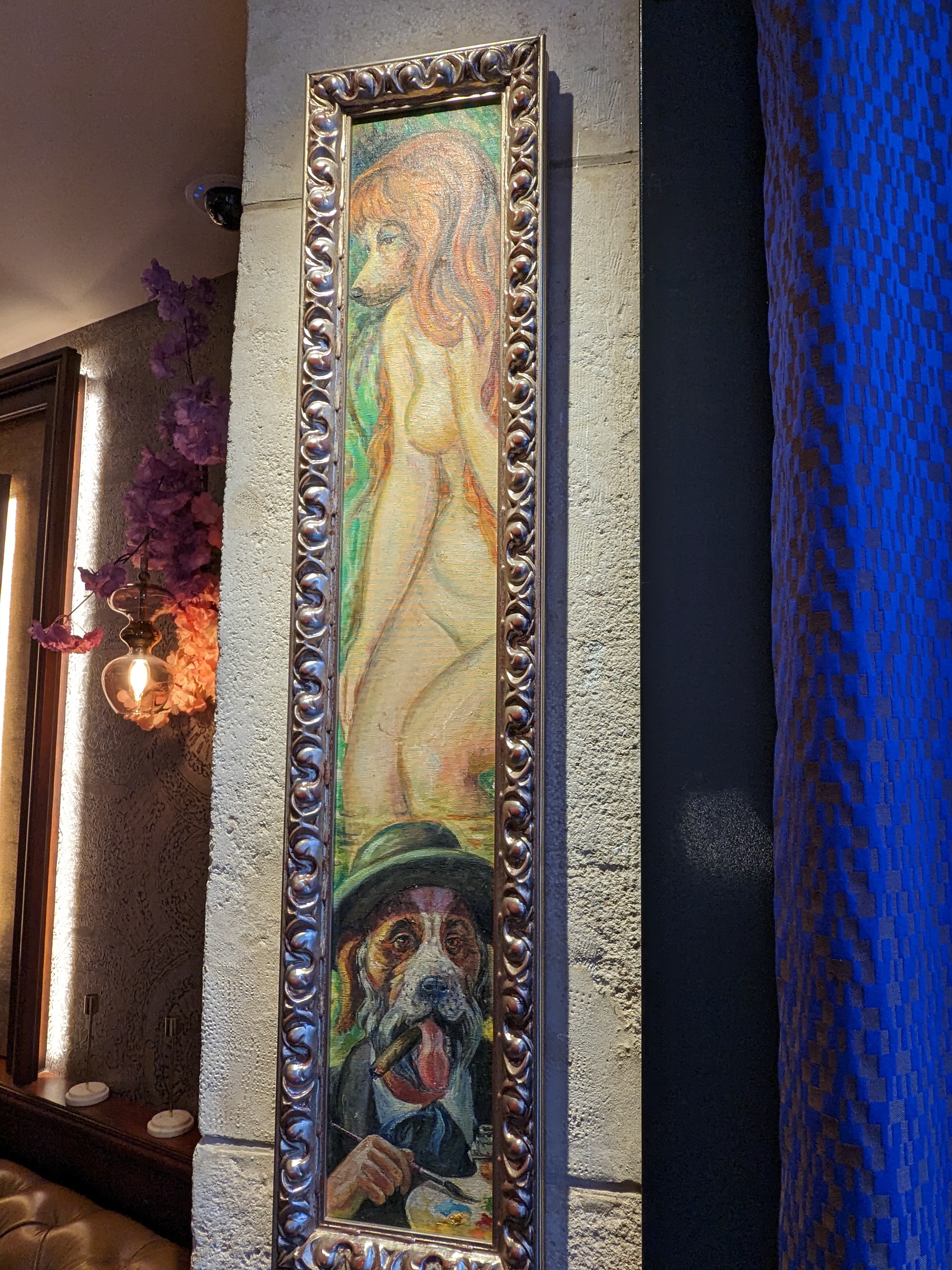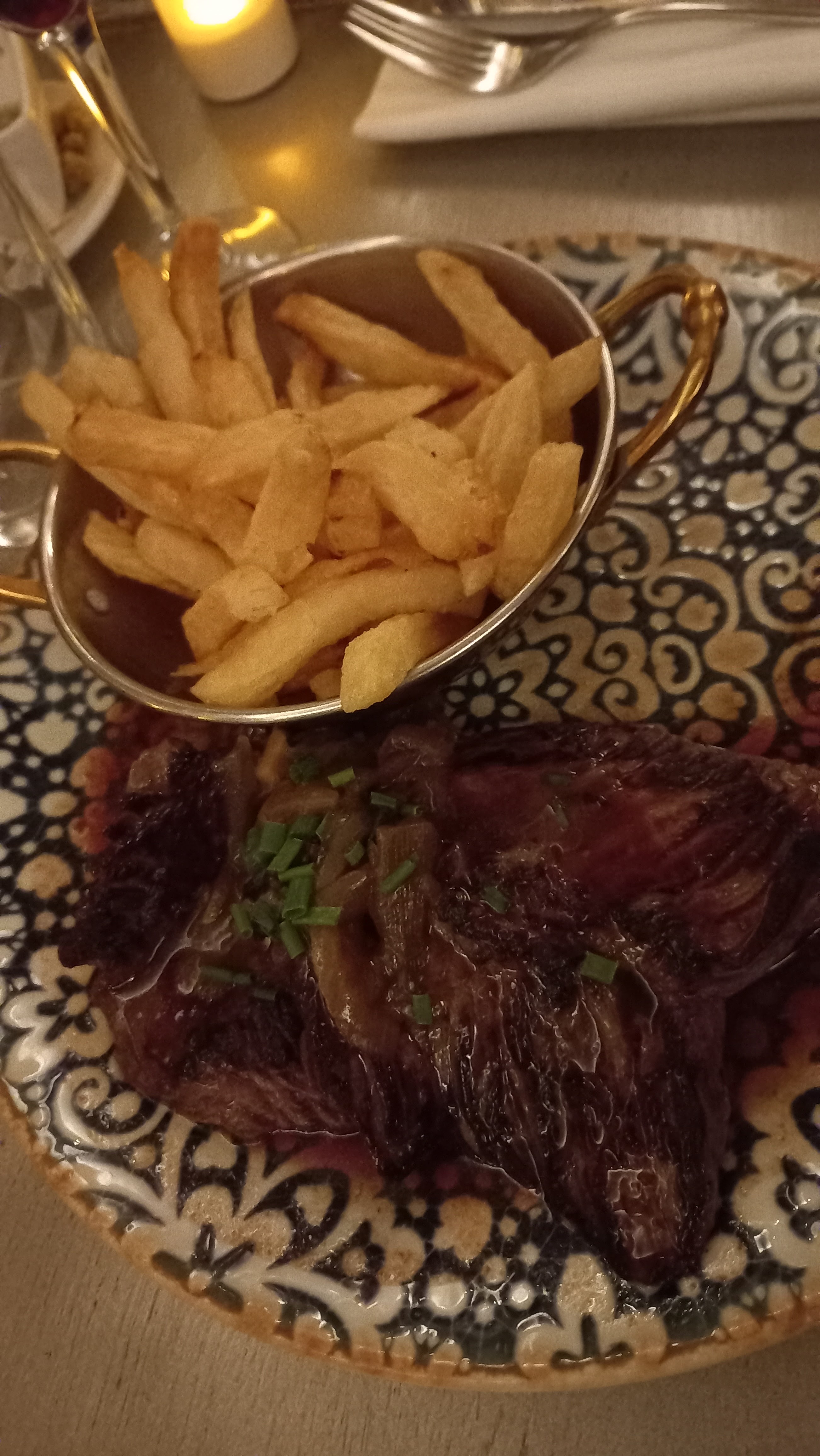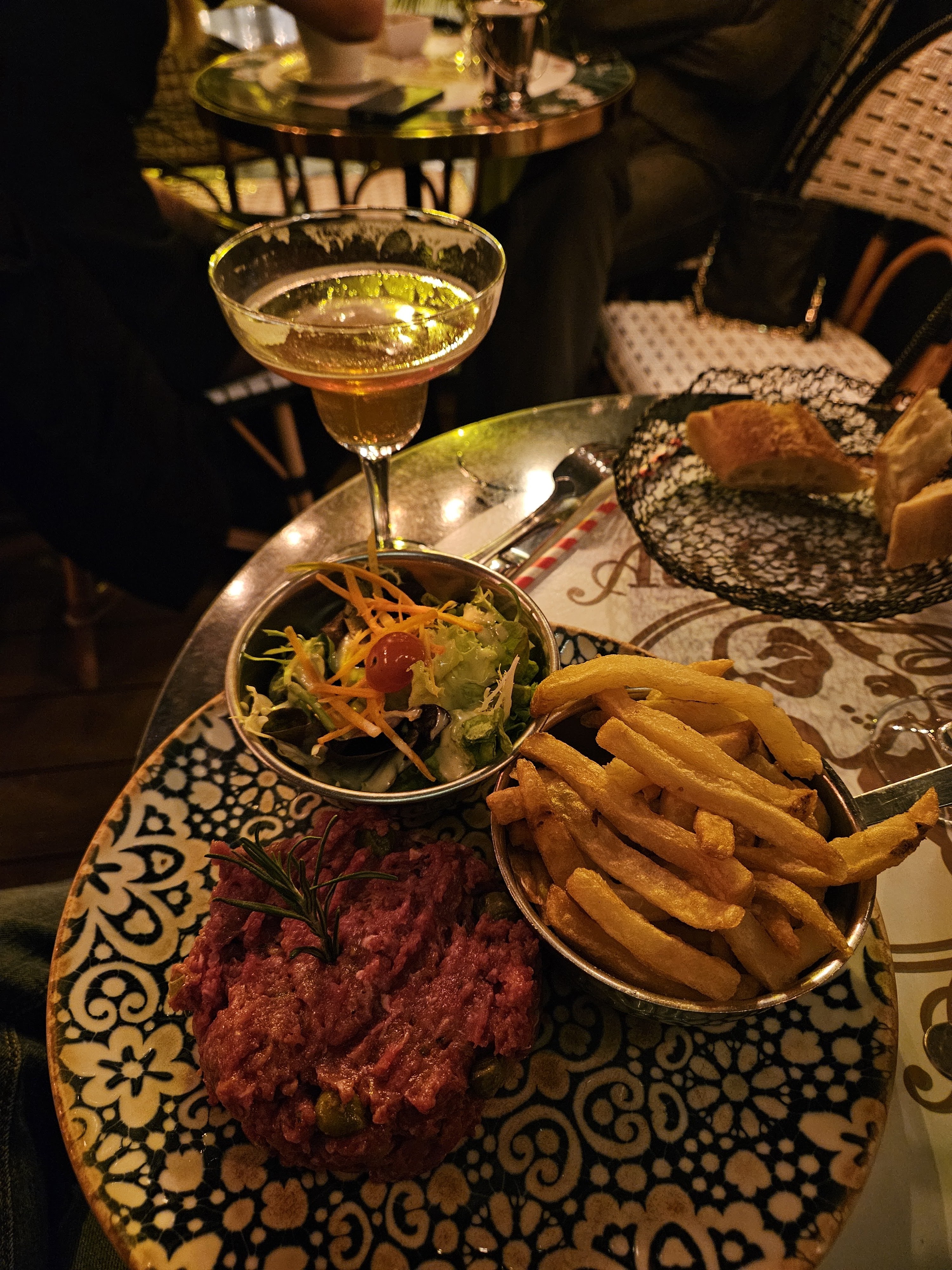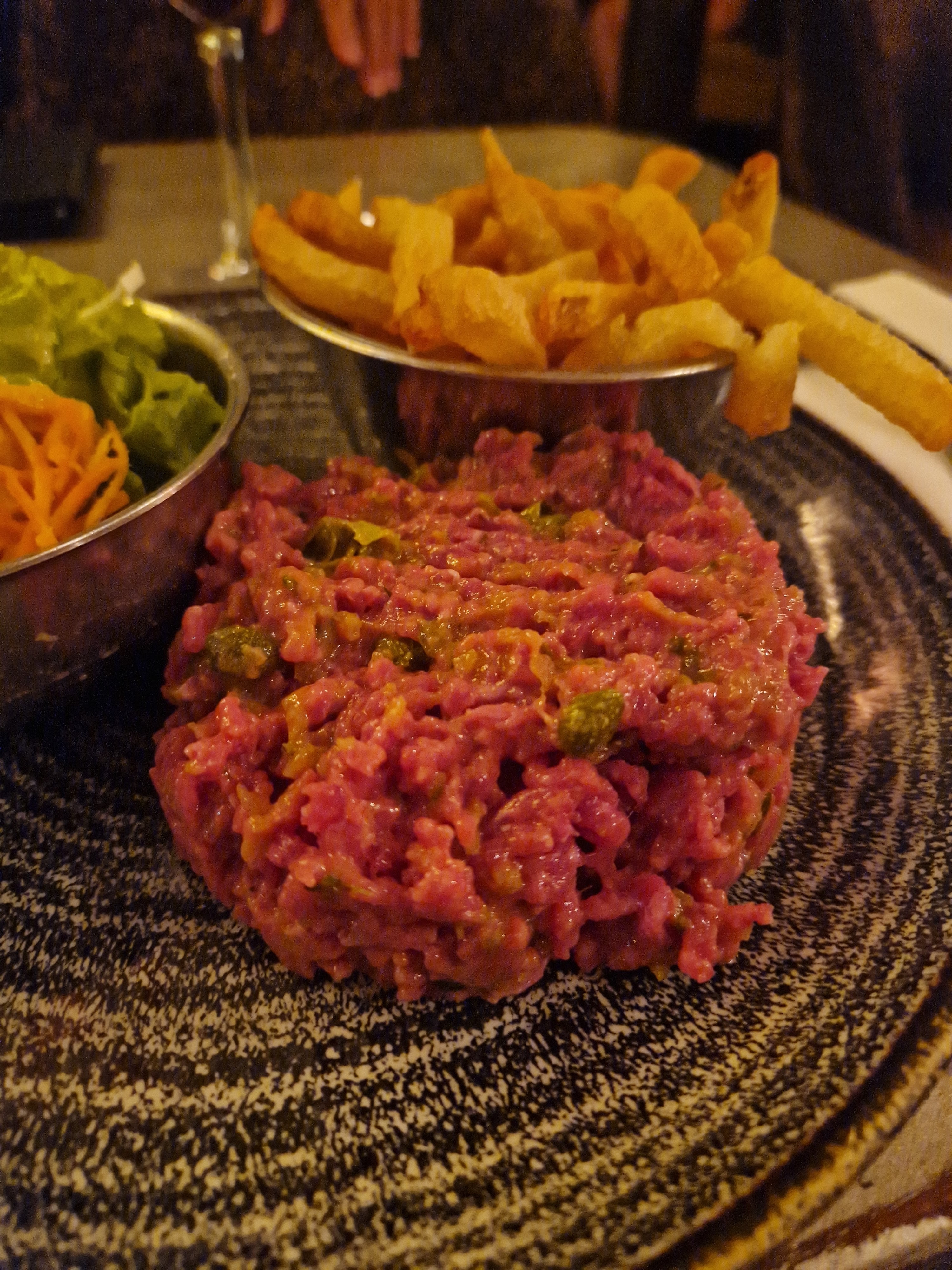 J'ai été attiré par le nom, après avoir été indécis quant à l'endroit où manger, et je sens que j'ai pris la bonne décision ! Mon serveur Nomane était très gentil et attentionné et parlait un anglais incroyable (même si j'ai essayé de parler mon français GCSE rouillé). La décoration était vraiment magnifique, avec des peintures de chiens partout. J'ai pris un steak tartare et un verre de Chinon, et le tartare était magnifiquement assaisonné.