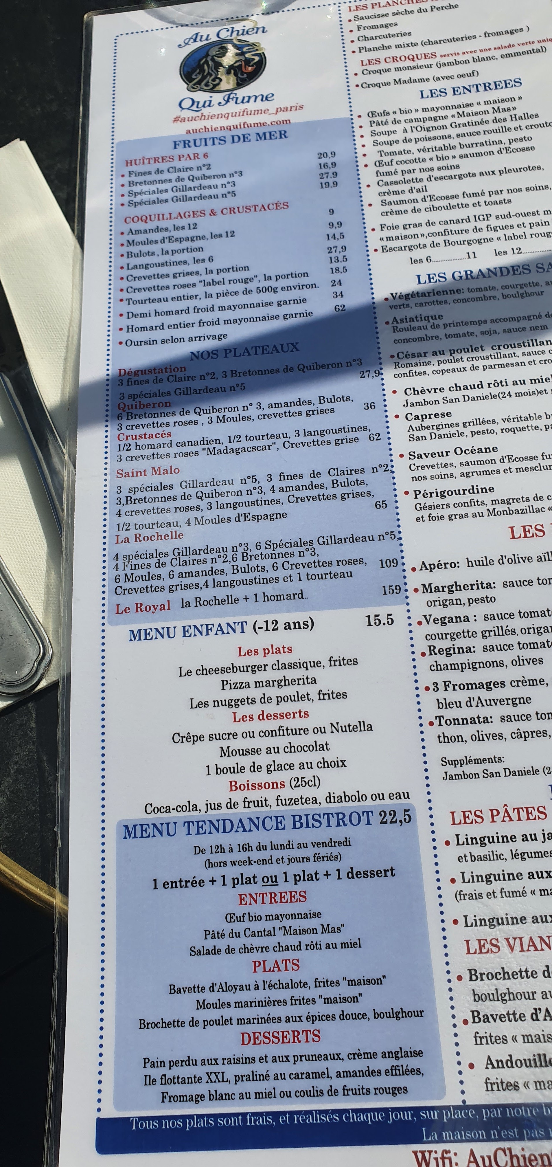 première fois pour moi au chien qui fume. Stéphane m'a accueillie chaleureusement. Il est de bon conseil sur les jus de fruit (très bon) et m'a partagé de petites anecdotes sur le quartier et Paris en général. Cela fait plaisir d'avoir un serveur conteur parisien. Je repasserai lors dun autre de mes arrêts à Paris :)