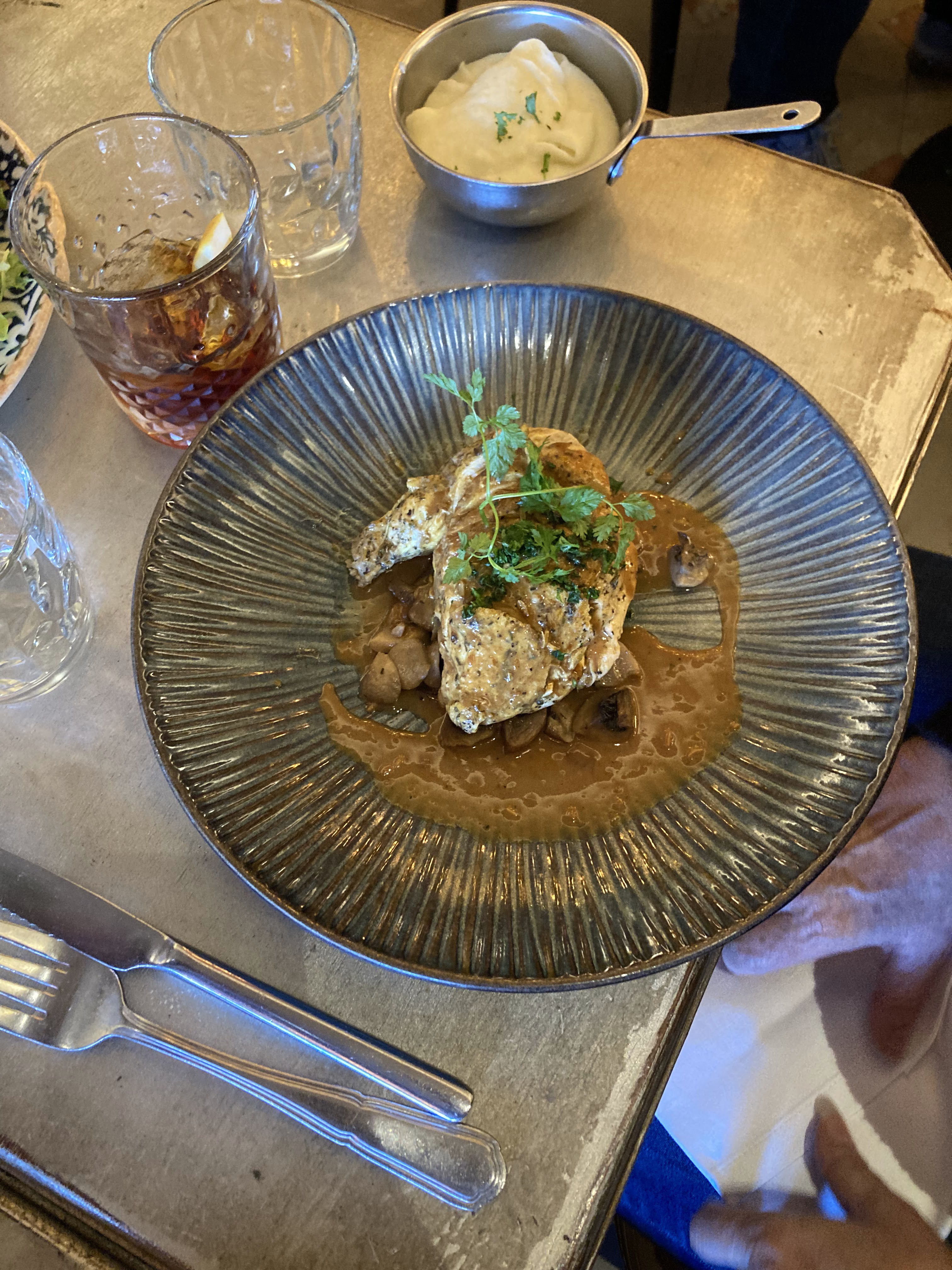 Je n'avais aucune idée de ce dans quoi nous allions marcher hier soir. Ma mère nous a réservé un dîner ici parce que cela lui avait été recommandé et elle a obtenu de sérieux points pour ce choix ! Je venais de manger du canard confit la veille, je pouvais donc me résoudre à commander à nouveau la même chose. Cependant, ma sœur a commandé le canard confit et a dit que c'était délicieux. J'ai commandé le cocktail «London Smash» et le plat de poulet. Tellement incroyablement délicieux. La purée de pommes de terre était très crémeuse et à l'ail et présentait toutes ces notes délicieuses qui vous donnent envie d'en manger de plus en plus. Je n’ai pas pu tout terminer, mais j’ai eu énormément de plaisir à essayer et je recommande chaleureusement le restaurant à tous ceux qui envisagent de réserver.
