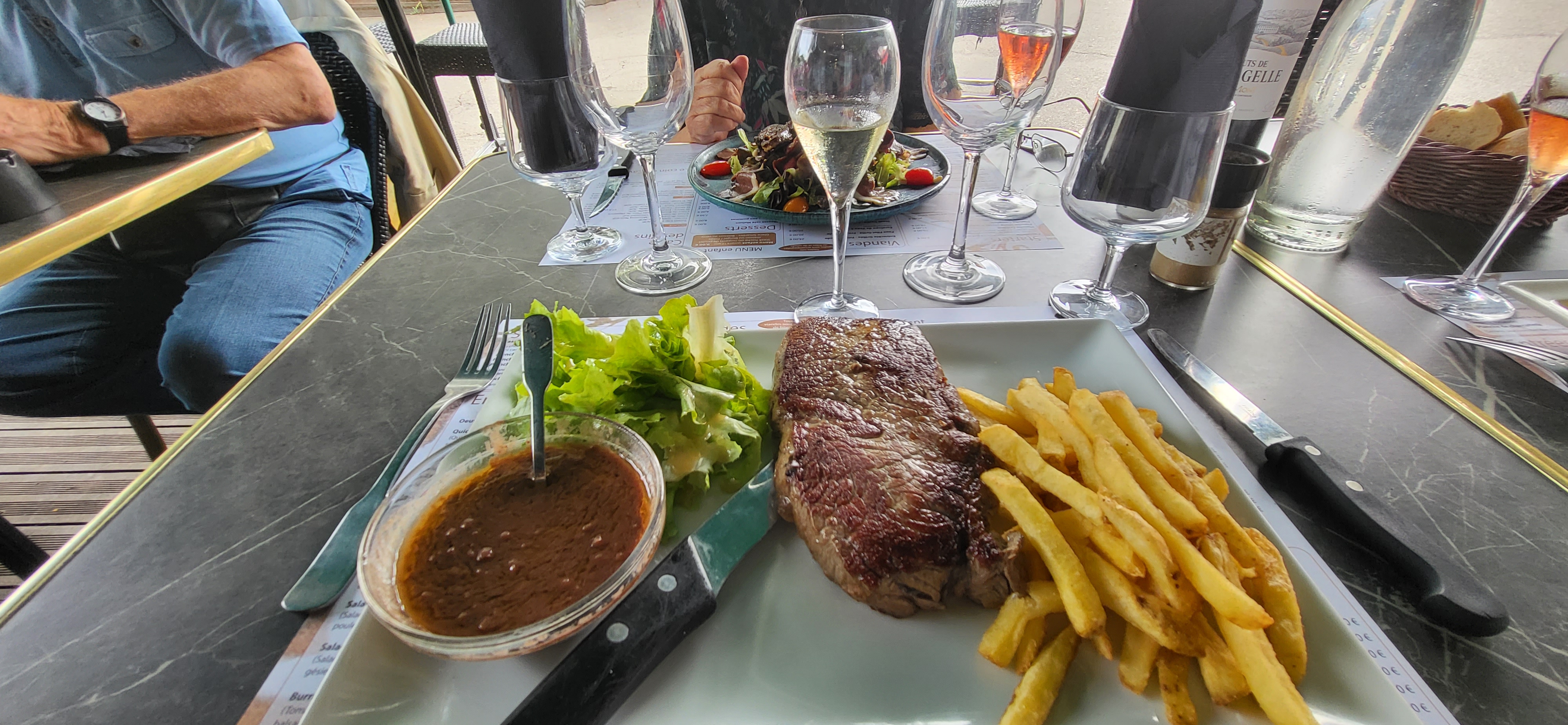Divine surprise en ce jour pluvieux de corridas. Entrecôtes exceptionnelles. Nous devions être 9. Sommes arrivés à treize. Et Chantal, trés gentiment, a trouvé le moyen de caser tout le monde. Nous reviendrons.
