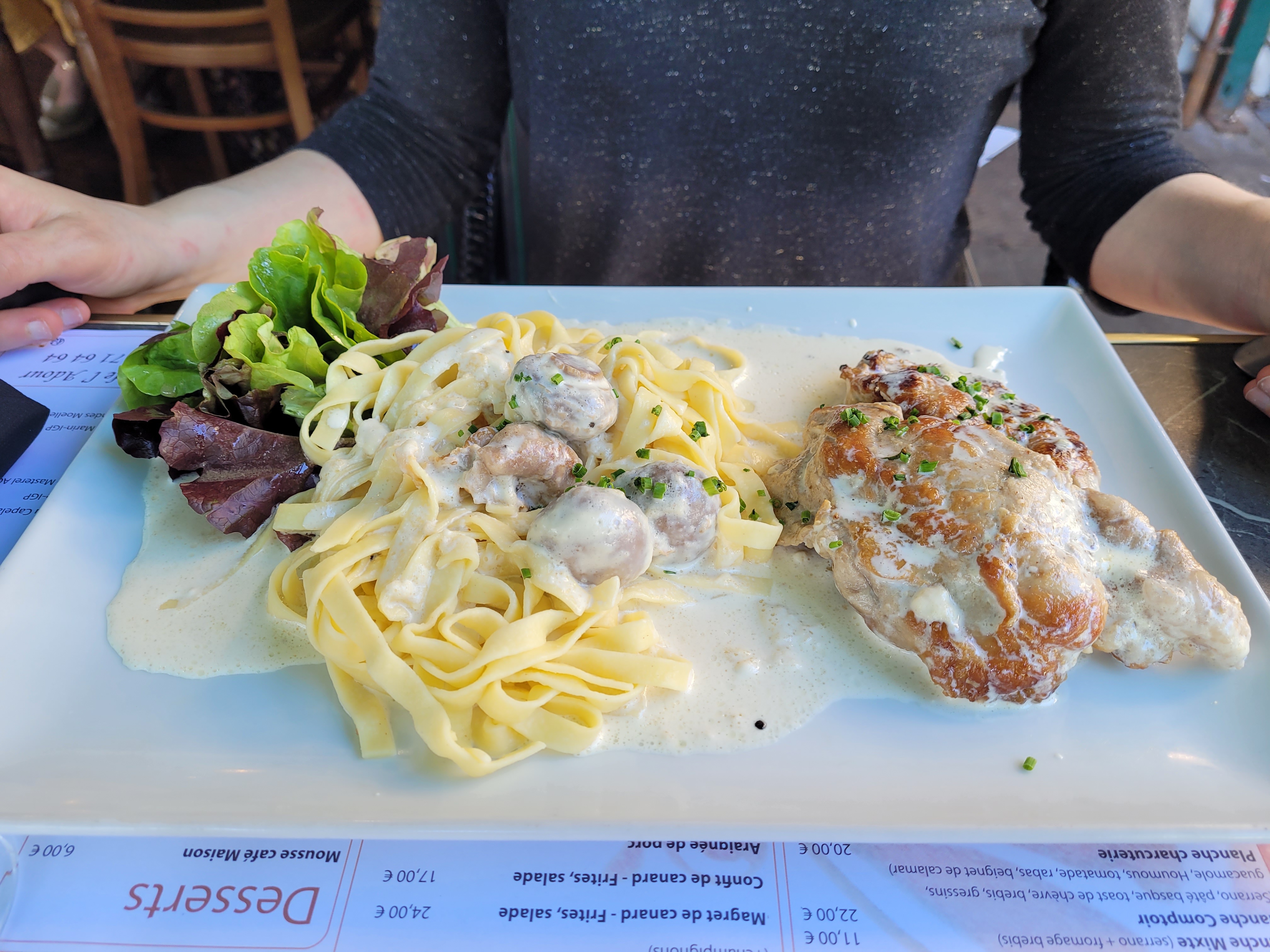On a pris le menu du jour: salade nordique avec une belle tranche de saumon fumé+ torti au saumon+ crème brûlée chocolat Tout était bon... très copieux pour un menu du jour Le seul bémol c'est que c'était complet donc malheureusement un peu bruyant