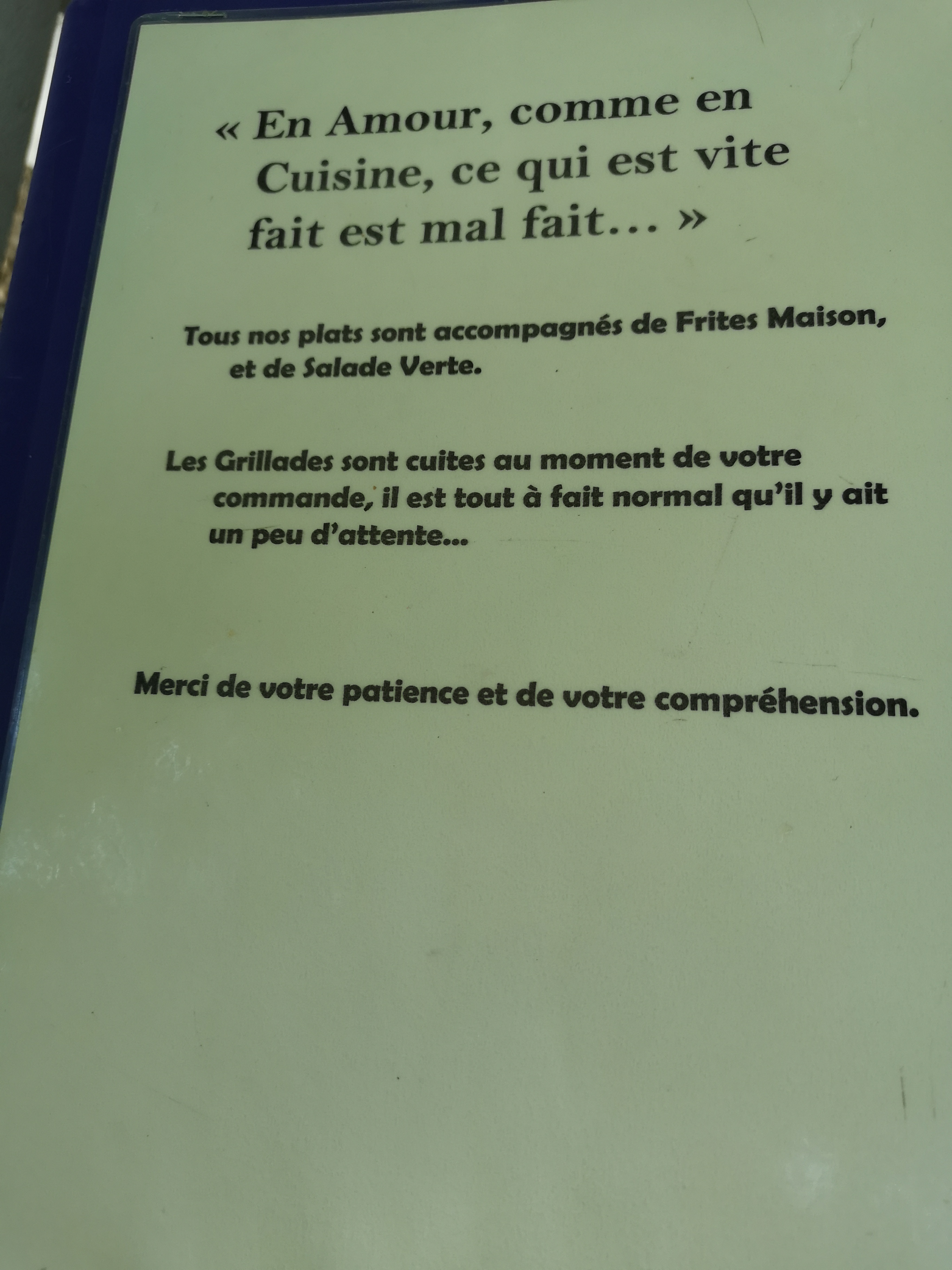 Endroit tres sympathique, restaurant plein, il convient de réserver. Cuisine impeccable,bon rapport qualité prix, Il faut attendre les grillades normal, elles sont faites devant nous. Les profiteroles...une tuerie. Bref , un bon moment, le patron est très attentif au service de façon à nous etre le plus agréable possible. La carte bancaire n'est pas acceptée, mais cela nous est dit et redit, donc pas de surprise.