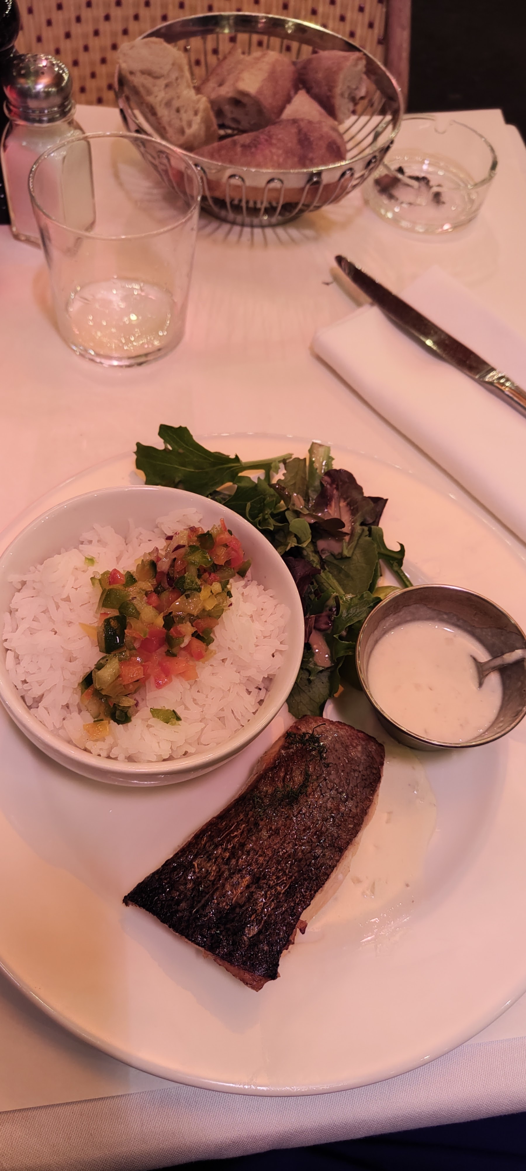 J'ai apprécié de trouver une table avec nappe et serviette en tissu. Mon plat à base de poisson était subtil et très goûtu, j'ai adoré. Dommage que le riz blanc servi à côté, était quelconque.