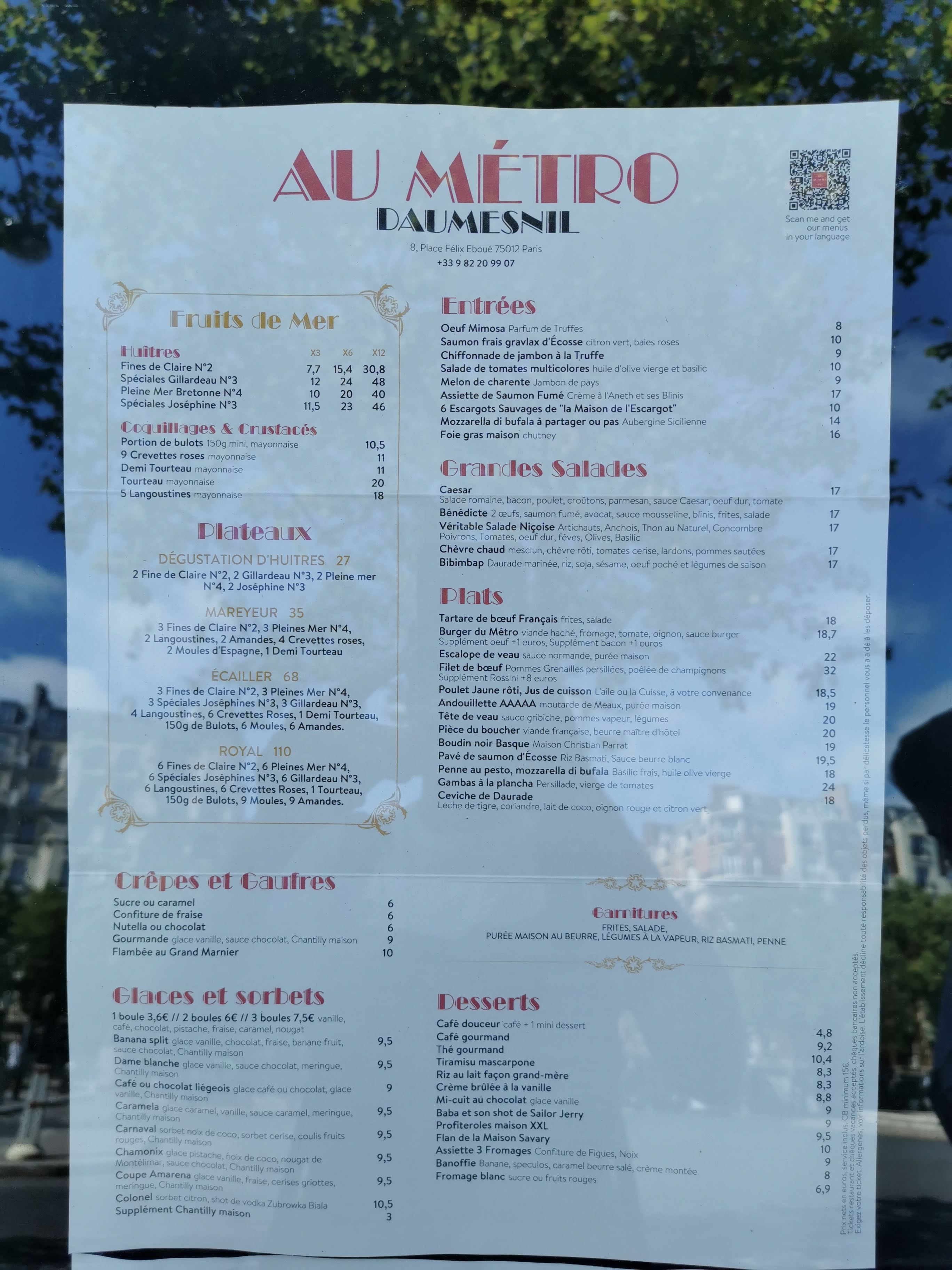 Un déjeuner parfait ! Si vous voulez passer un excellent moment entre amis, en famille, en amoureux rendez-vous la brasserie “au Métro “. Située sur la belle place Félix Eboué en face de la sortie de la station Daumesnil, vous pourrez vous installer sur la terrasse fleurie si le temps le permet. Accueil très souriant , décontracté et professionnel. Choix d’apéritifs, j’ai pris un Spritz rosé très rafraîchissant et bien servi. Comme plat le plateau de fruits de mer est un must. Fraîcheur et qualité : c’est un critère absolu pour les fruits de mer et le Métro coche toutes les cases avec brio. Si vous aimez les produits de la mer foncez ! Sinon il y a tous les classiques de la brasserie parisienne, salades composées, viandes, j’ai vu passé pas mal d’andouillettes ( il y a toujours des amateurs :)). C’est certain nous reviendrons car l’endroit est très bien tenu, une belle brasserie parisienne qui porte haut les couleurs de notre gastronomie.
