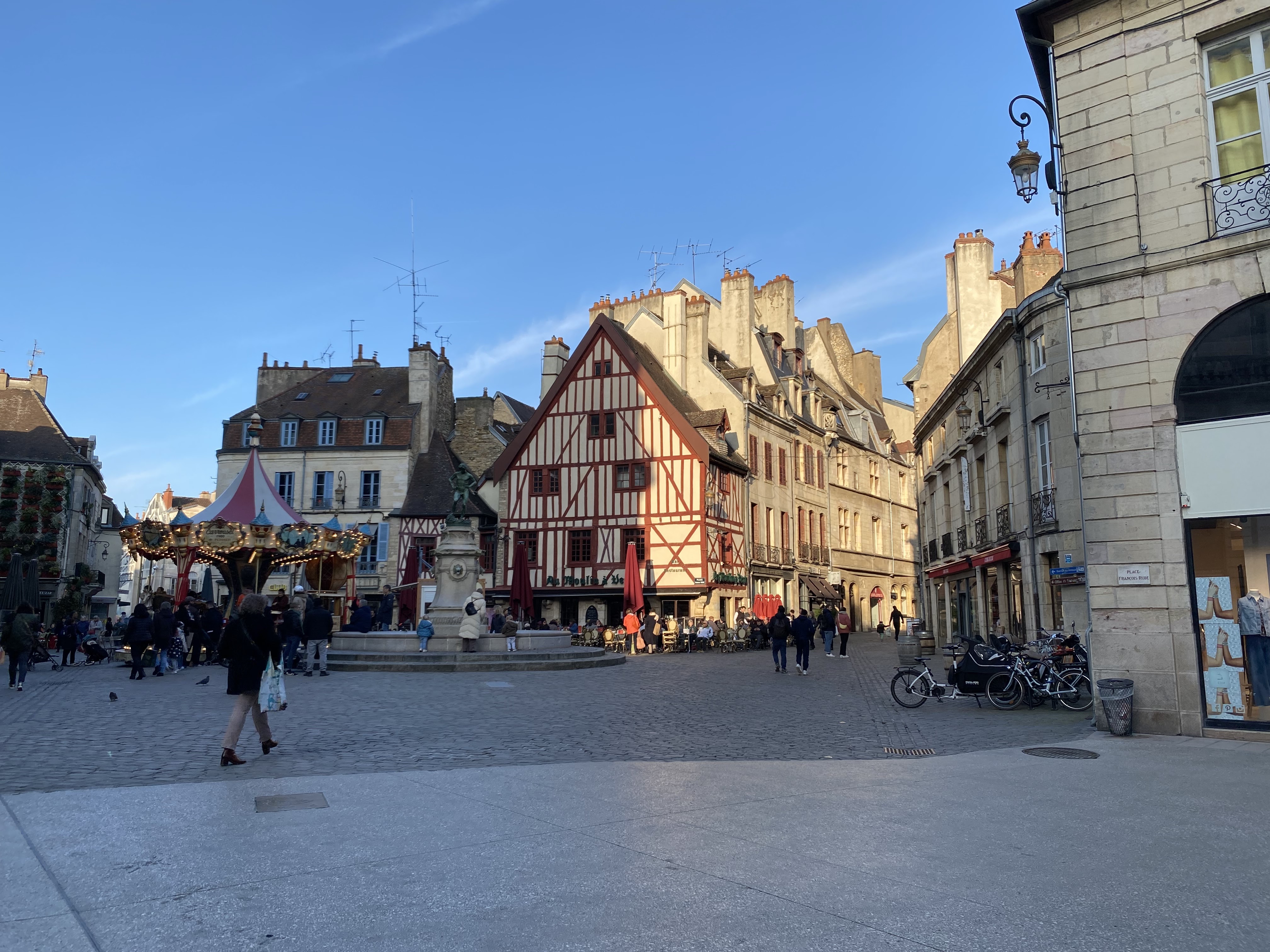 Pour un verre en famille ou entre amis ou un repas, c'est en plein centre de Dijon. Le manège pour les enfants est à portée. La terrasse est ensoleillée.
