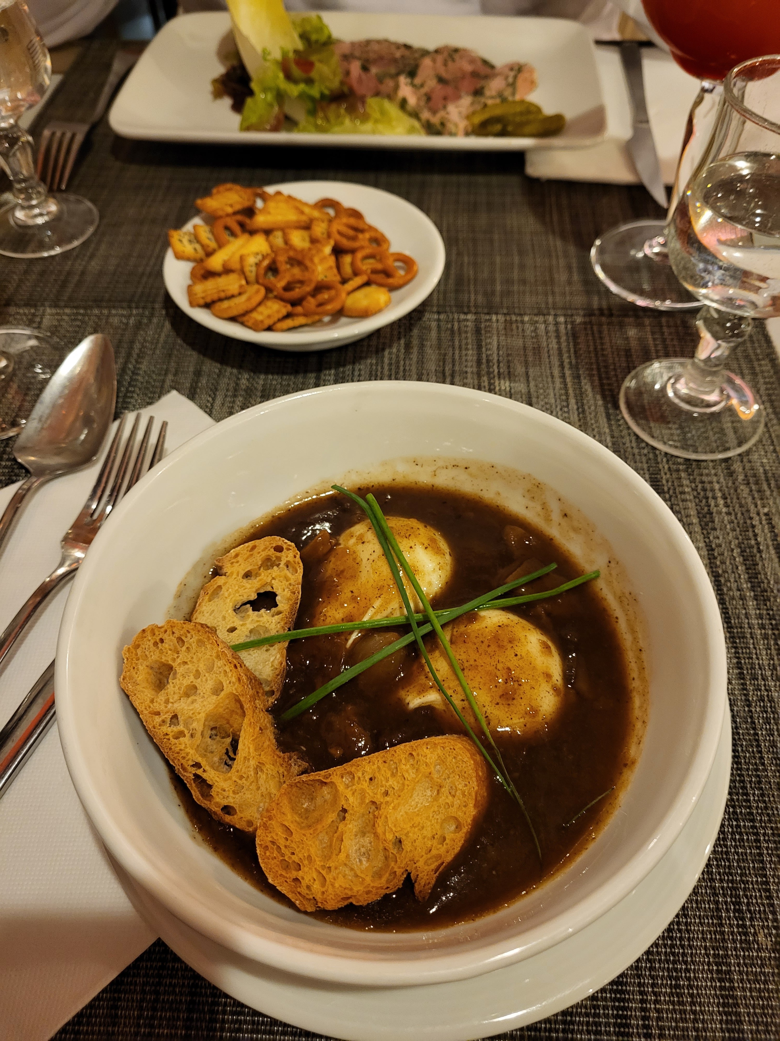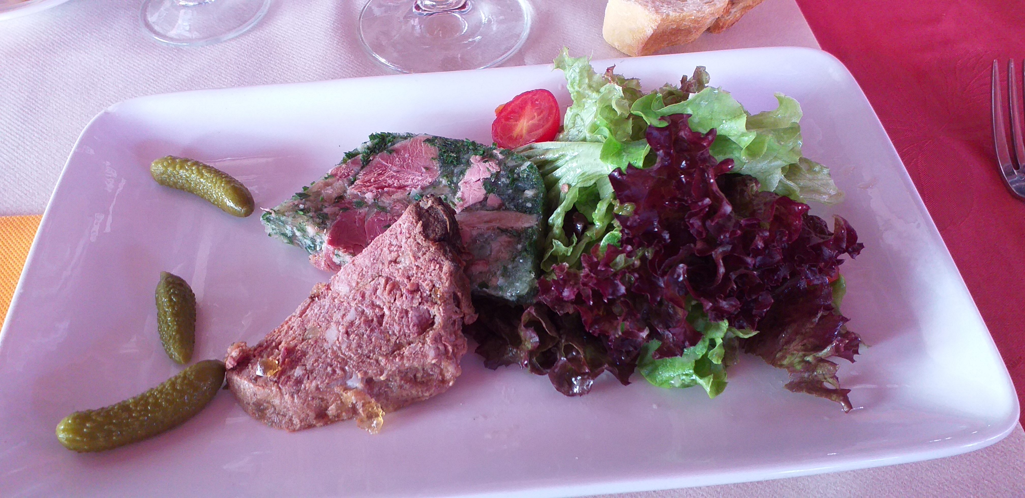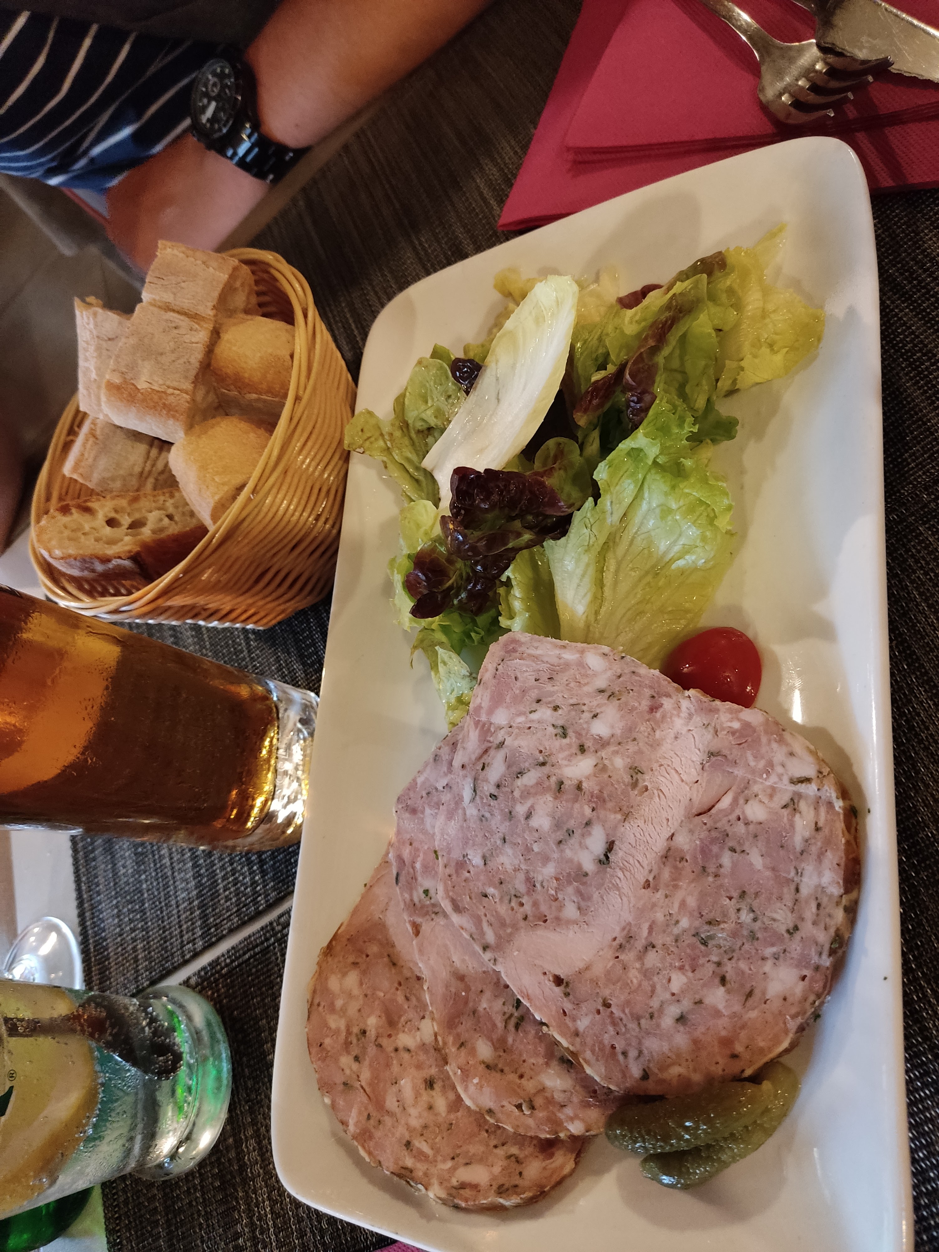 Hello, sur une jolie place, l apero en attendant le resto une assiette de charcuteries pour 2 un verre de vin blanc, correct...
