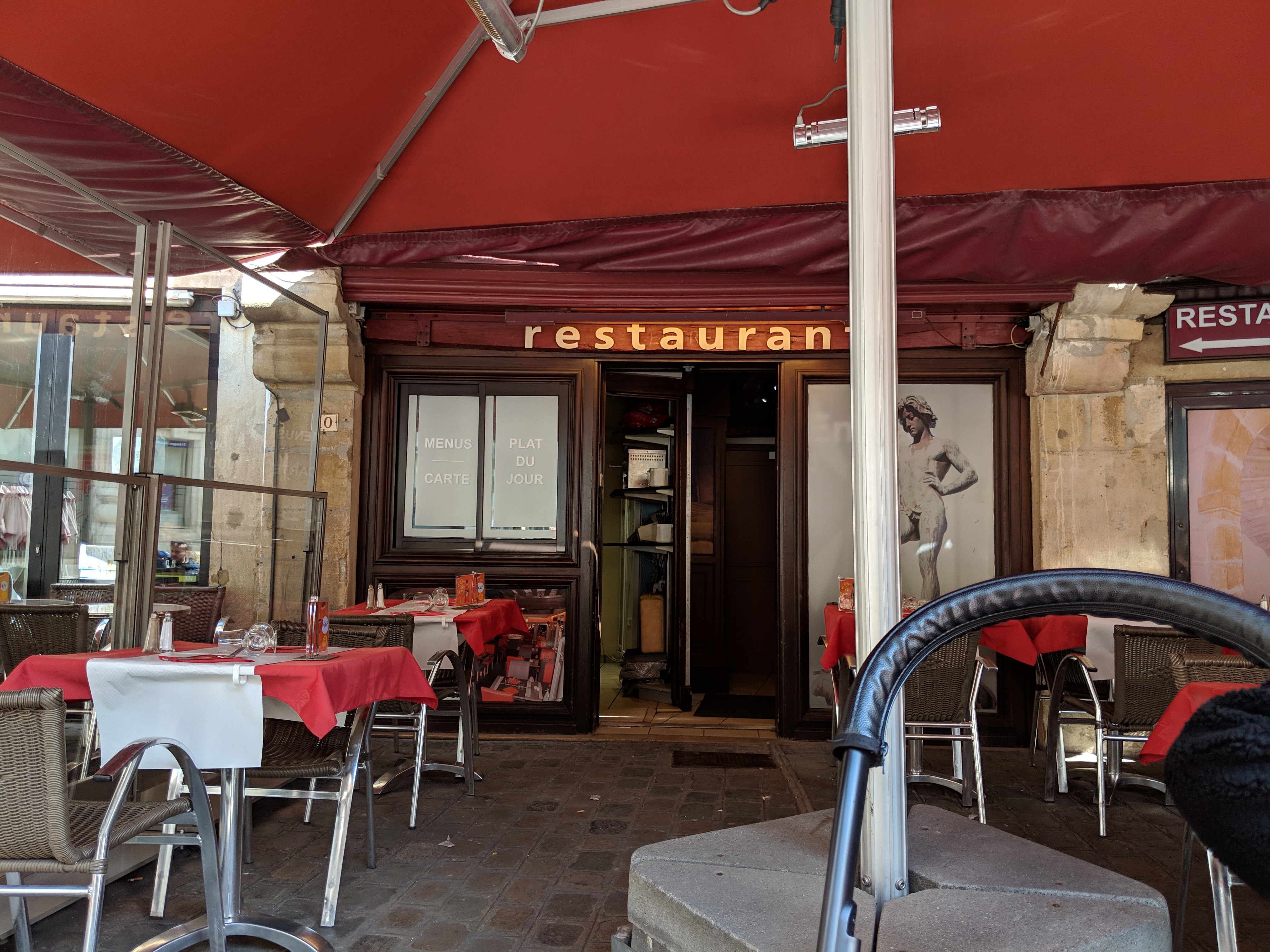 Superbe emplacement, place à colombage, carrousel, fontaine au cœur de Dijon! Menu attirant, prix de traditionnel, jusque là cohérent. Bon choix de bière et de vin. Le pire service rencontré, lenteur couplé d'incompétence, avec le fameux plus de plats du jour, répétition à chaque assiette, entrée venue à deu reprises, café toujours pas arrivé ! Pour les plats, bien servi et généreux, mais peu ragoûtant et assaisonnement inexistant. Et en plein cœur de Dijon, moutardes amora en sachet.... Dommage pas à la hauteur de l'endroit, bien entendu je ne parlerai pas des toilettes, d’amabilité ou du ”vintage”