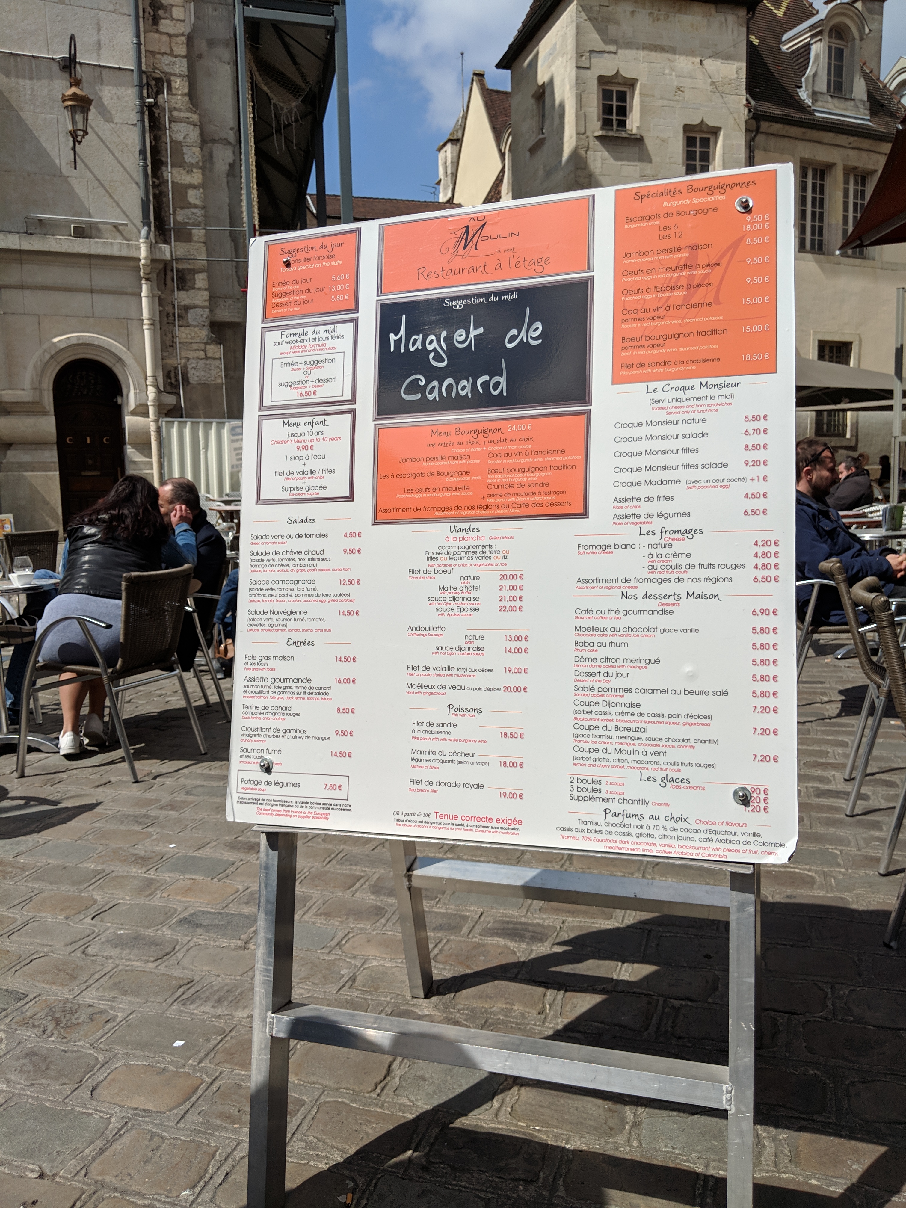 Je fais visiter Dijon à 4 copines de Haute Savoir. On décide de prendre un café ce samedi à 13h30. On s installe en terrasse, la serveuse indique qu à cette heure les tables sont pour les repas...mais bon...mal gracieuse nous sert néanmoins...on boit nos cafés et au moment de payer on veut en reprendre un second et là on se fait carrément virer de la table...belle image...vive le tourisme à Dijon