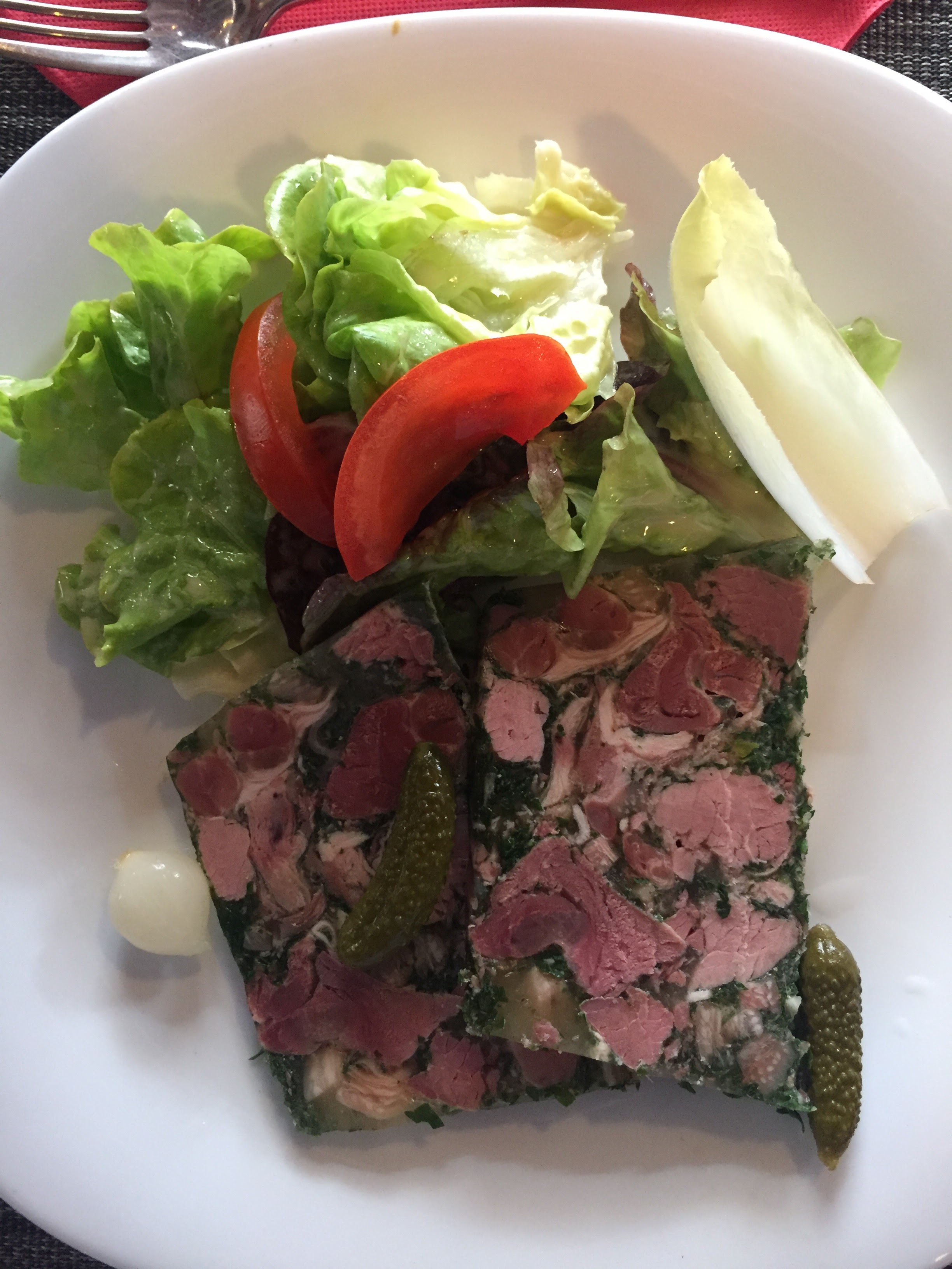 Menu du jour avec plat + dessert 16€ environ, un Jambon persillé avec du goût, juste ce qu'il faut et pour le plat un carré de porcelet champêtre, bonne cuisson accompagné d'une purée de pomme de terre ( fraîche ! ) et de légumes, sauce forestière aux champignons, très agréable. De bons vins aux choix, le cadre est agréable, merci.