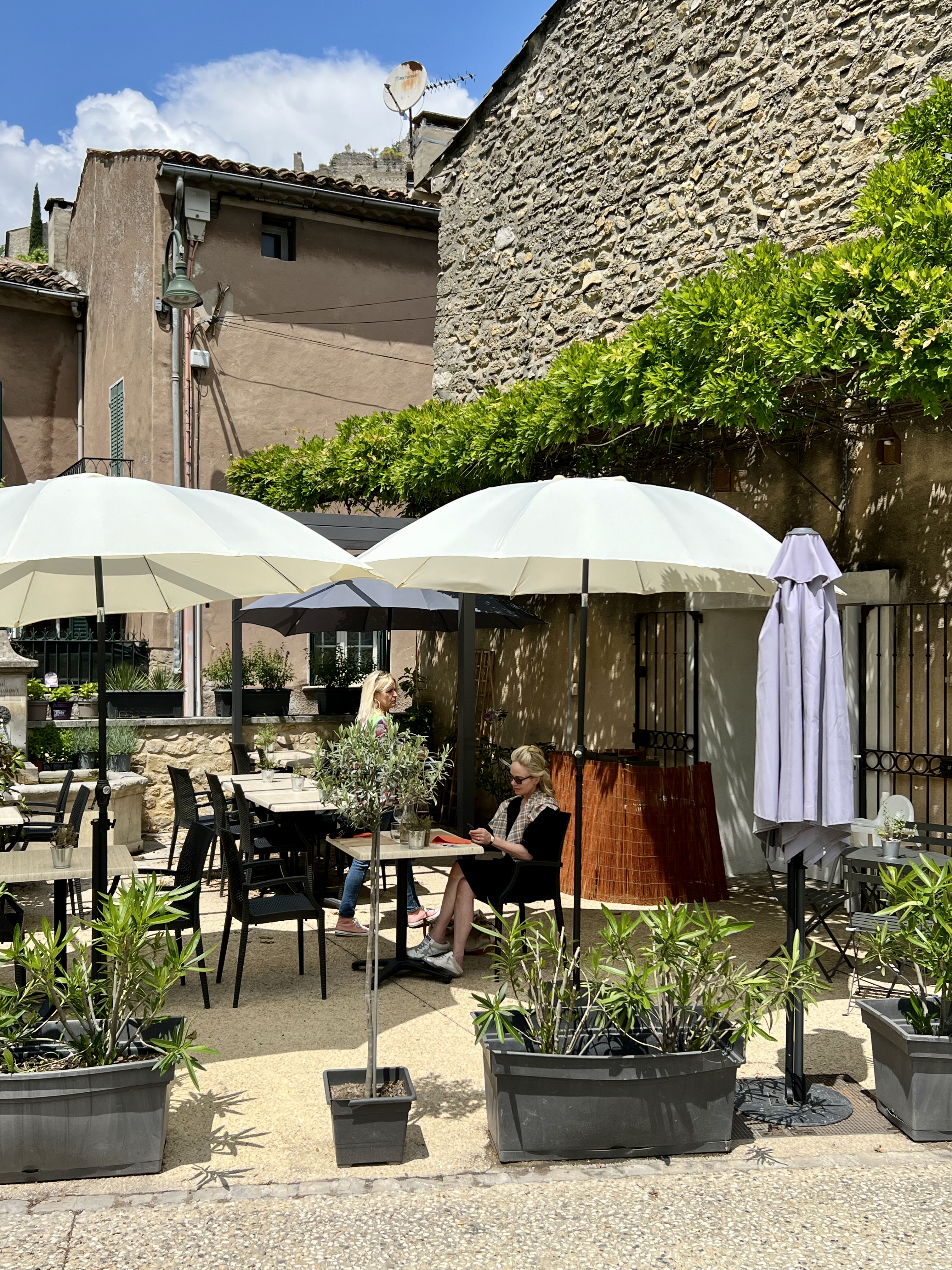 Nous ne connaissions rien de cet endroit mais nous étions de passage à Entrechaux à l'heure du déjeuner. Comme c'est souvent le cas lorsque les voyages sont planifiés dans les moindres détails, ce sont les trouvailles improvisées de dernière minute qui sont les plus mémorables. Nous avons commandé le plat du jour, la daurade et une salade de tomates et mozzarella. Et c'était spectaculaire ! La nourriture, l'atmosphère, les gens étaient tous chaleureux et accueillants et c'était l'un des points forts d'un voyage composé de plusieurs restaurants étoilés Michelin.