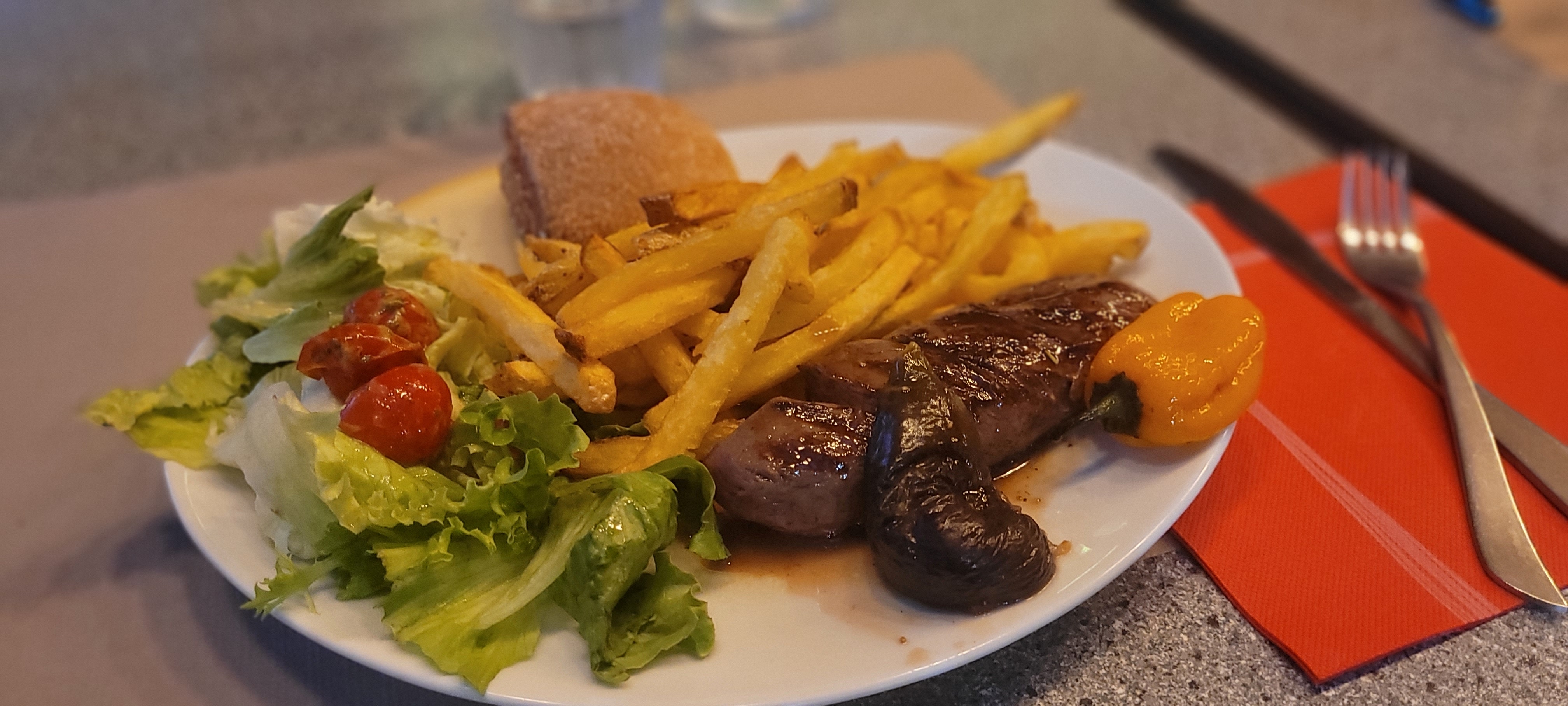 Acceuil détendu par le chef Serge, qui prends le temps d'expliquer sa cuisine avec humour. On sent sa passion qui se goute aussi dans ses plats : de vrais frites maison, assiettes copieuses, fromage et salade compris, cuissons parfaites. Viande de qualité et produits locaux. On recommande, n'hésitez pas ! Merci Serge et Valérie.