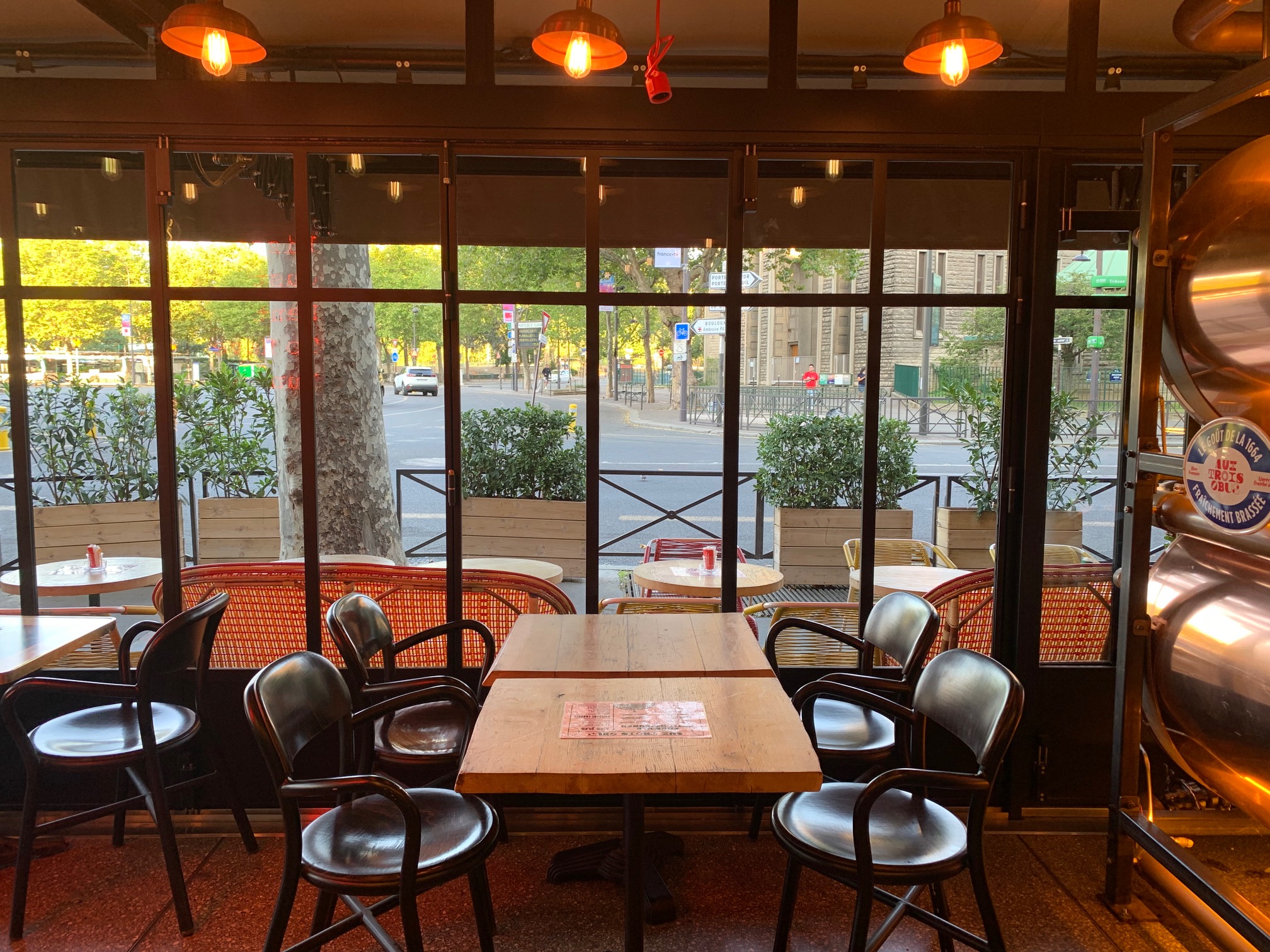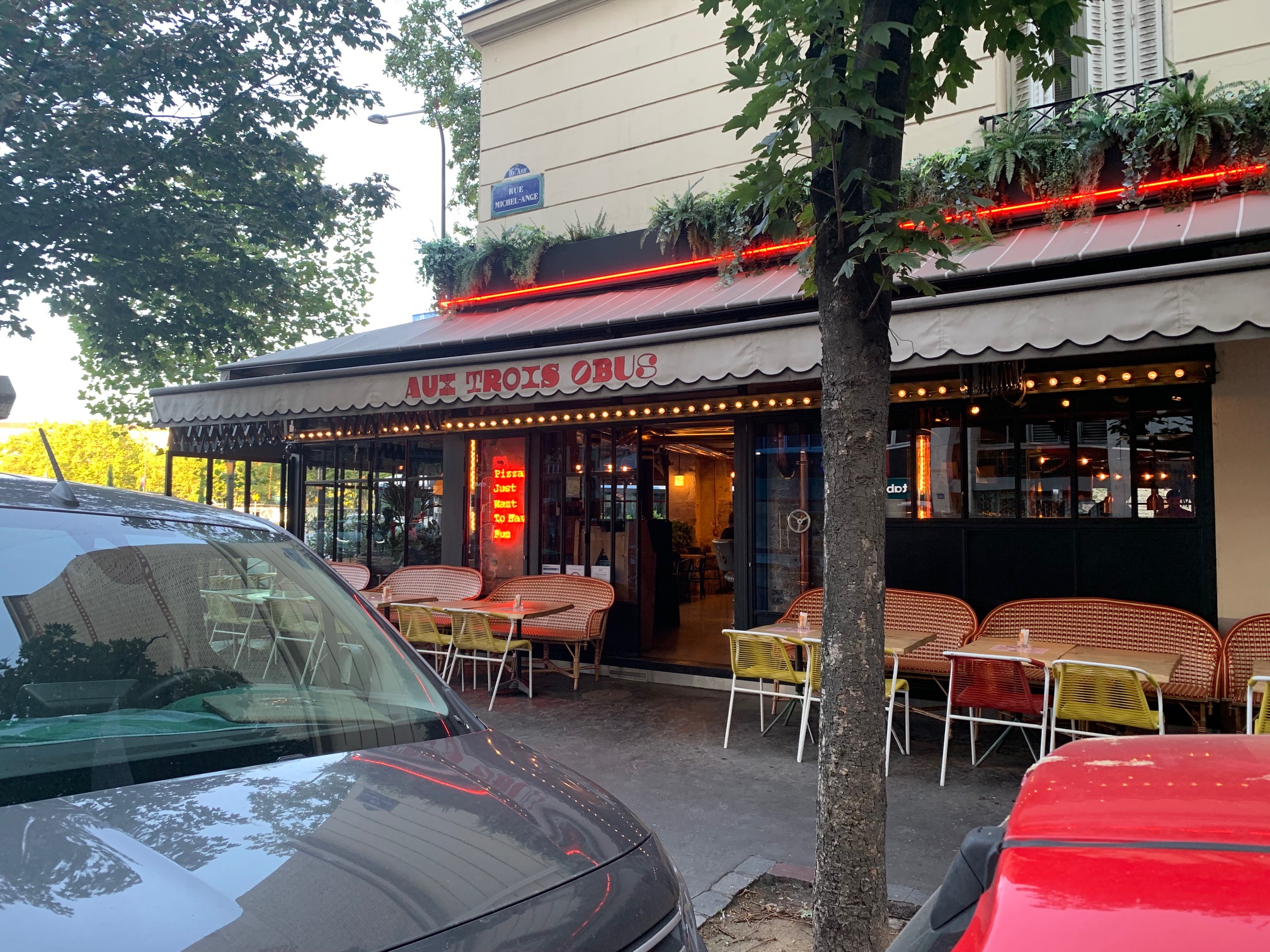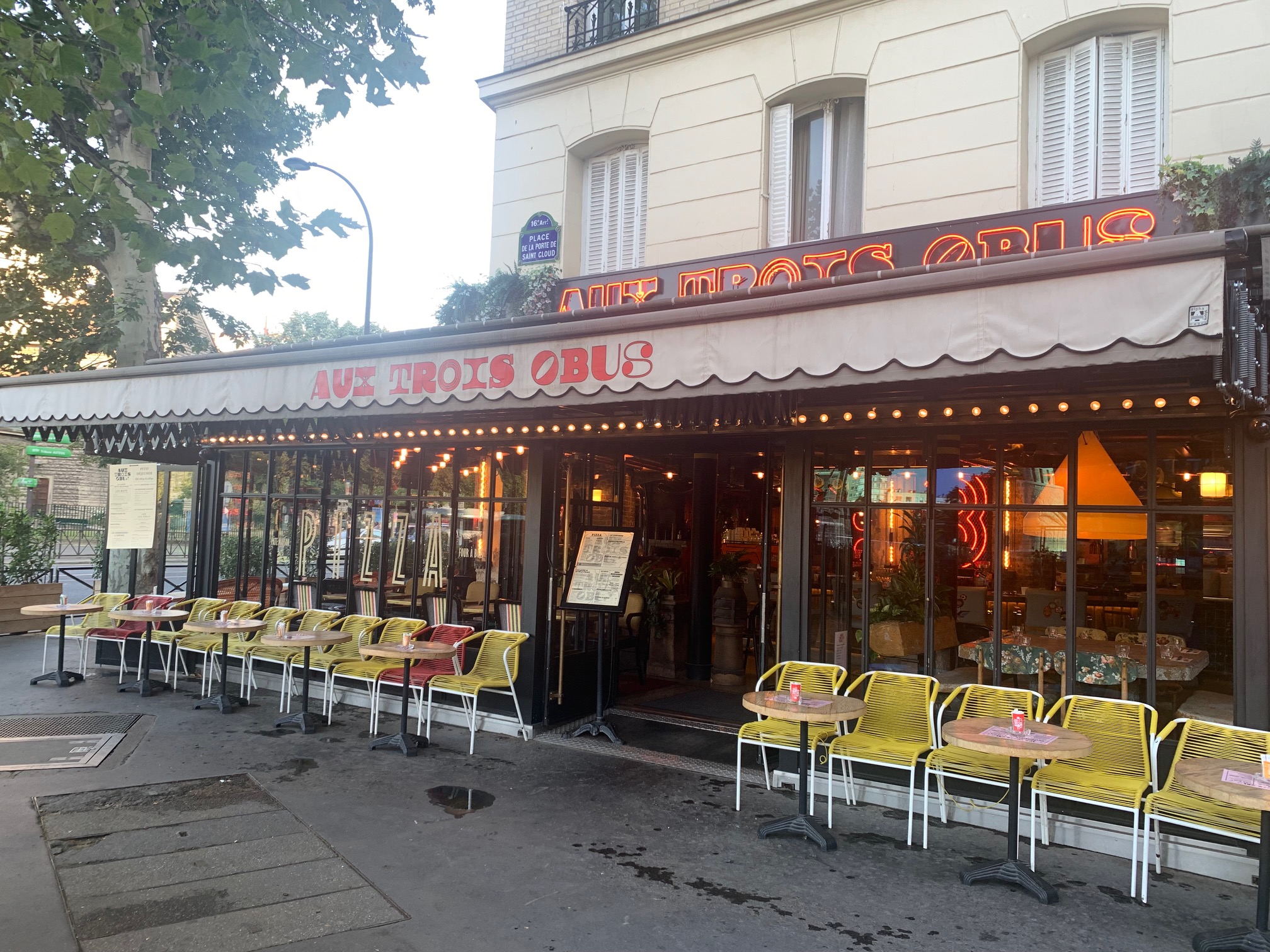 03/10 Catastrophe ! 💣 Aux Trois Obus, cette institution de la Porte de Saint-Cloud, n'est plus ! Fondée en 1932, cette célébrissime brasserie avait pourtant vu venir s'encanailler à son comptoir des générations qui, de pères en fils, refaisaient le match jusqu'au bout de la nuit les soirs des grands événements internationaux, ceux du PSG plus récemment. Aux trois zobs on venait facilement le midi se tailler une bonne bavette (à l'échalote), on venait regarder les matchs de foot ou de rugby sur grand écran avec les potes et l'on venait tout simplement aussi, pour profiter du soleil de la fin de journée en terrasse. Aux trois zobs, on laissait sa bagnole garée n'importe comment devant le bar et l'équipe du bar annonçait au haut-parleur quand les flics approchaient... 😎 Ces Trois Obus là ne sont plus, ils sont bel et bien morts, définitivement enterrés 🥺 À la place, un néo bar-pizzeria à la déco industrialo-branchos digne d'un designer de fast food, où les pourtants prometteurs gros réservoirs de bière en métal visibles à l'entrée, ne font en fait que stocker l'unique pression délivrée dans le lieu ; l'insipide 1664, toujours sans aucun intérêt (indépendamment de ceux de l'impérialiste holding) et même comme ici, non filtrée. La carte est tout aussi décevante (pizzas et burgers, tradition française oblige 🙄), plutôt chère et vous ne viendrez donc certainement pas ici pour la cuisine (y'en a t'il une au moins ?). D'ailleurs, pourquoi viendrez-vous ? En face, de l'autre côté de la place, il y a le bien plus cossu Le Cardinal où la carte est remarquable, et si toutefois c'est un bistrot plus simple que vous recherchez, autant pour boire un verre en terrasse que pour vous régaler d'une cuisine très bien réalisée à bon prix, alors poussez quelques mètres plus loin, rue Michel Ange, jusqu'à La Garconnière ; ça c'est un chouette bistrot avec de la personnalité et l’esprit de la restauration. Pas un concept hybride destinée à faire de la thune et qui appauvrit le quartier. Aux Trois Obus, je n'irai plus 😢