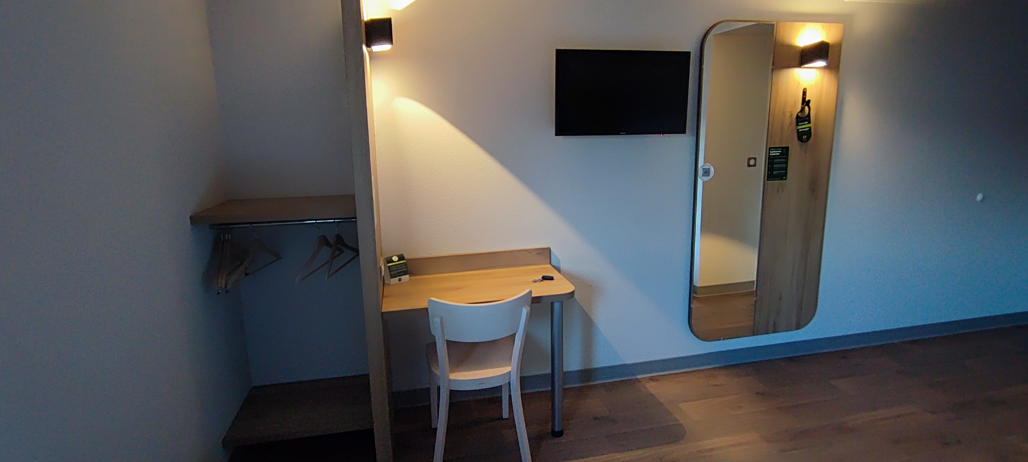 Hôtel quasi neuf et pratique pour de courts séjours ou étape de passage (accès 24/24) car situé en proximité immédiate de l'autoroute (bonne insonorisation, fenêtre fermée on ne l'entend quasi pas). Hôtel propre, chambre (double) avec le strict nécessaire, literie agréable, petit déjeuner pratique mais un peu cher vu le choix proposé.