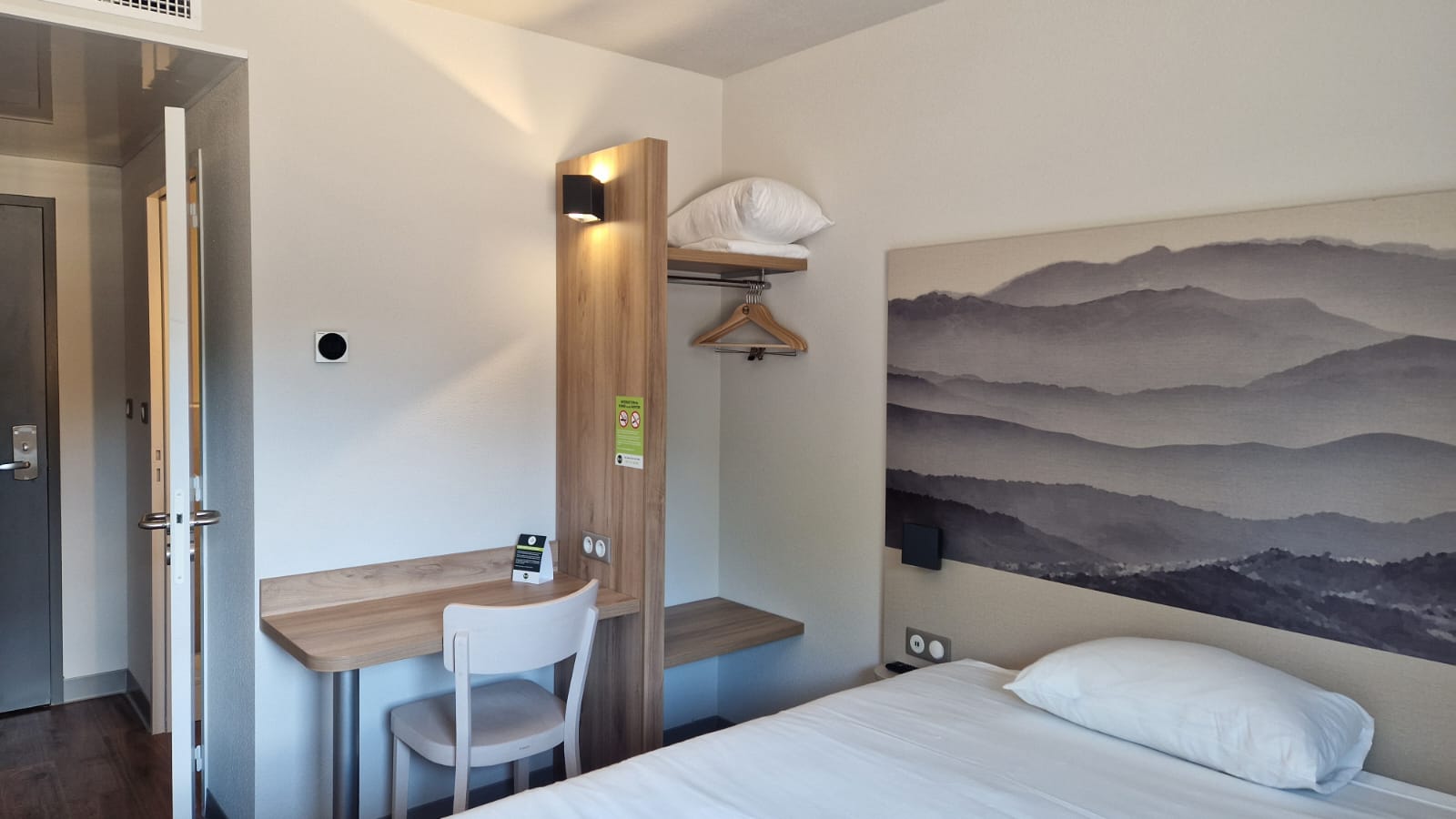 Une literie inconfortable car pas de sommier mais une planche sous le matelas... NON ÇA LE FAIT PAS !!! Mal de dos pour nous deux. Oreillers pas très qualitatifs. Nettoyage de la vaisselle et surtout des couverts approximatif. Promiscuité de la petite salle petit déjeuner, froide peu déco peu accueillante style cantine d'école. La chambre et salle de bain sont propres. Manque de quoi poser sa valise plutôt que par terre. Nous n'avons pas été prévenus d'un accès wifi mais la 4g est présente. Impossible de laisser la fenêtre ouverte dû a l'autoroute a proximité, mais l'isolation phonique est efficace. La climatisation est simple a régler et relativement discrète. Donc déçu car si l'élémentaire confort et devoir en hôtellerie n'est pas là qu'avons nous payé ?