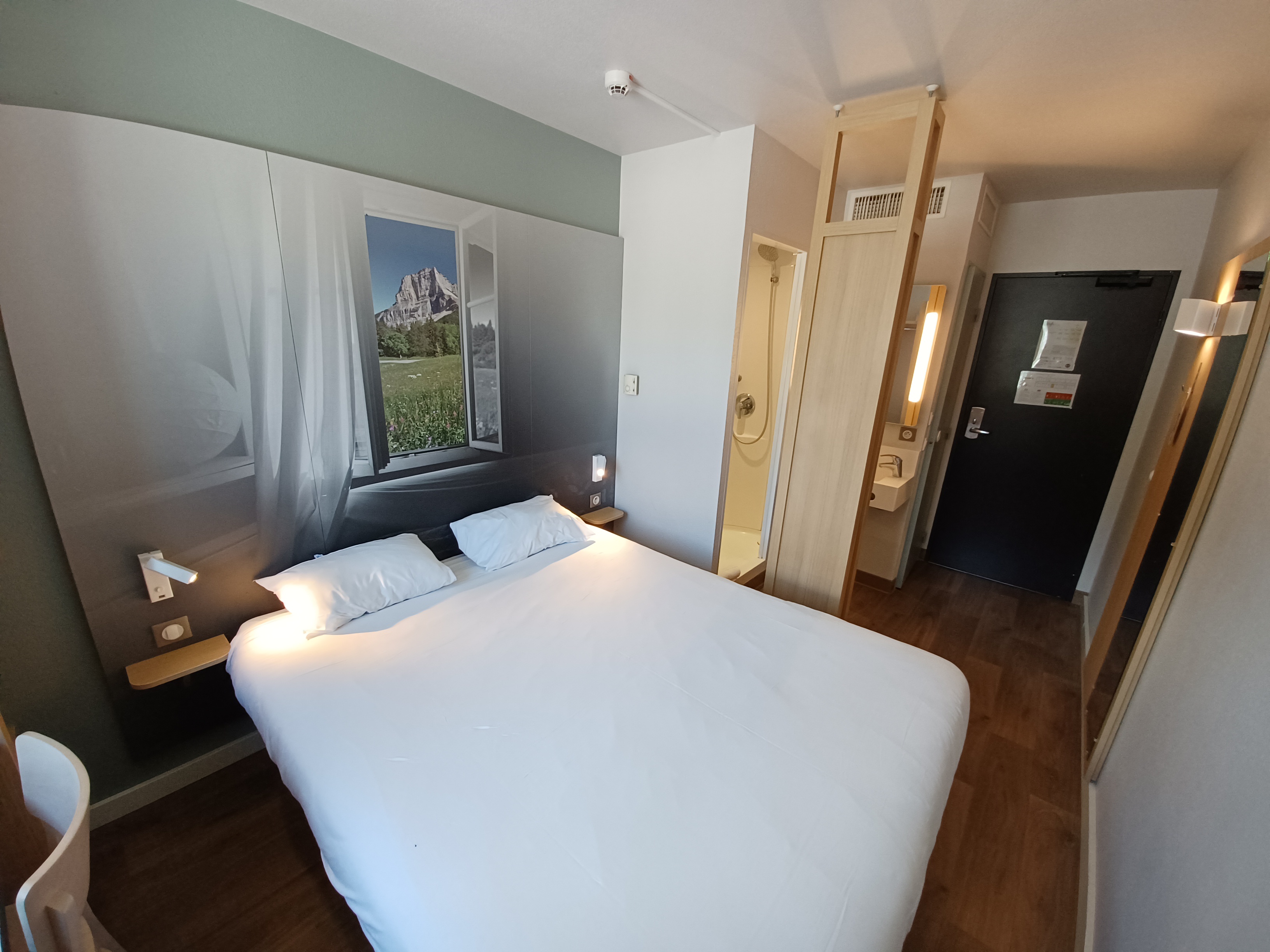 Je participais à la course cycliste Cyclo col de la madeleine, comme b&b sponsorise une équipe cycliste j'ai choisi B&B. Le check in à distance, et la borne sur place vraiment super et permet d'être autonome. En revanche il y avait un nombre incalculable de moustique, mouche mortes, sur ma petite table en face de la fenêtre et dans les WC. On voyait bien que le ménage avait été fait car le cadre général et WC était propre mais un petit coup pour enlever ces insectes aurait été pas mal.