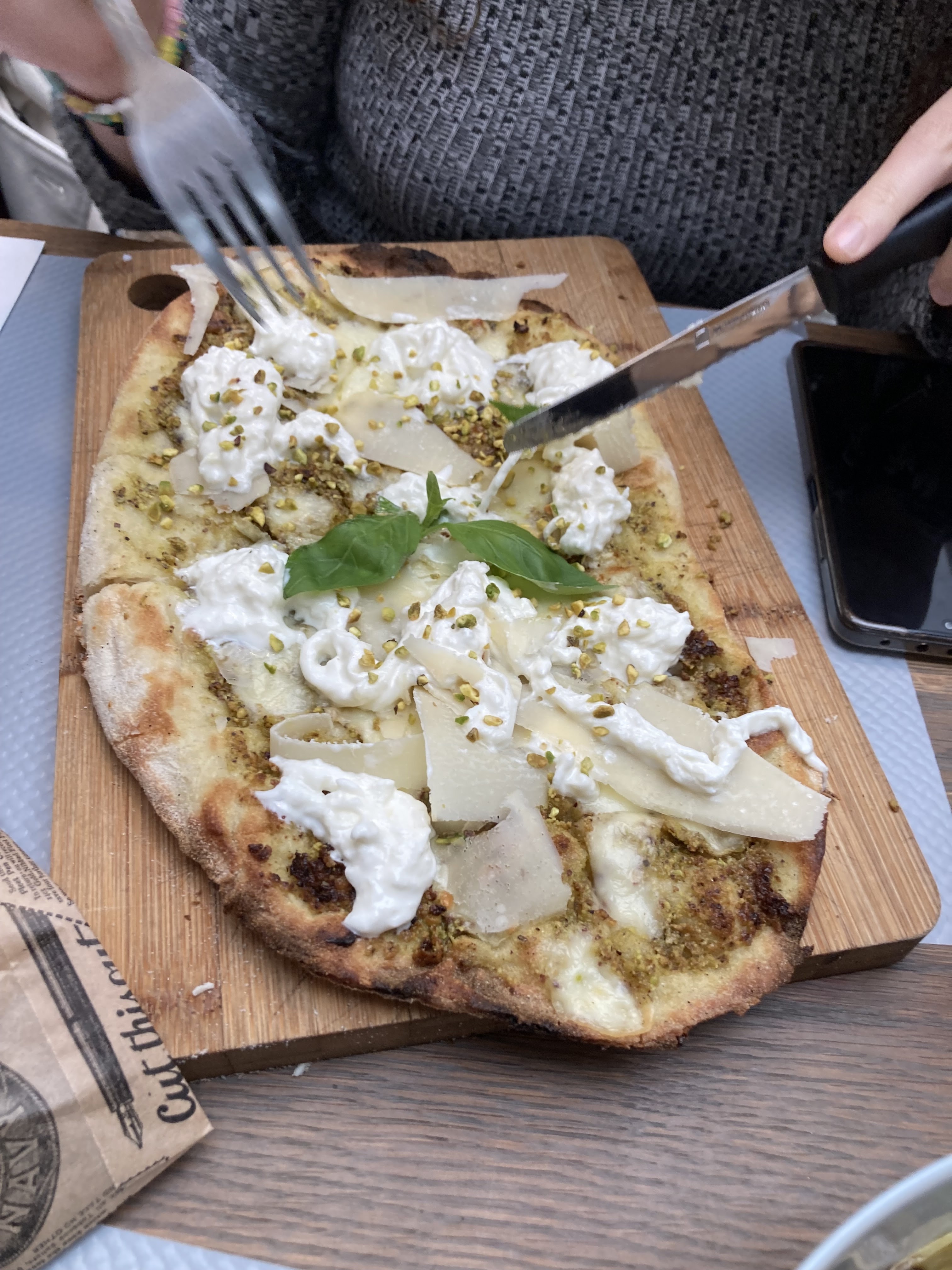 Restaurant très sympa, très bon accueil et avec des produits de qualité. Je suis très heureuse d’avoir finalement un resto comme ça à Cambrai! Ils proposent des pinsas (une sorte de pizza plus légère et plus goûteuse (fermentation naturelle et longue). Il est possible de prendre juste la pinsa ou 1/2pinsa et 1/2 salade. Sinon ils ont des salades aussi. J’ai partagé une salade et une pinsa avec ma pote et on s’est régalé. La pinsa pistache était très bonne et la salade aussi. Merci l’équipe pour ce resto! On retournera sûrement pour goûter les bons vins et d’autres pinsas