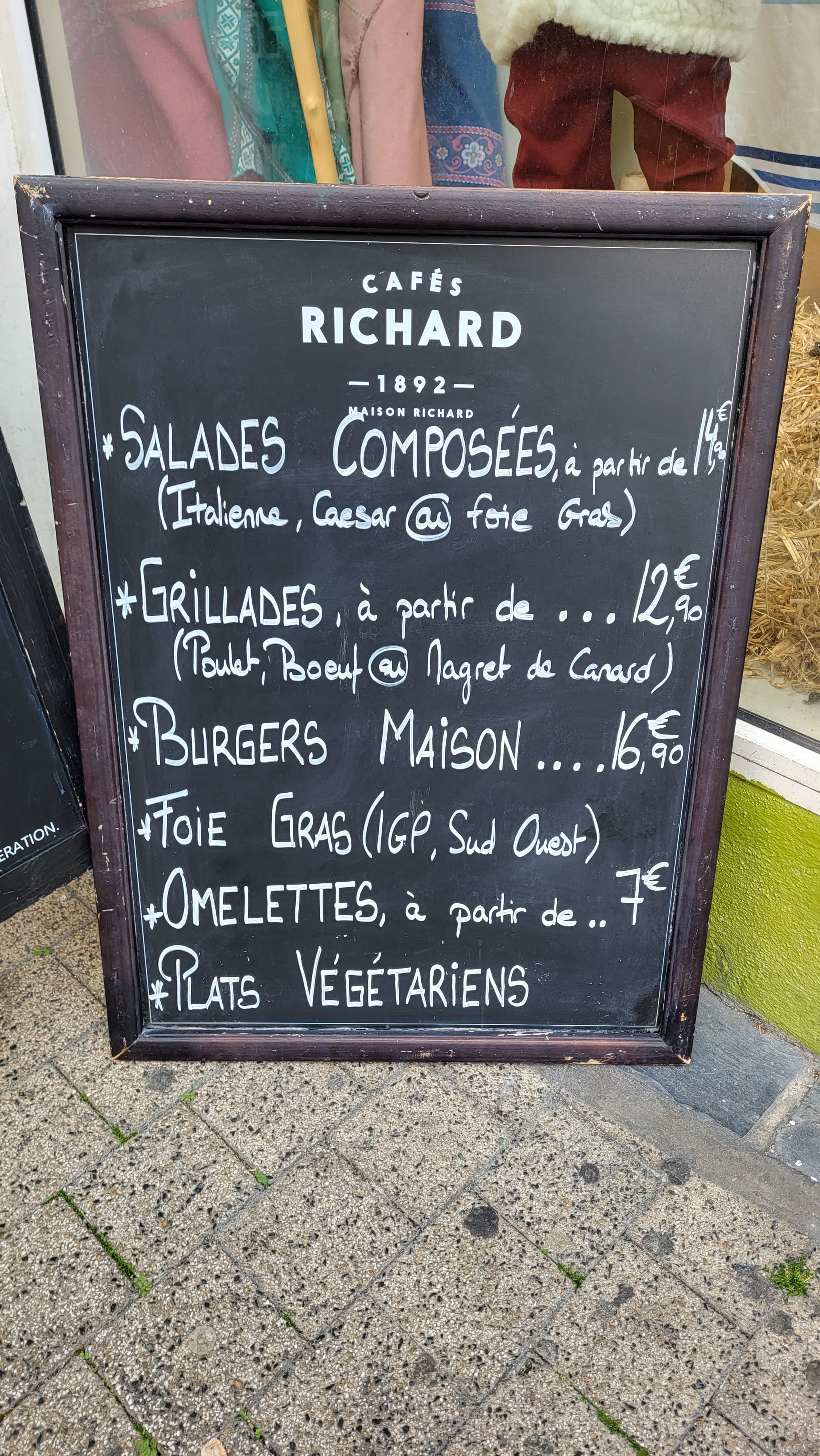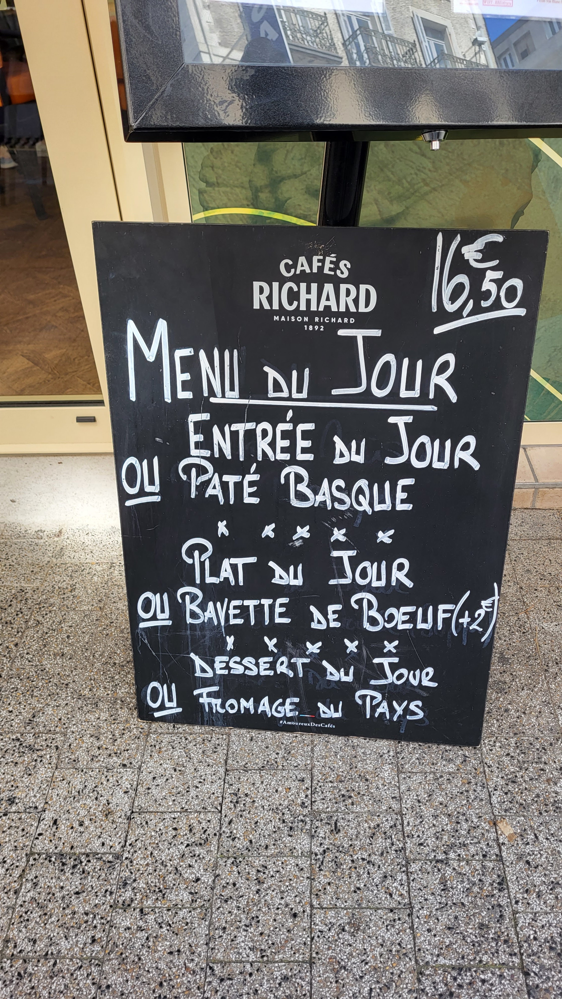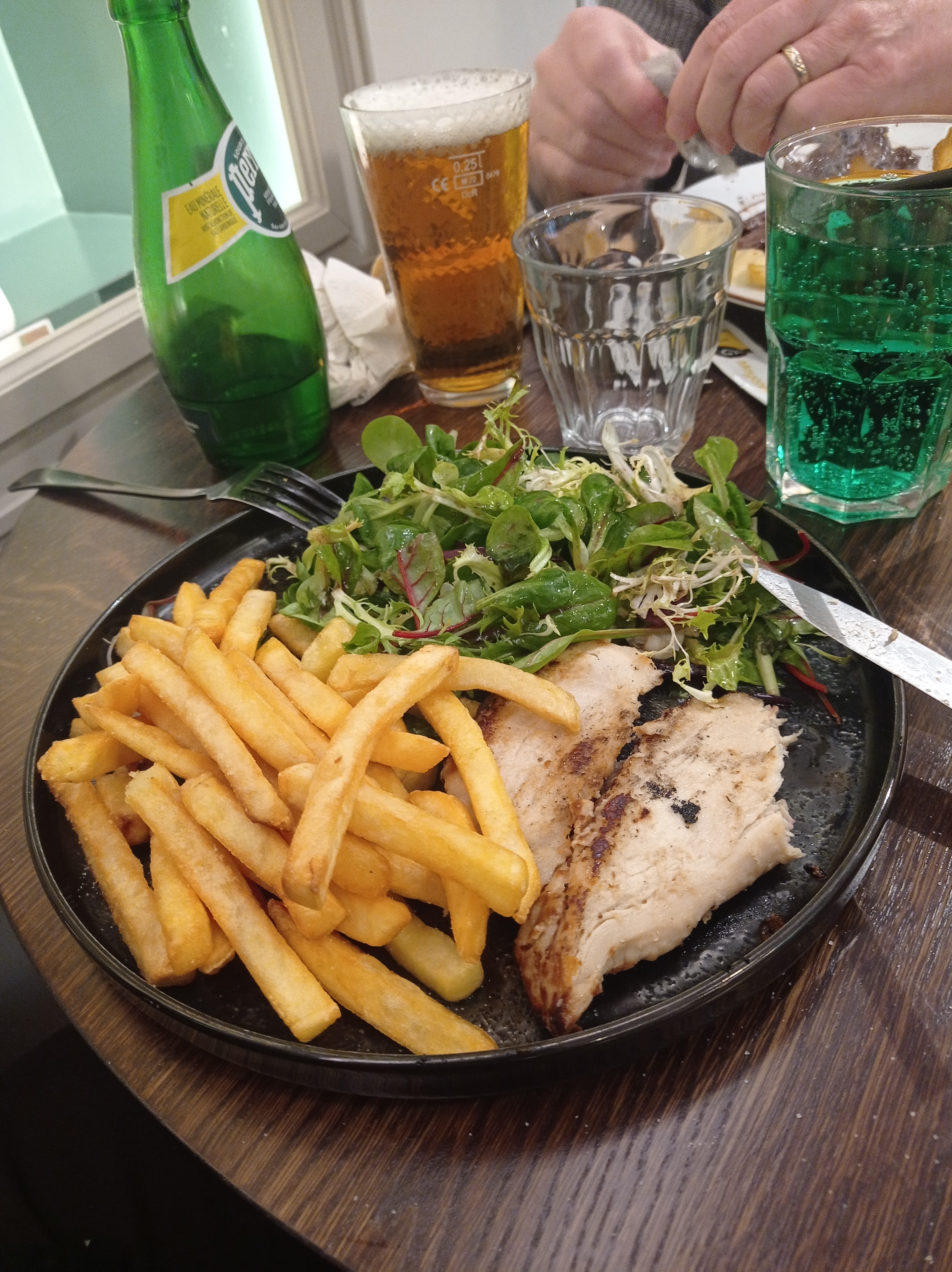 On est rentré pour manger. Avant de passer à table on demande le plat du jour mais il faut s’asseoir pour avoir le détail. Finalement c’est camembert rôti . On part sur la bavette(avec supplément ) mais c’est servi avec frites salade. Bon je ne supporte pas ce qui est frit ( c’est assez frustrant d’ailleurs!) mais je ne peux rien obtenir comme légumes(il y a de la salade c’est pas terrible comme réponse).Finalement on est parti en face! Ils avaient des pommes de terre donc ils m’ont fait une purée.