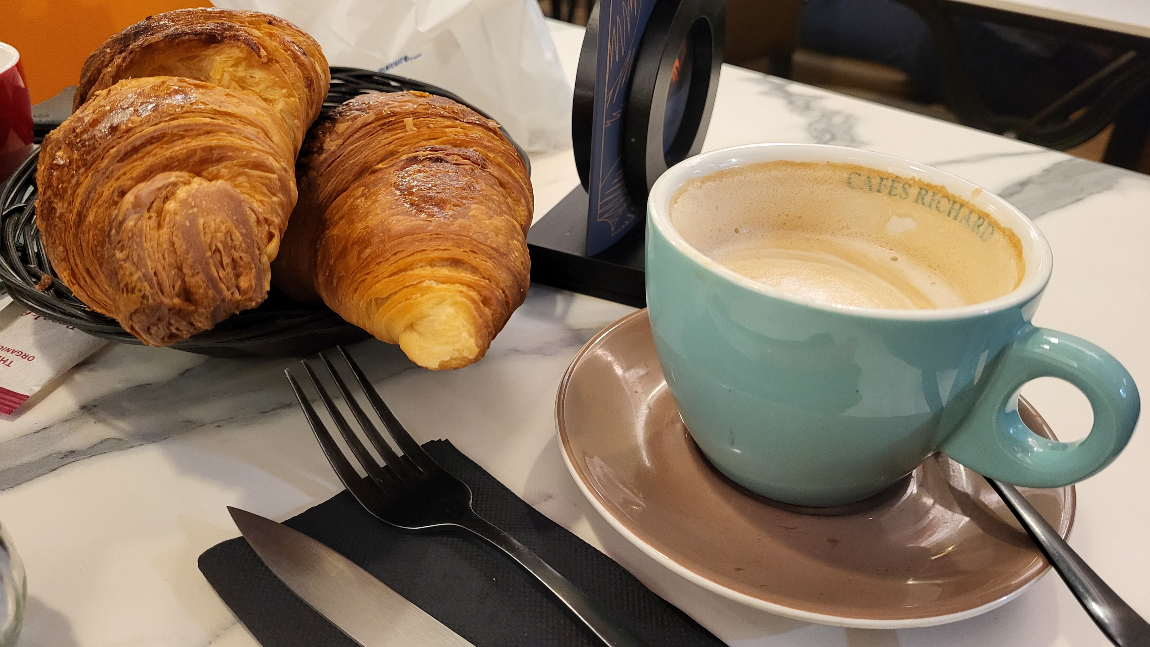 Tellement cher!! Tellement cher !! Nous avons pris deux cafés, un chocolat, un café au lait et j'ai commandé des croassans sans demander de prix.. Il m'a apporté une corbeille à pain avec 4 croassans qui étaient de midi (ils étaient bons).. Mais la surprise, c'est la facture... 24 euros... 24 !!!.. ça n'en valait pas la peine..