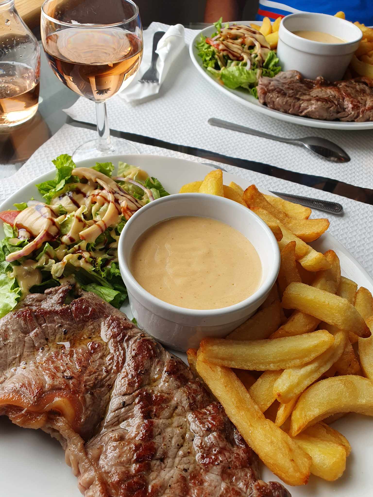 Un peu cher chacun une assiette, steak frites un petit pichet de rosé un café eu un dessert Pas d entrée pas d apéritifs 51 euros