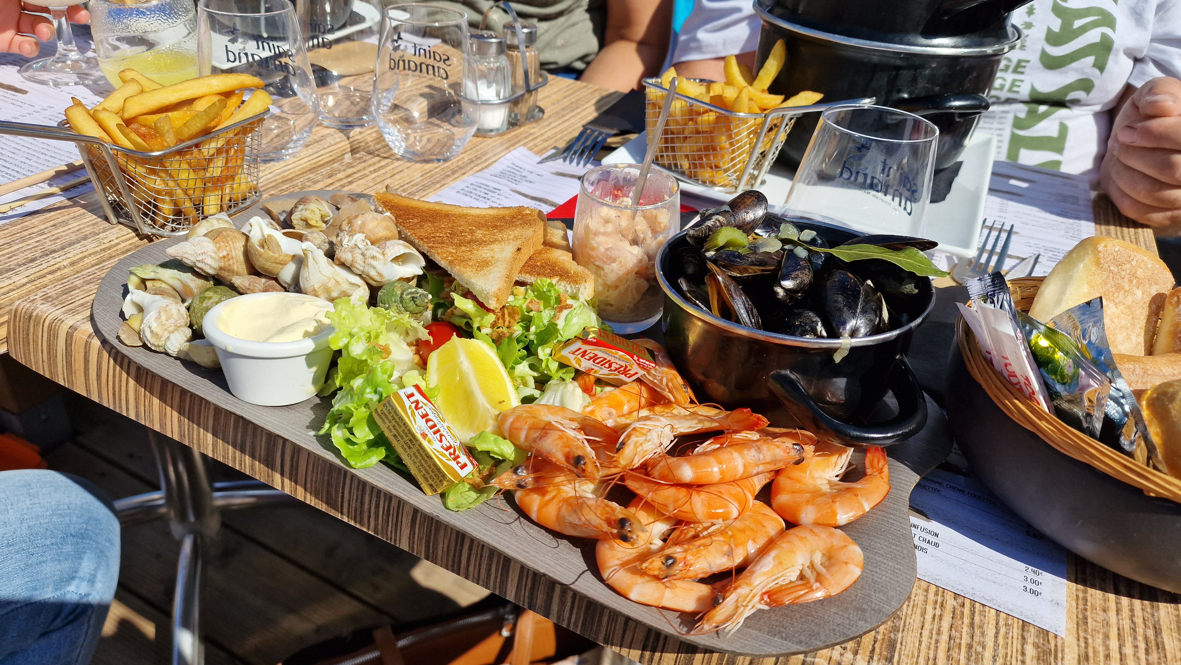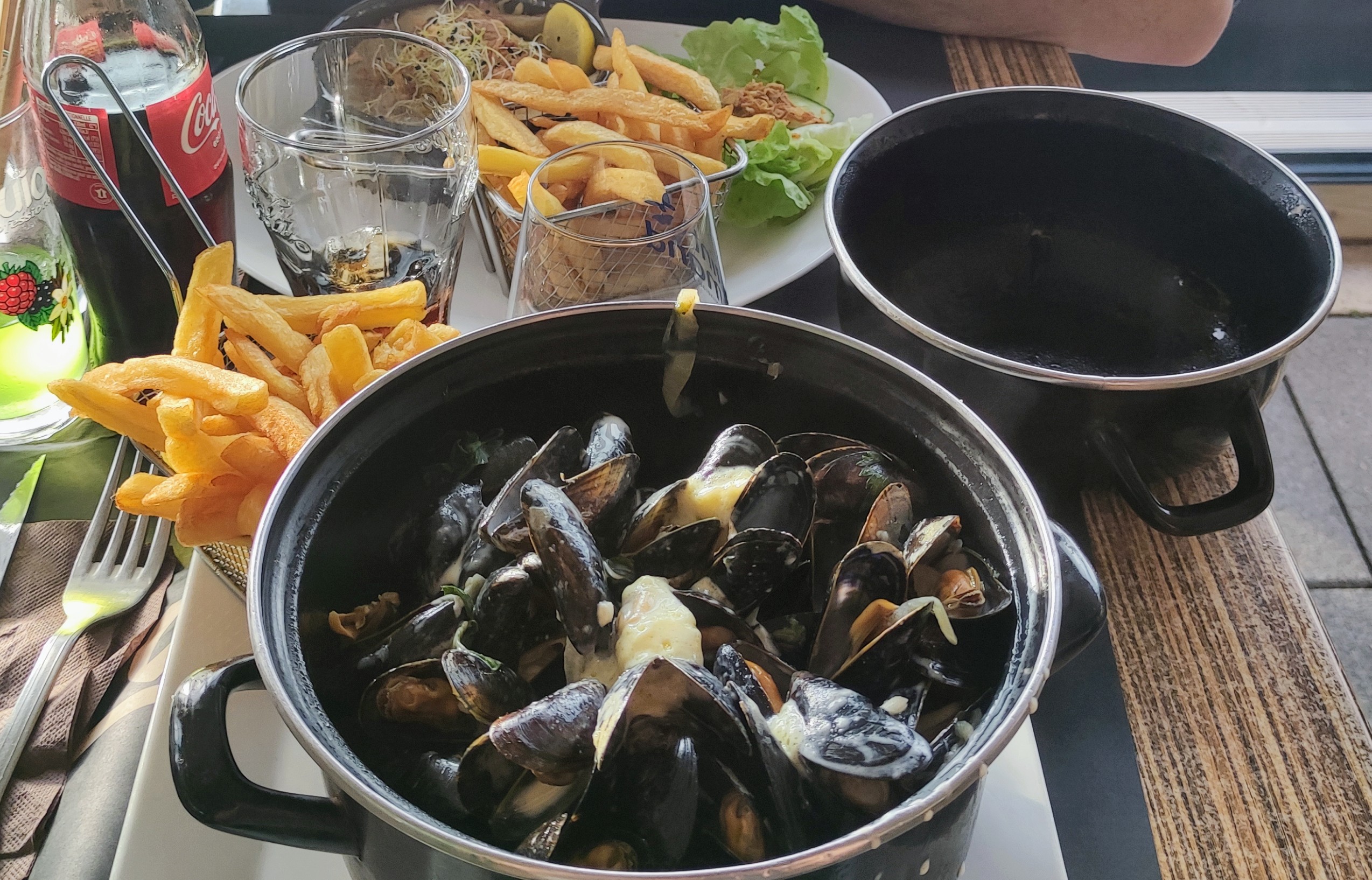 Moules marinières sans sauce, ni échalotes, ni persil et autres .Donc ln les a laissées. Les frites ont été recuites!!Bref pas contents pour plus de 100 Euros.Très decevant.