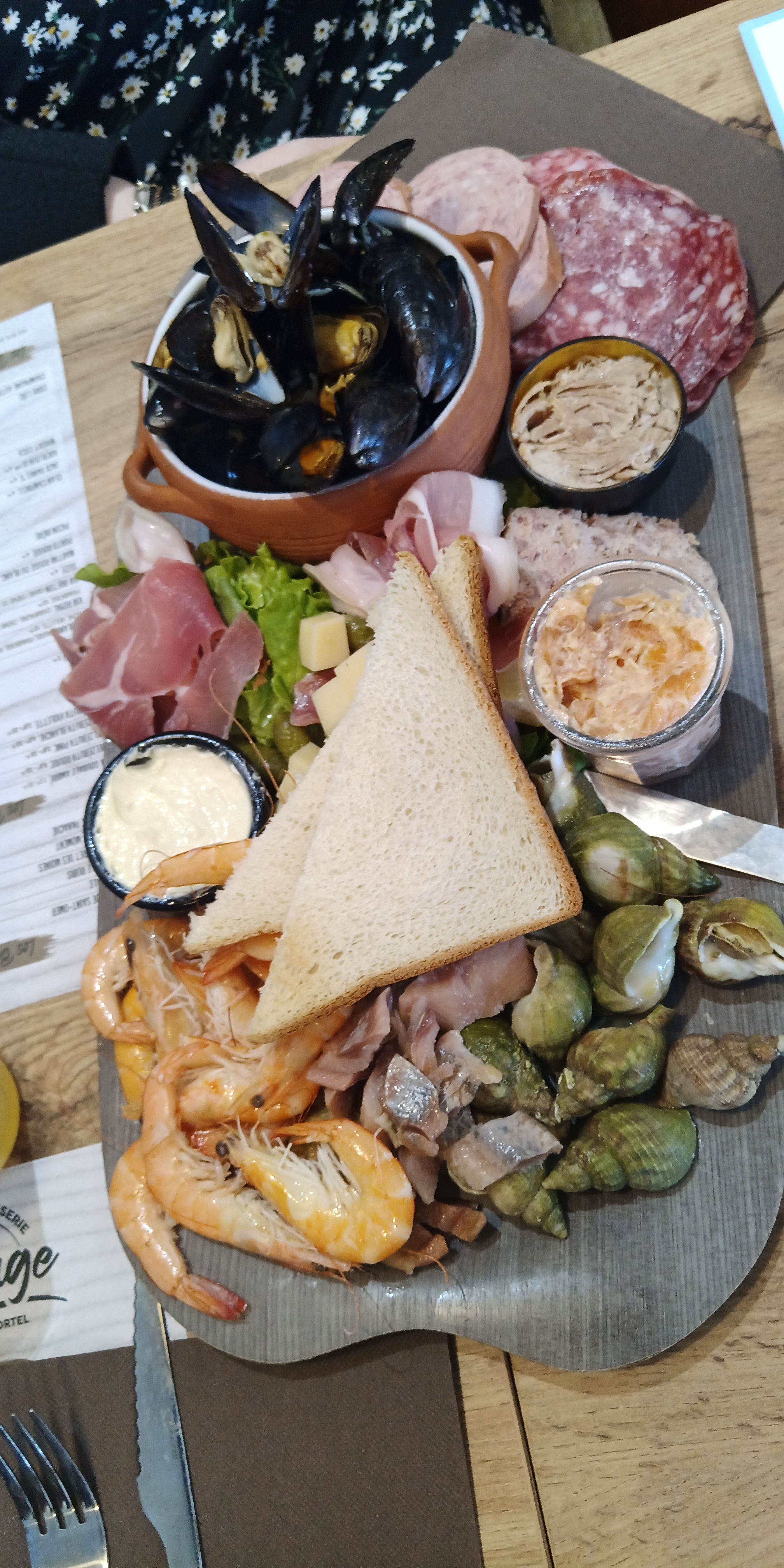 Produits pas frais ( crevettes , bulots...) Plat : très peu mangé car moules de très mauvaise qualité Aucune excuse et aucun geste commercial Dommage car très bon accueil et cadre très sympa Mais le principal c est ce qu il y a dans l assiette ...
