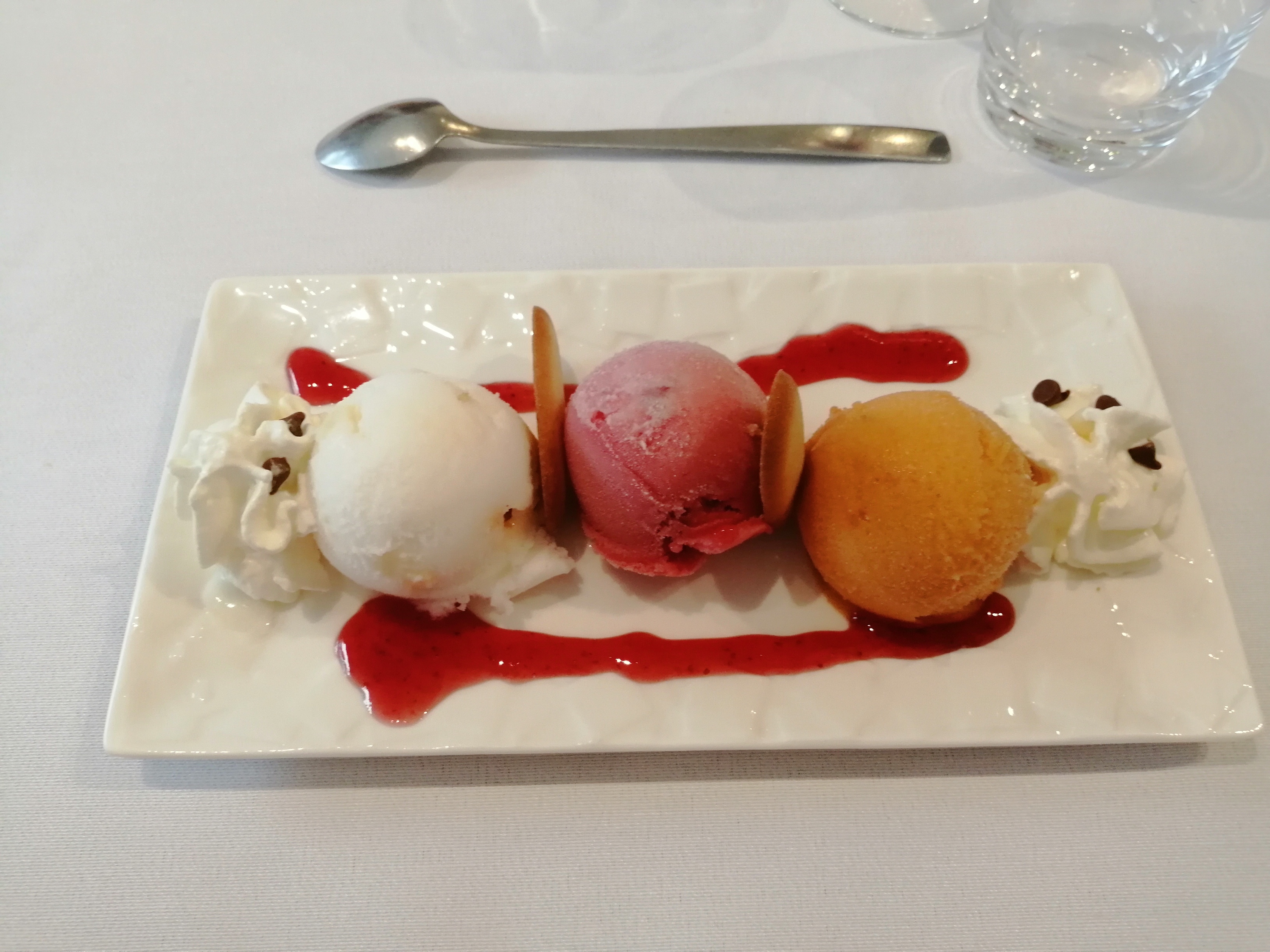 Nous avions commandé à la réservation mais le jour du repas nous n'avons pas eu le dessert désiré, remplacé par une simple tranche de glace. Le poisson était excellent mais le risotto simplement cuit à l'eau. Heureusement le personnel est très sympa.