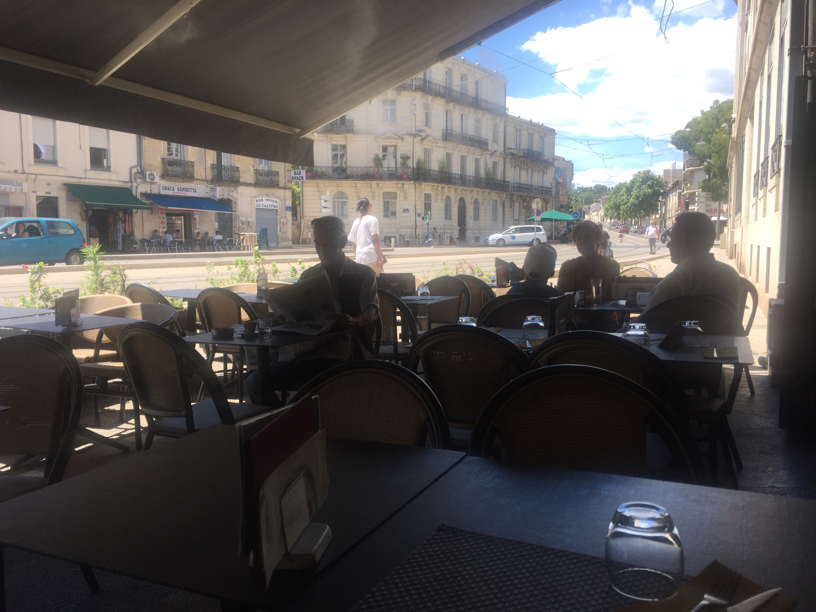 Au soleil, en terrasse, très bon café, loin de la foule et des voitures, à proximité du tribunal, de la gare, service impeccable, rapport qualité prix très correct et un menu alléchant je recommande..