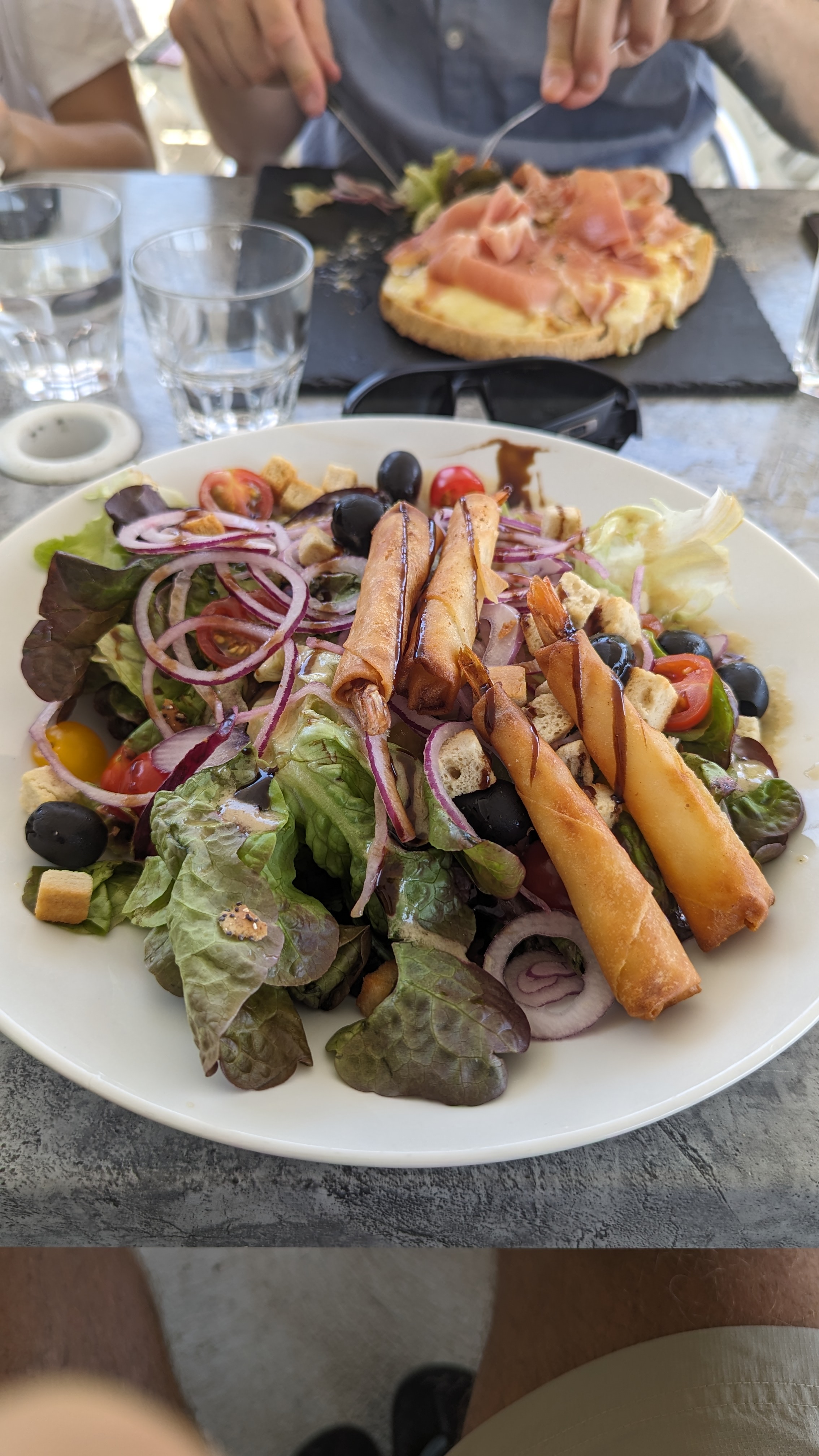 Le brushetas ... très petit pour le prix ... Il ne vaut pas 12euro ... rien à manger.. Organisation ... à revoir ! On a fait jne commande sur place ... on a reçu nos repas dans un carton à emporter sans couvert sans serviettes ....