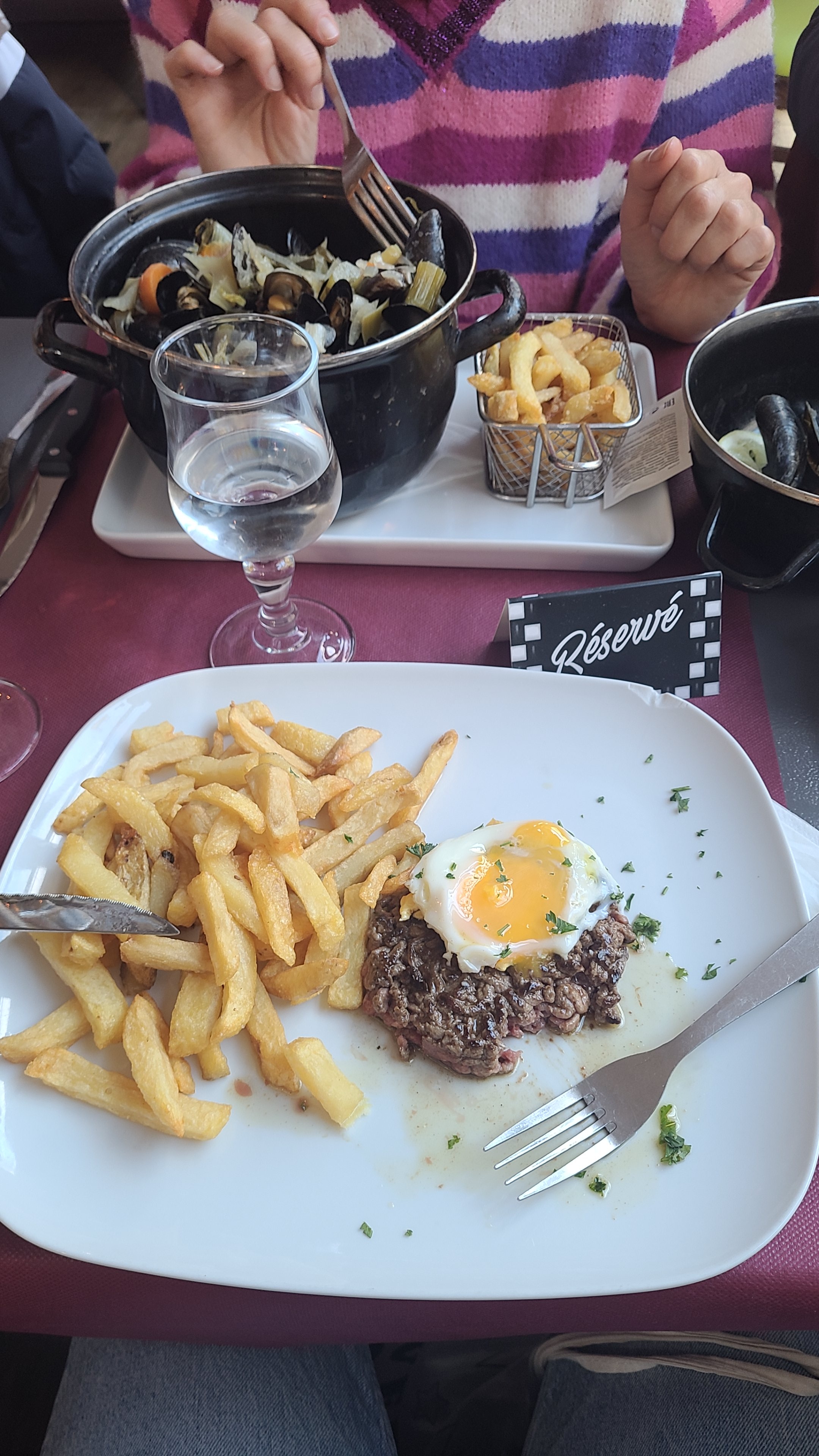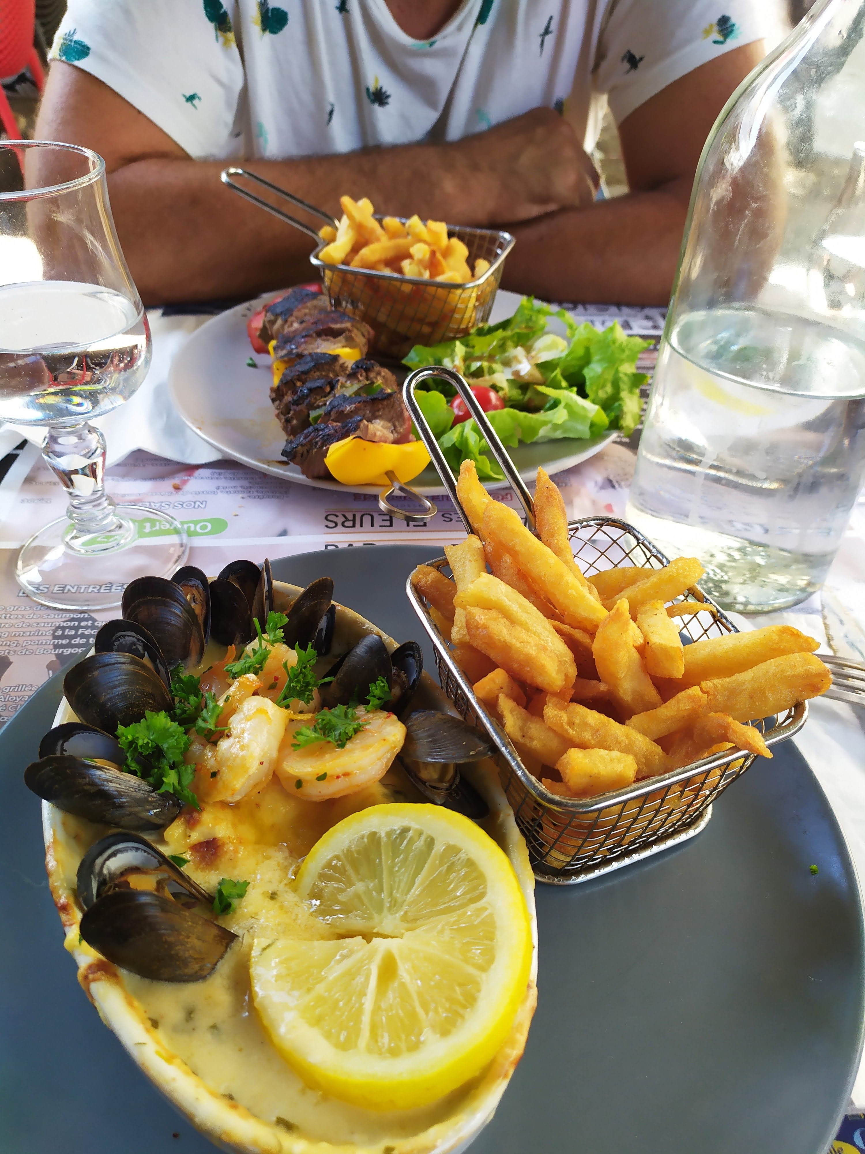 Les entrées et desserts sont corrects et la terrasse agréable mais il y a beaucoup de progrès à faire, tant du point de vue du service que de la cuisine. Bien que l'ayant demandée une deuxième fois pendant notre repas, nous n'avons jamais reçu notre carafe d'eau. Les frites étaient molles, mal cuites et pas salées. Les moules marinières sont à éviter, le fait d'y avoir ajouté des carottes est une très mauvaise idée car elles altèrent considérablement le goût, on a l'impression de manger autre chose.
