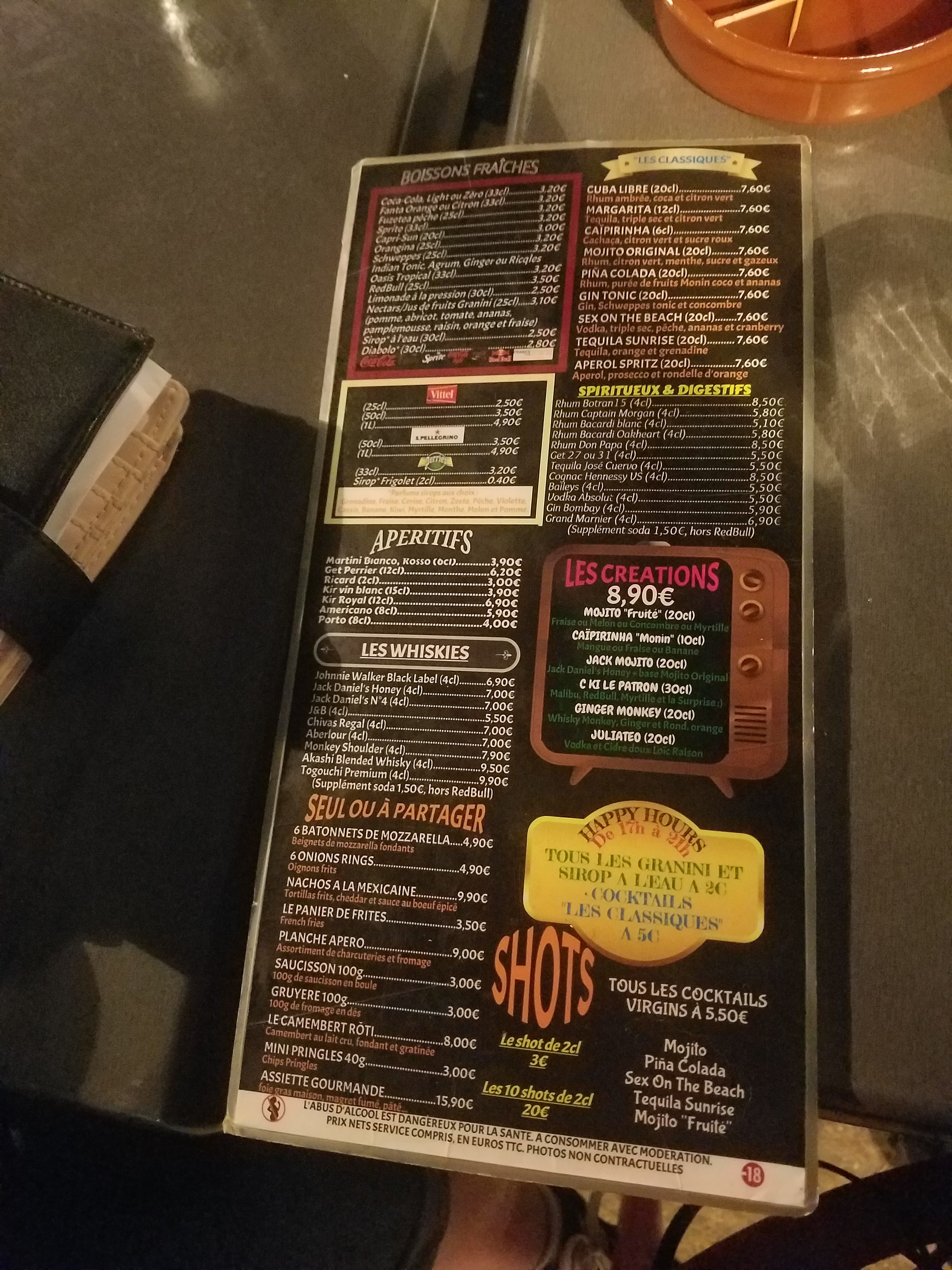 Prix des bières élevé pour ce que c'est! Publicité incitative ( pinte à 6€) sauf qu'en relatité ça ne concernait que les bières prises à l'extérieur. Les desperado selon moi étaient coupé à qlq chose d'autre. Personnel sympa
