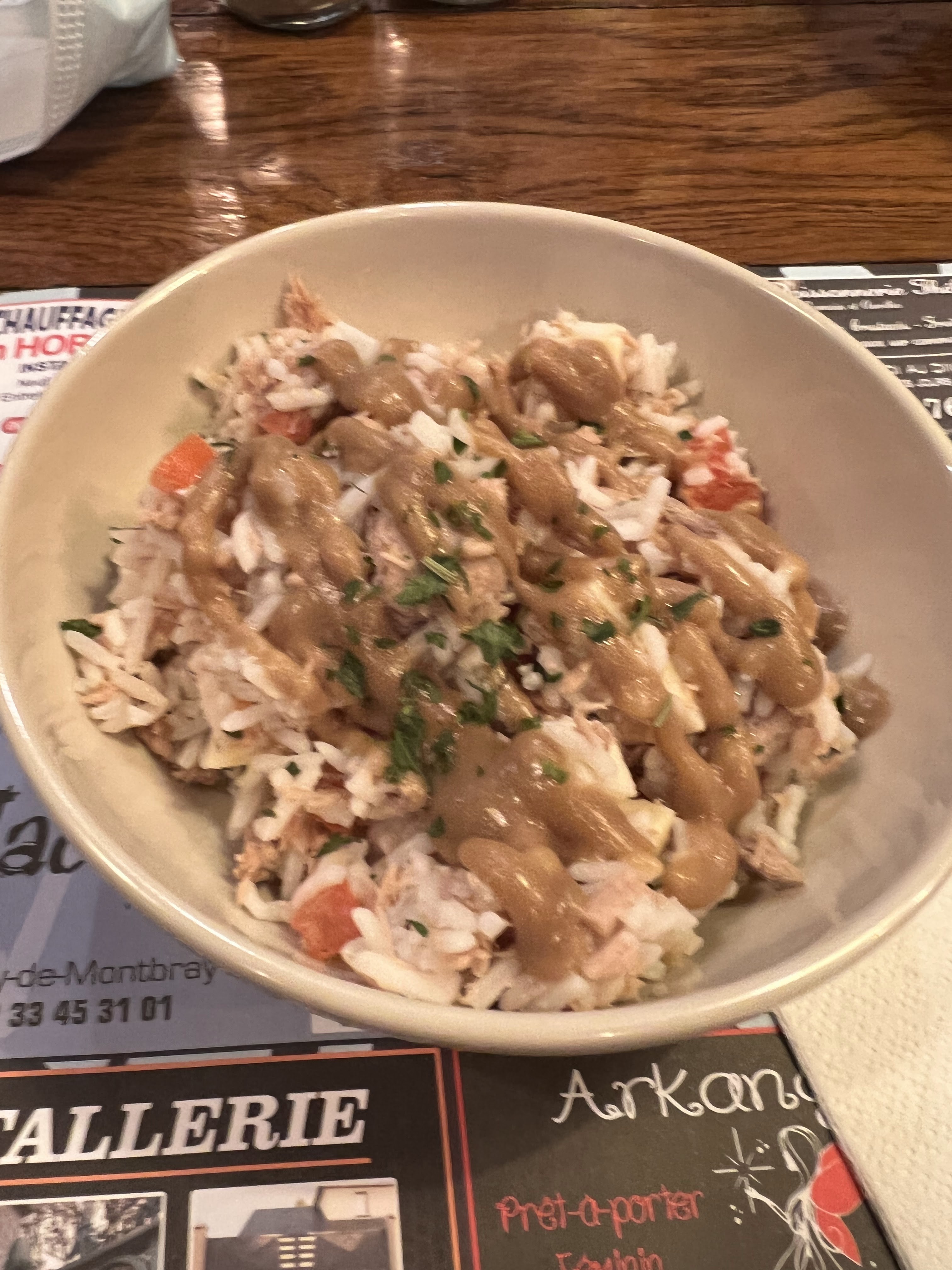 En week-end dans la région j’ai me suis arrêté dans ce bar restaurant pour déjeuner. Pour midi on vous propose une formule à 13,20 € composée d’un menu unique - une entrée, un plat et puis quelques choix de dessert. Lors de ma venue j’ai pu déguster la salade de thon au riz. Pour le plat, j’ai mangé un rôti de porc aux nouilles gratinées avec des légumes. C’était délicieux. Et pour en finir, un simple crème brûlée faisait affaire.