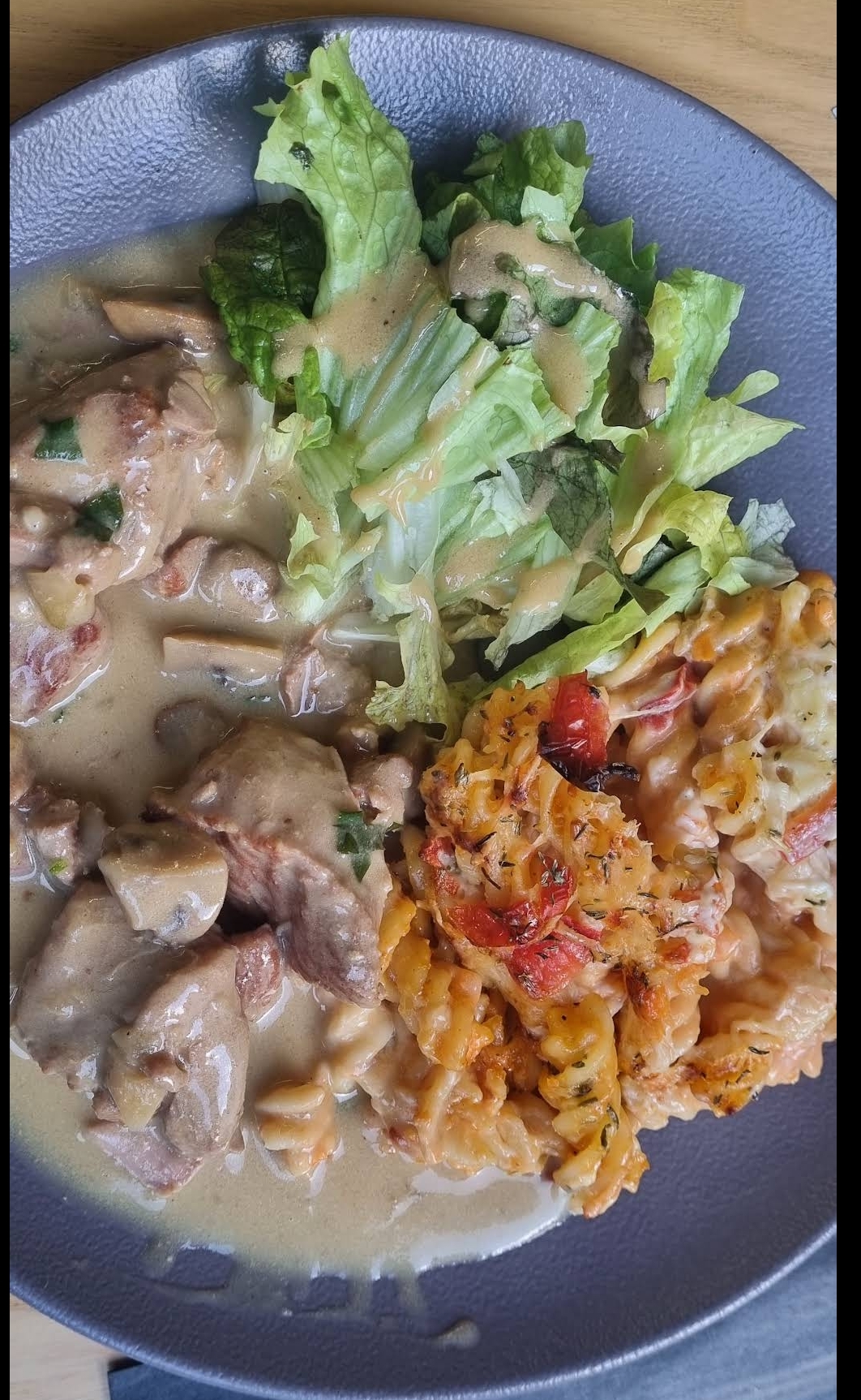 Aujourd'hui, c'était les filets de dinde aux champignons avec son gratin de macaroni. Très bon.