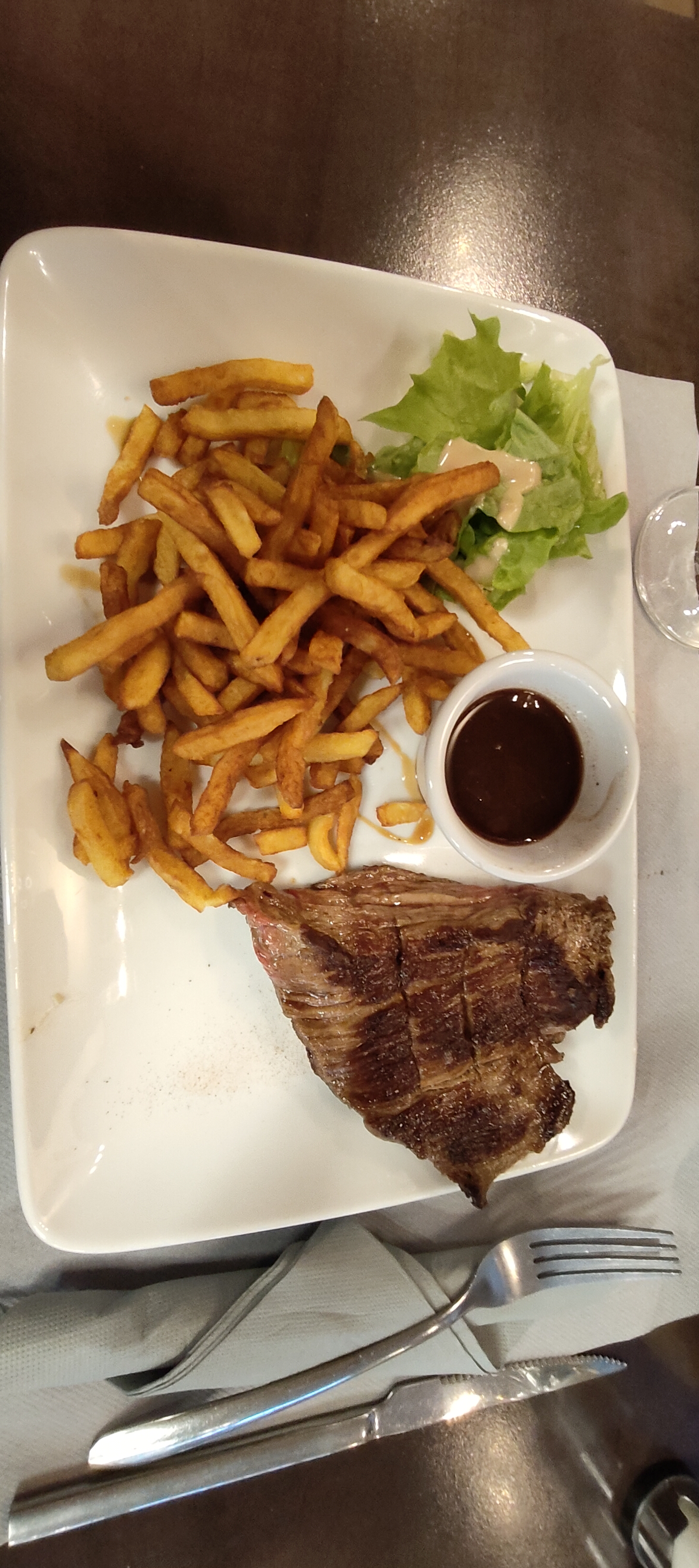 Délicieuse bavette avec frites dégustée avec une bouteille de Bourgogne. A répéter.