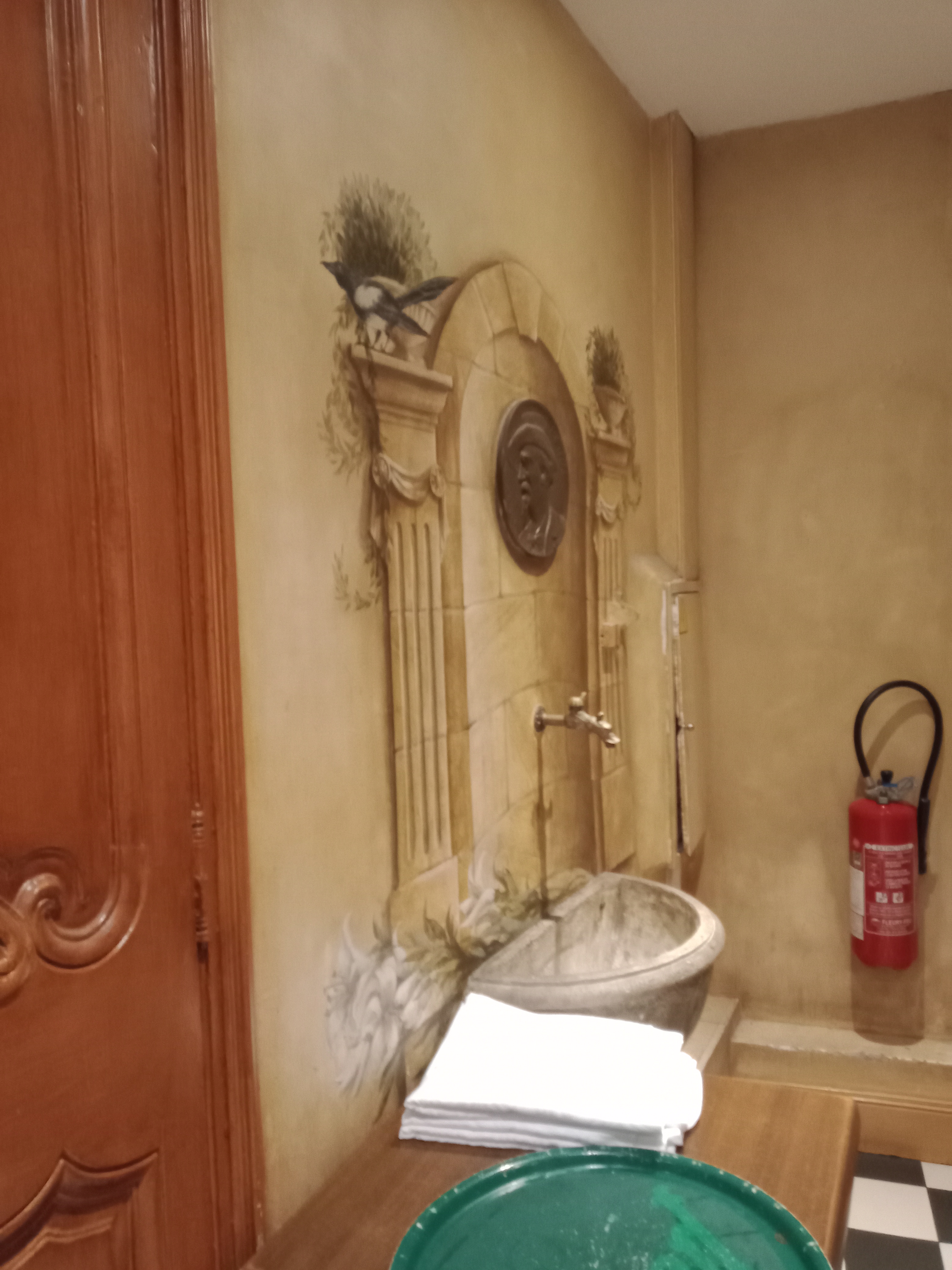 Service efficace. Beaux décors ancien mais le lieu est vieillissant, travaux à prévoir. Les toilettes sont à l'étage et l'escalier en colimaçon est raide et vétuste, étant enceinte j'ai eu du mal. un café court et un café au lait 6€ ça fait cher quand-même.