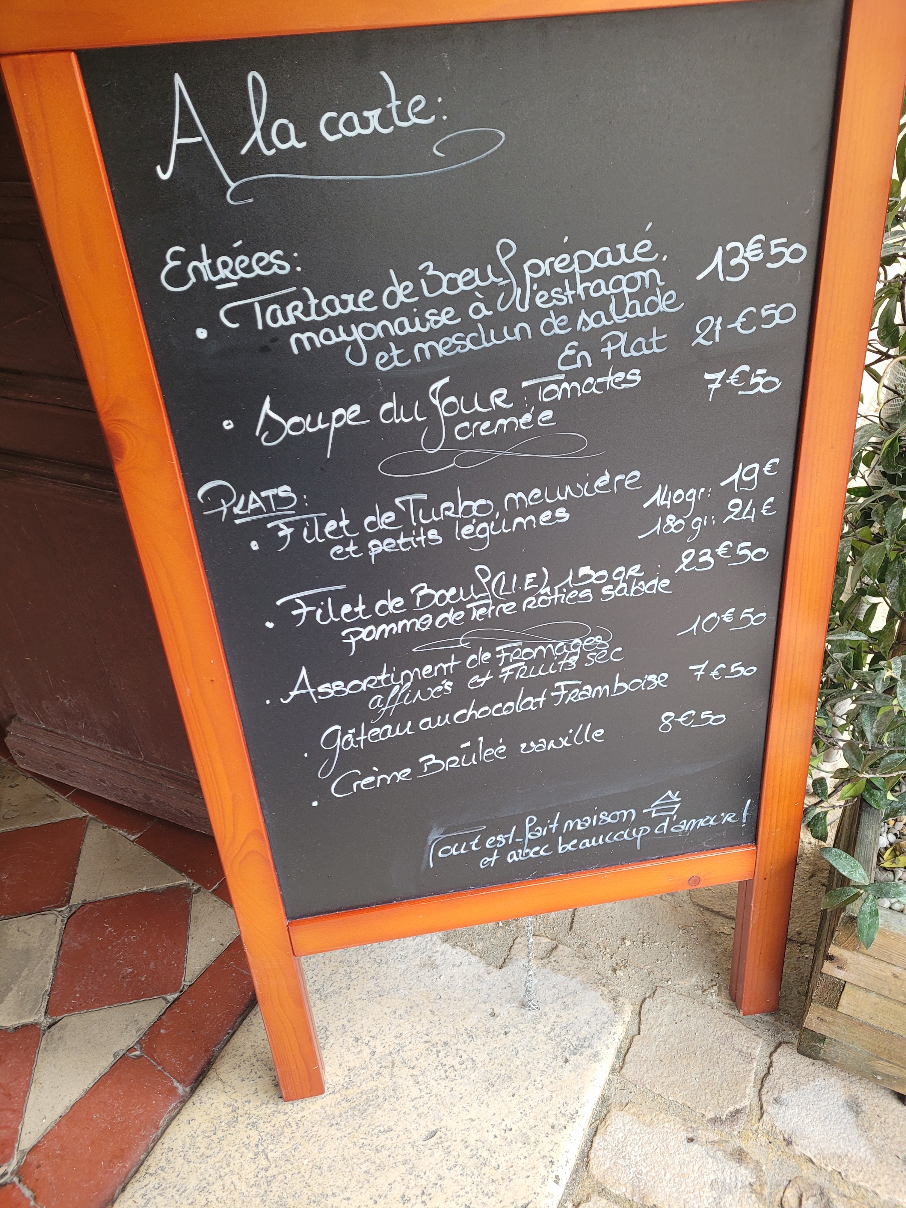 Ce restaurant peut dire merci au cadre du village et à l’absence de concurrence. Nous sommes arrivés à 13h et on nous a dit de revenir à 13h30. À 13h30, de revenir à 14h. Et la nous avons dit non! Nous avons fini par obtenir une table (aucune place dispo ailleurs). Nous avons mis 1h avant d’être servis (avec 2 enfants en bas âge et 4 adultes). L’établissement ne propose que 3 plats et rien pour les enfants nous avons donc demandé une petite portion mais nous n’avons rien eu de tout ça. Les cuissons n’étaient pas celles que nous avions demandées non plus. La portion de tartare en format « plat » était minuscule (il existe un format « entrée » je suis curieux de voir la quantité) mais accompagné de 10 frites (en même temps il fallait de la place pour déposer joliement la mayonnaise « maison ») et le filet de boeuf servi en « paupiette » (donc rien d’un filet n’était pas mieux). Tout ça pour 21 et 23€50 le plat!! Clairement c’est du vol. La bouteille de rosé maison offerte pour faire passer la pilule de l’attente et de l’arnaque n’était pas suffisante! Conseil: Prévoyez des sandwichs ou de réserver ailleurs… Petit bonus: les réponses copiée collée du proprio sur les avis négatifs… fabuleux! Pour résumer, c’est cher et vous repartez la faim au ventre!