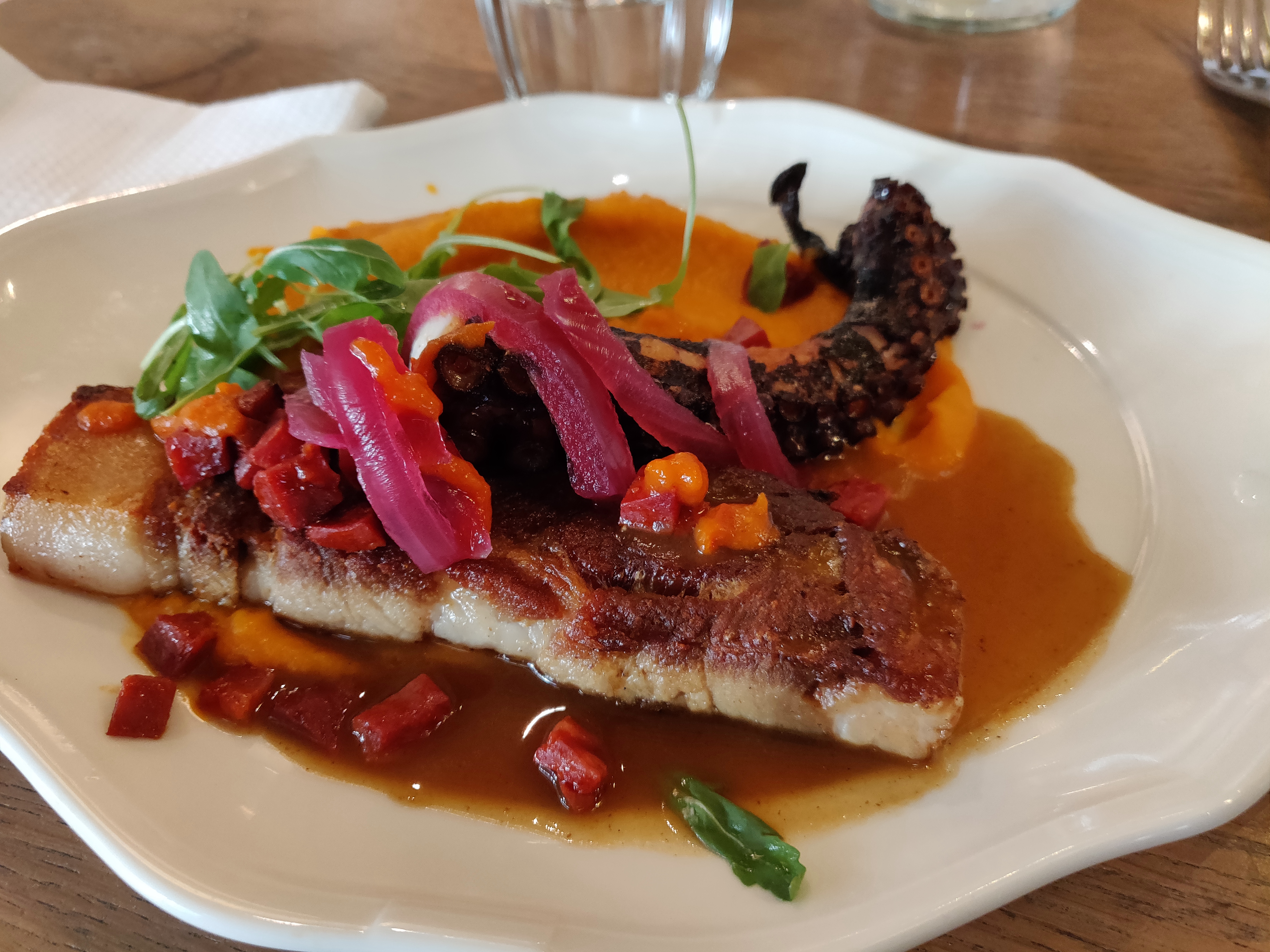 J'ai commandé l'échine de porc et poulpe grillé qui est mis en avant devant le restaurant. C'était excellent. Peut-être que le poulpe devrait être un peu moins grillé, et que la purée de légumes devrait être servi plus chaud ? J'avais un peu peur du dessert du jour qui était une tarte pistache/pomme/fraise, mais c'était très bon! Un peu cher par rapport à mon budget quotidien (limitation de la carte déjeuner) mais la qualité y est!