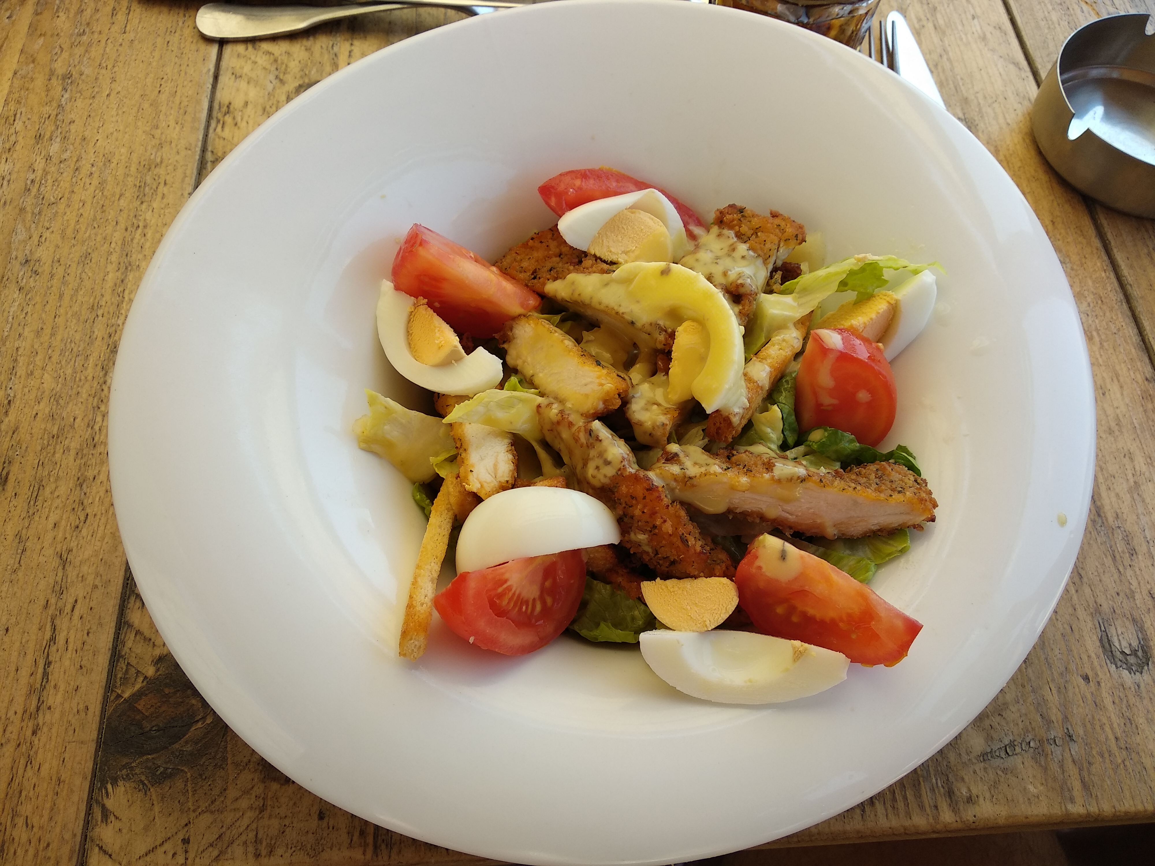 Pas fou.la salade césar composé de salade nature, 3 morceaux de poulet et 3 anchois. Triste.. Service correct. Le minimum. Heureusement il y a vue sur la mer