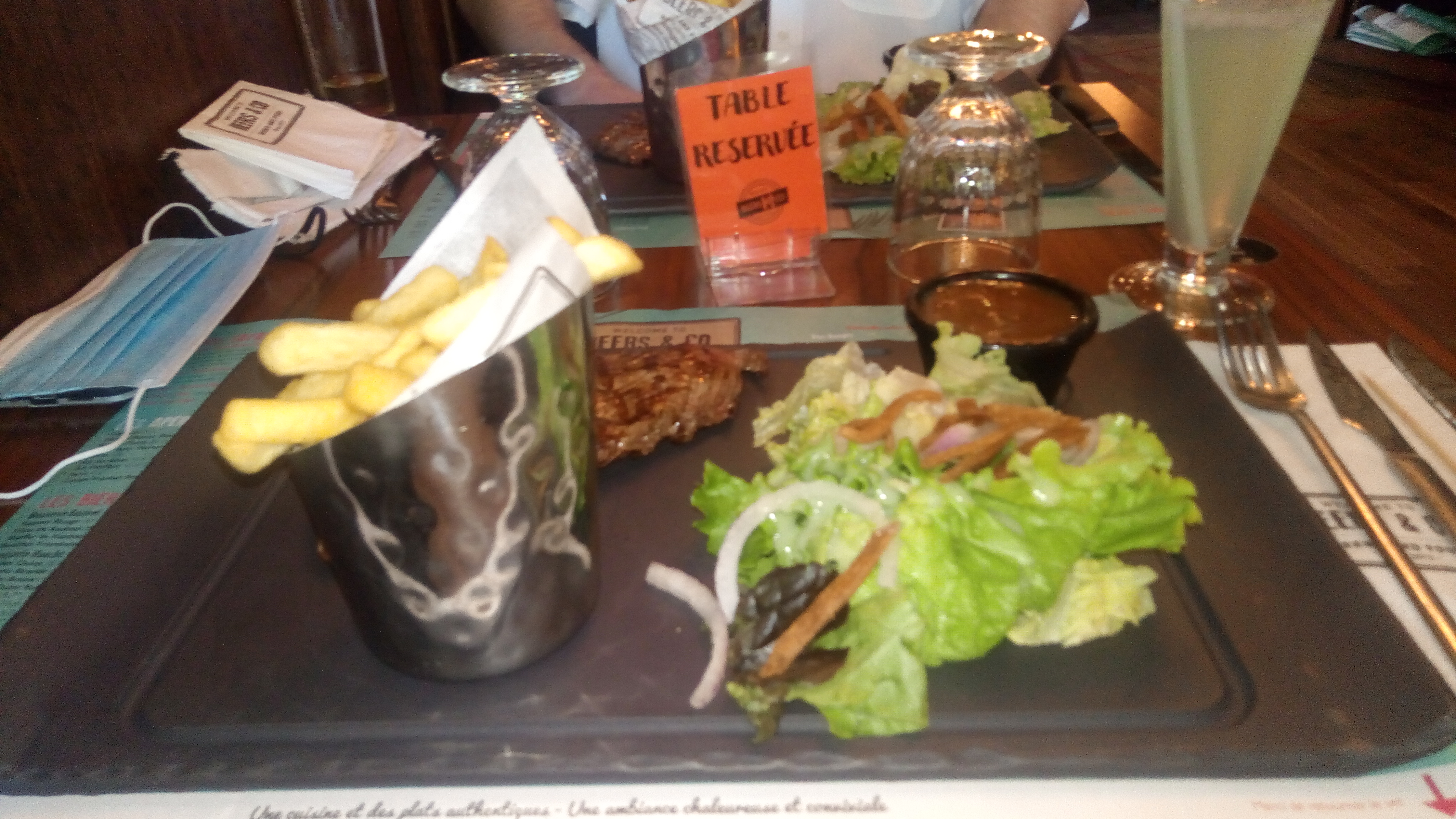 le service est bon ,la quantité dans l'assiette laisse à désirer, une dizaine de frites, un peu salade et une viande qui ne fait surement par le poids indiqué sur la carte , la sauce servie dans un dés a coudre. dommage la déco est sympas ...