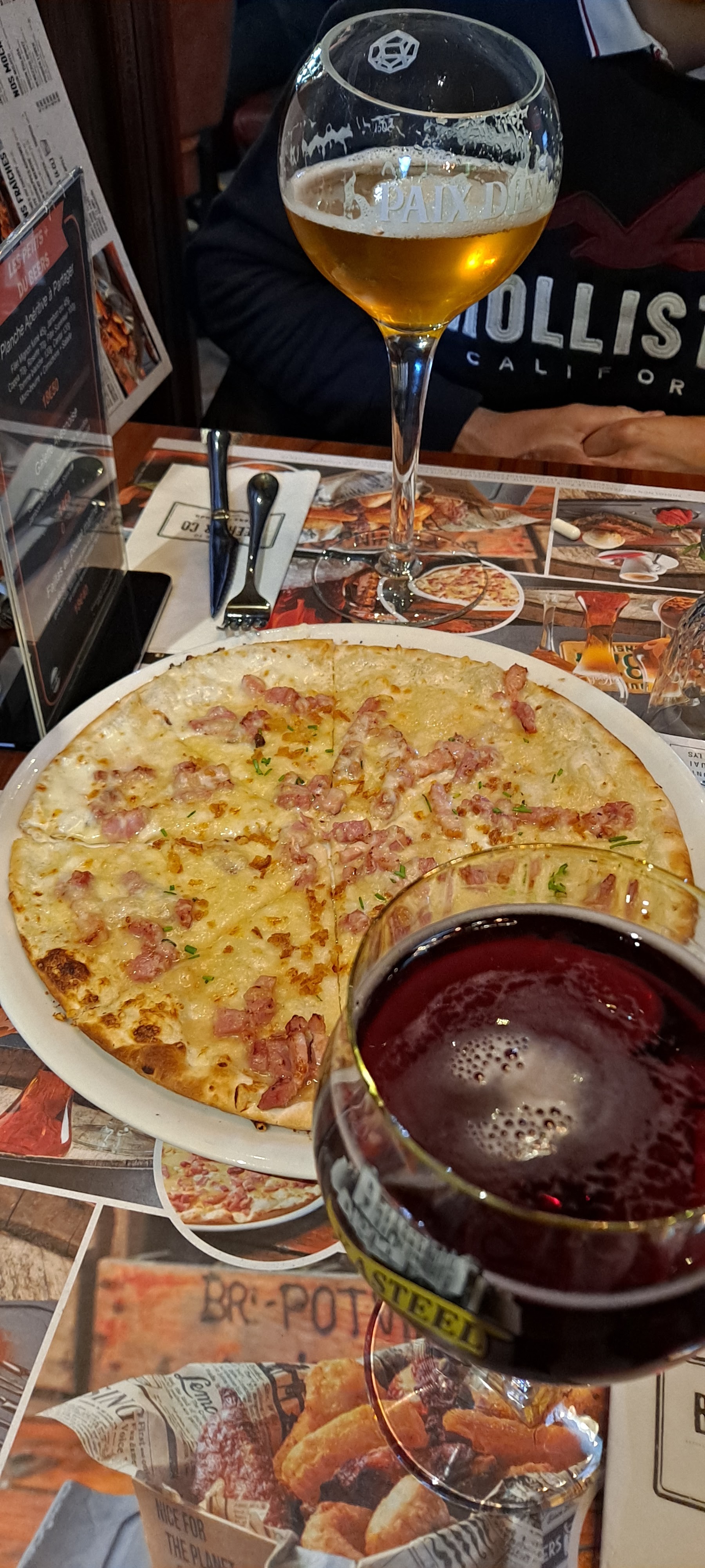 Nous sommes allés pour la première fois dans ce restaurant et avons été satisfaits. Le lieu est agréable avec de la musique d ambiance, les serveurs bien que jeunes, sont très agréables et compétents, le service est plutôt rapide et les plats copieux. Pour moi personnellement, il y a trop de crème dans la flammekuche et les lardons sont vraiment très gras mais c est mon goût personnel. Les desserts sont bien servis mais la crème chantilly est trop tiède. Les prix sont corrects.