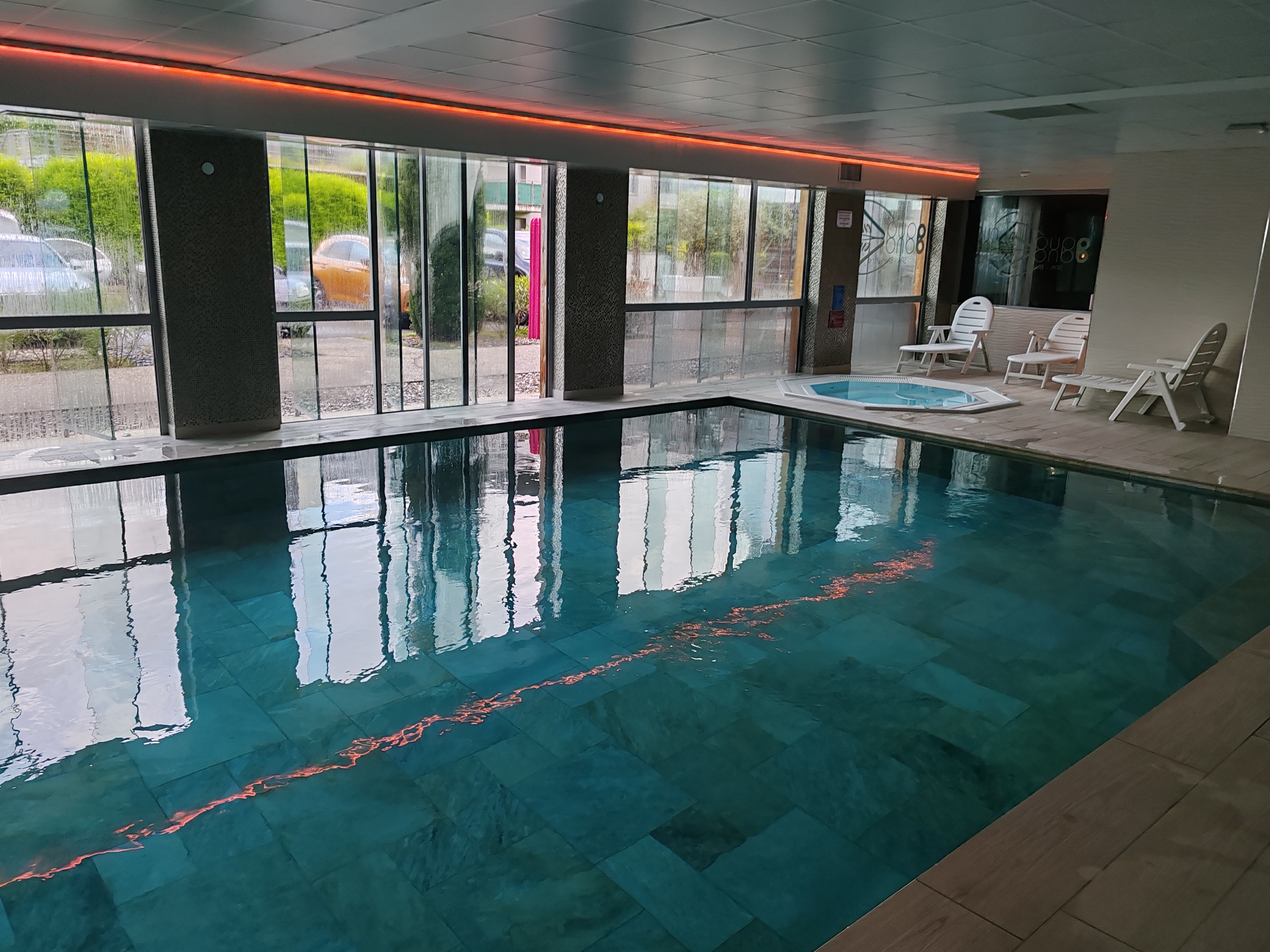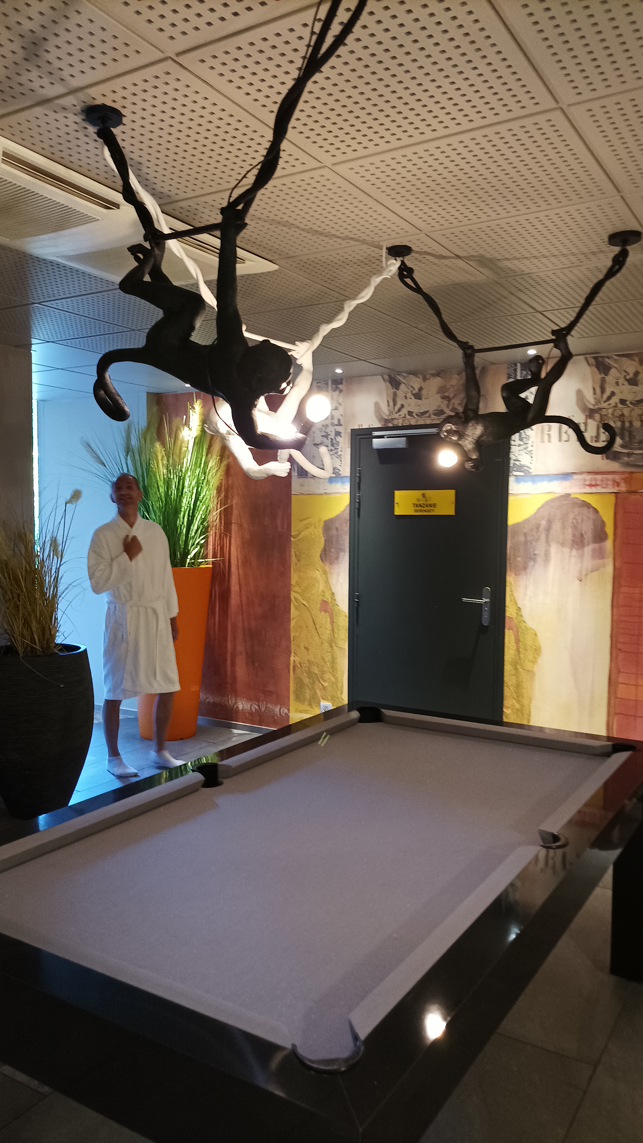 À notre arrivé nous avons été reçu convenablement. La literie de l'hôtel à été confortable. Chambre avec des WC séparés. Le point positif es effectivement la piscine, le spa et le sauna. La piscine commence malheureusement à avoir du vécu mais reste tout à fait agréable pour se détendre. Le sauna a malheureusement son sol abîmé se qui peut crée un inconfort. Mais la détente es comme même présente. 😊 Malheureusement notre chambre avait quelques inconvénients : bac à douche cassé, pas de porte de douche(mais il y avait bien la présence d'un rail), un tongue sous le lit dans ancien occupant, puis une serviette avec des tâches jaunes. L'hôtel à également son bar au niveau de l'accueil qui reste un endroit très agréable. 😊 Et il y a même un billard. Dans l'ensemble l'hôtel est convenable, il pourrait y avoir des amélioration à effectuer au niveau de certains point.