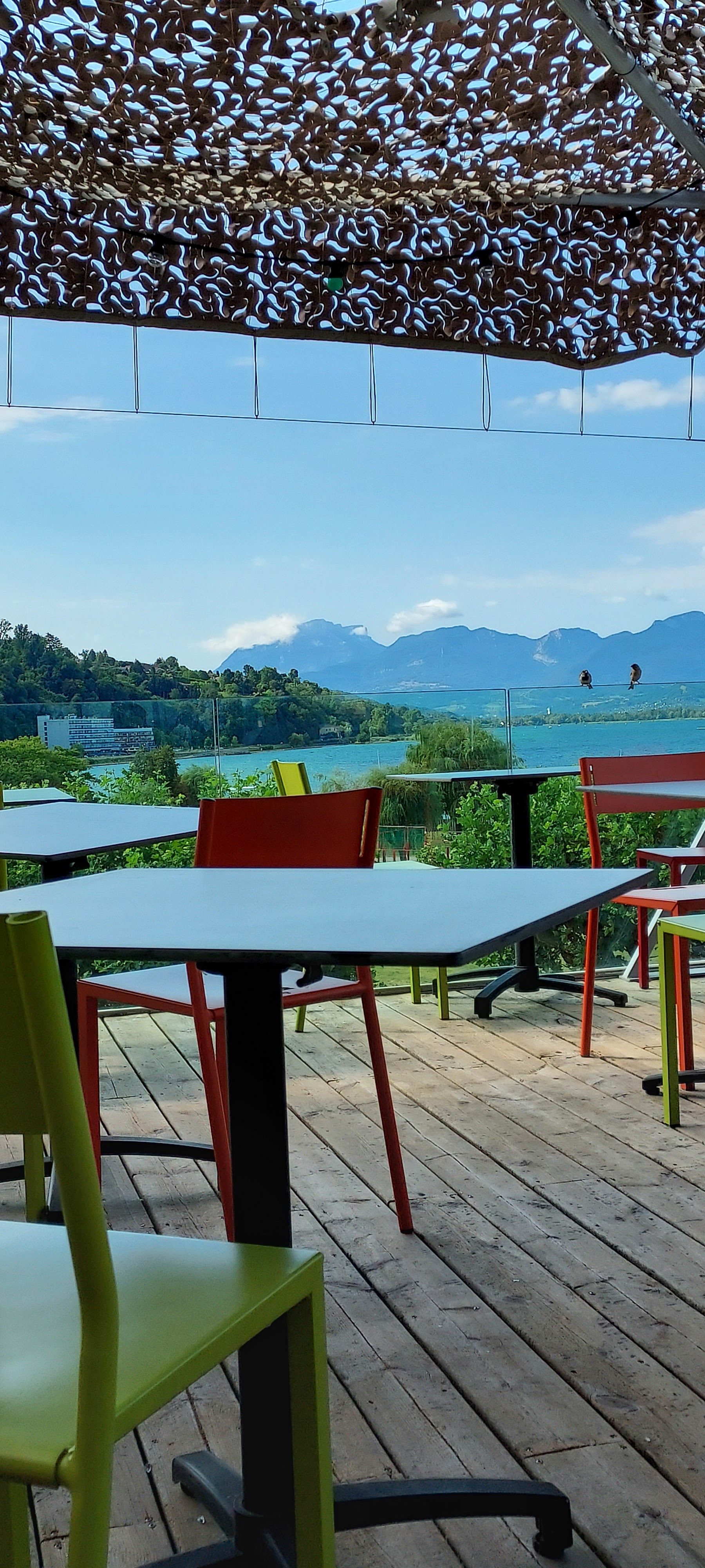 Une nuit passée seulement, si j’avais pu, j’en aurais ajouté une sans hésiter ! L’hôtel est original, la piscine est grande et rafraîchissante, le personnel est très sympa, c’était un moment vraiment relaxant, on a pu vraiment se détendre. La localisation est top près du lac et malgré le monde au lac, en patientant quelques minutes, on trouve une place pour se garer, les possibilités sont présentes. Le vrai plus est la vue du restaurant, hyper belle le matin pour le petit-déjeuner ! Et la borne d’arcade aussi !! Merci !