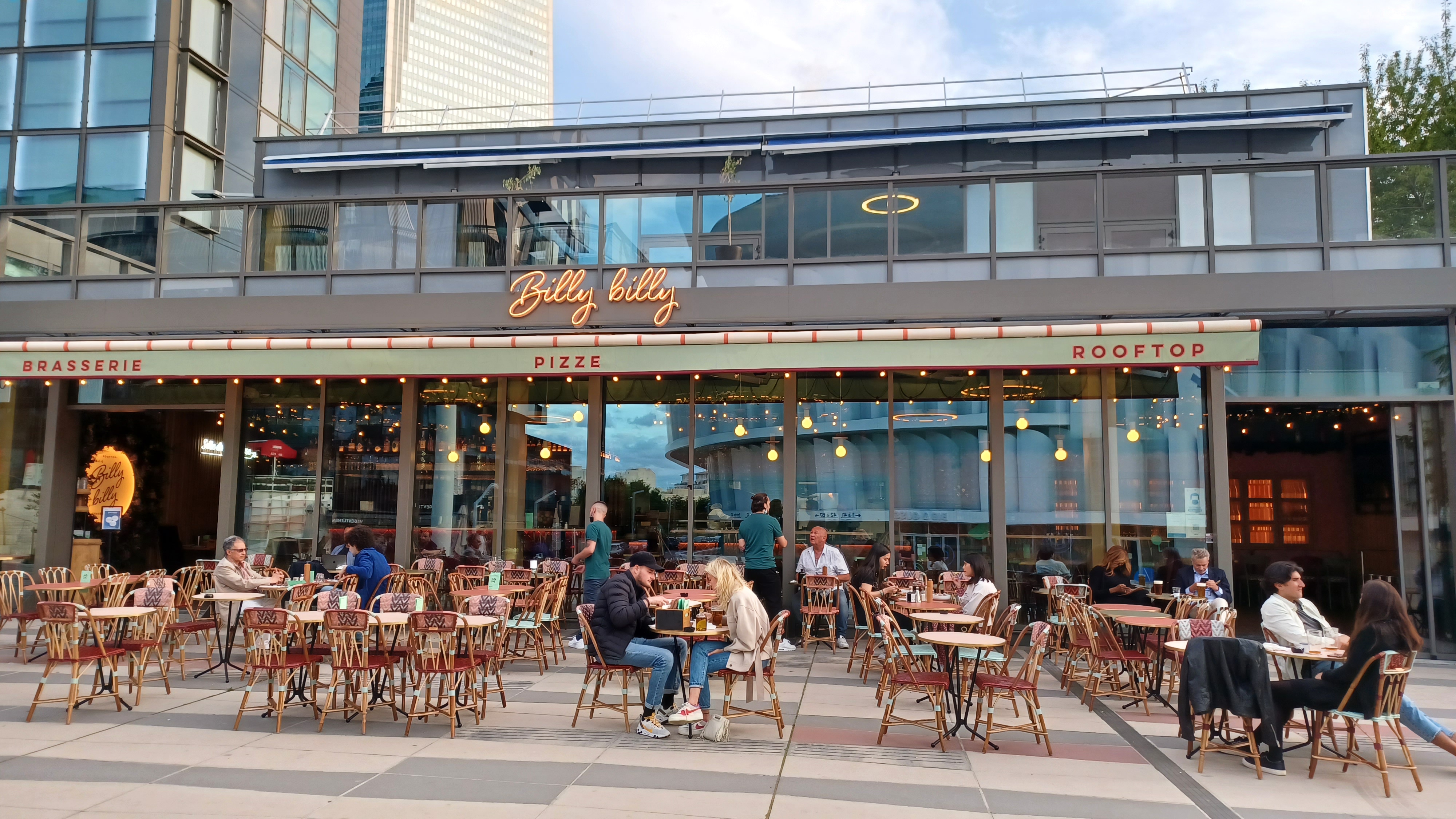 Situé en face de la Paris Défense Arena, le Billy Billy propose un cadre varié et relativement grand. Juger plutôt : un espace au rez-de-chaussée relativement vaste et un premier niveau qui jouxte ce qui est présenté comme un roof top (en hiver, on parlera plutôt d'une terrasse fermée réchauffée par des chauffages de au plafond de type lampe). Et ça marche, en plein mois de janvier, arrivé en grosse doudoune, on finit par déjeuner enbras de chemise vu la température qui règne sur cette terrasse 😃. Côté assiette, pas mal de salades, encore plus de pizzas, et quelques plats de viandes et poissons (j'ai notamment vu du poulpe). Je me suis laissé tenter par une valeur sûre, une 4 fromages, et je n'ai pas été déçu. Pâte légèrement croustillante et garniture correcte (ni trop, ni trop peu). Une bonne expérience. Un point de vigilance : la réservation impérative car l'endroit est couru.